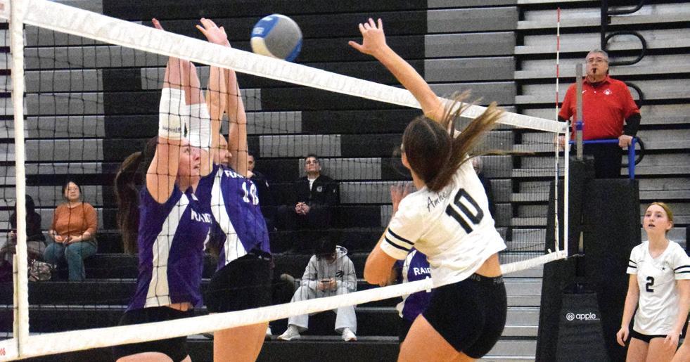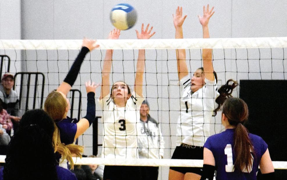 North Star’s Mya Bezzoubkin (10) hits the ball over the net during Feb. 3 action in Amherstburg. The Wolves beat Assumption in three straight sets in the regular season finale.