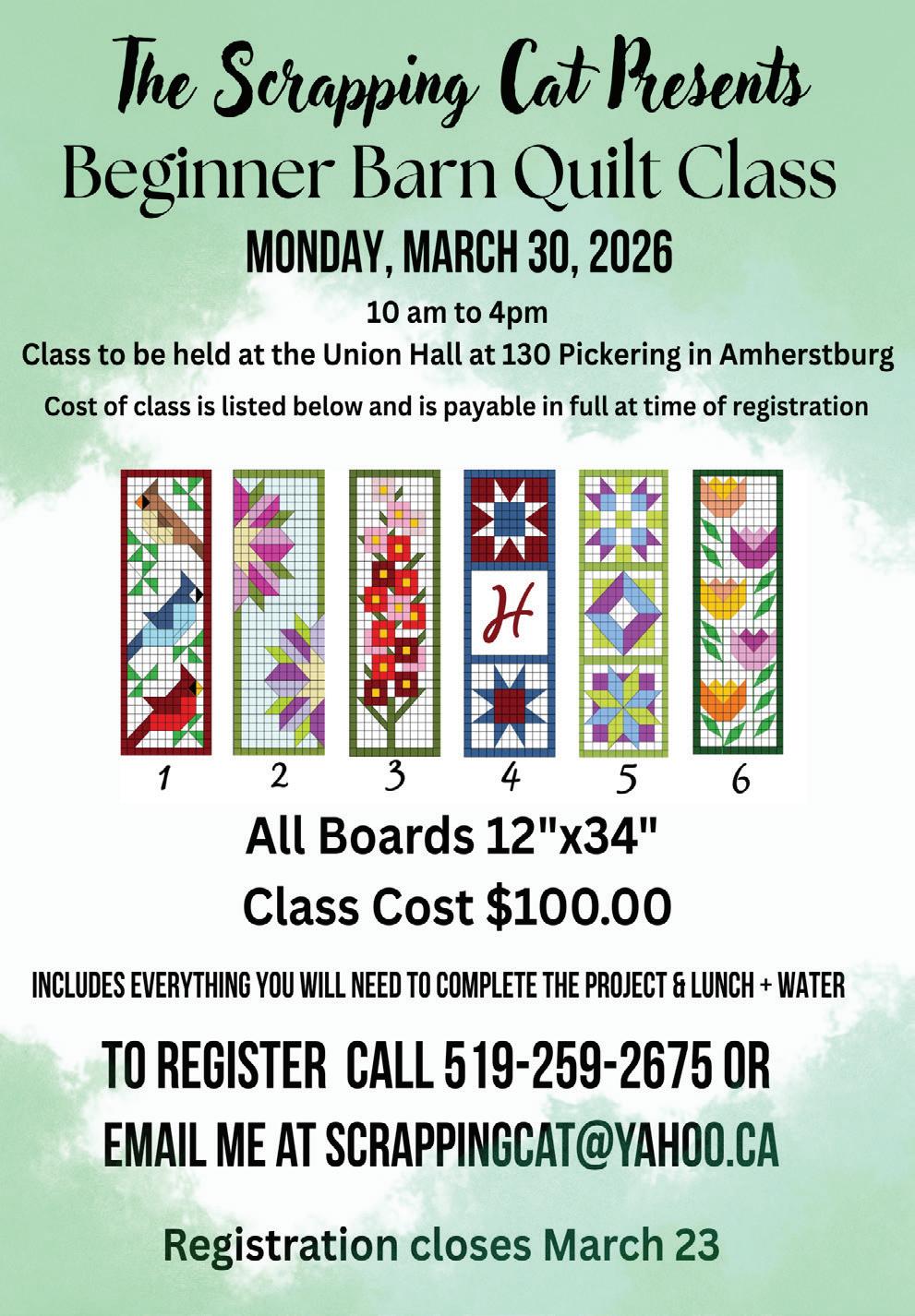 QUILT GUILD MEETINGS; The Erie Shores Quilt Guild invites guests/new members to attend monthly meeting held every third Tuesday at St. John’s Hall, 1782 Oriole Park, North Woodslee. Doors open at 6:30 p.m., meeting starts at 7 p.m. Our purpose is to promote and encourage the art of quilting in Essex County. 519-726-5869.