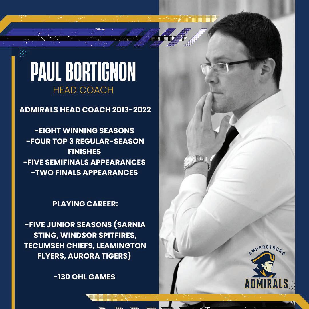 From 2013 to 2022, Bortignon, an Amherstburg resident, was the head coach of the Admirals and in his time as the bench boss had eight winning seasons and got the locals to the division final twice.