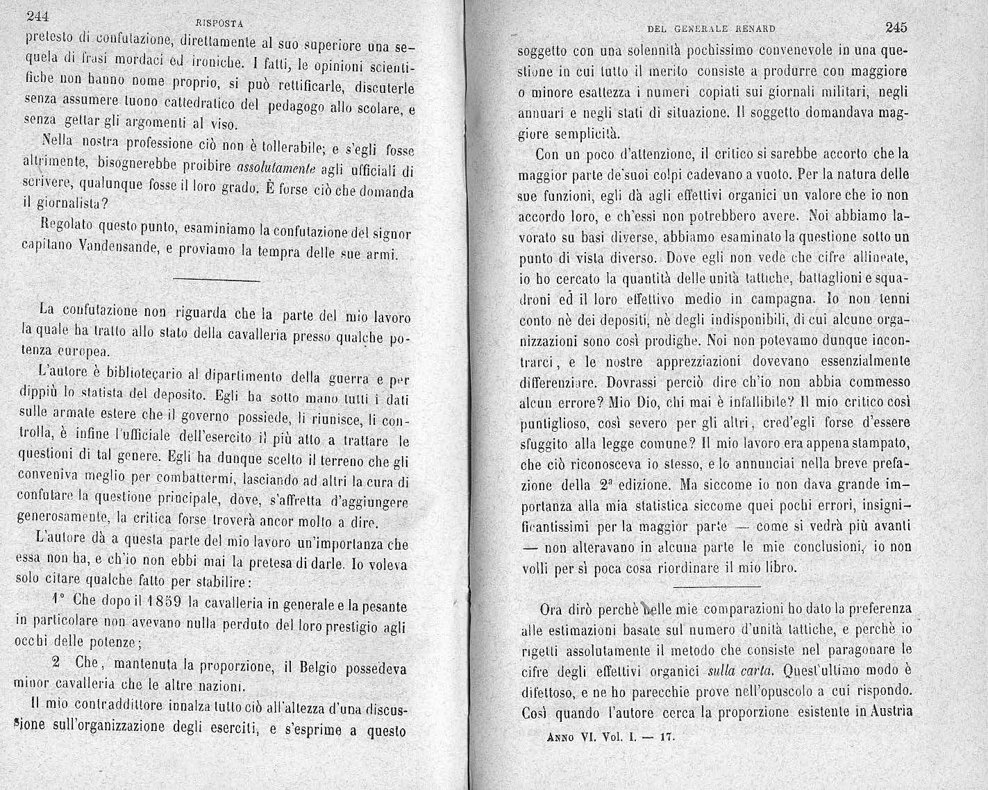In quauto poi a ll e _ca ric ~ie ra den ti, d i cui pa r ~a l ' articolo in d is corso · esse non m er i tano seri a consi der az io ne; e se taluna - v olta p ~ttl!'ono r i uscire nell e guerre deH 'i rnpéro (e cònJessi a m o l a nos t m ignora n za di n on avern e cioè mai ud ito parlare ne ll a s t oria d i quel le guerre), c ièJ fu s ol à m e nte p e r l a ' novità de ll a cosa e cout ro tl'up pe ben poco agguerrite . « S i ca mmina a mano des tra, ad 1 o zm rli d is t anza ( be n i n t eso sfilando per un o) e si concep-isco (s ic) che il · fante, n o n potendo far ·u so del suo· (uoco e pochi ssi mo dell a' sua baio nettci per parare le s c ia bolate, s i a u cc is o o fer it o senza p o t e r fare graò ~a le al cava lie re slanciato alla carr ie r a . -o Noi inve ce concepfo·cno t utto il co ntrario . Sàrà forse di fe tt o d'i nt el li genza, ma non sappiamo. cap i re che cosa possa ' im pe di re a\ fa n te d i prima l'iga di piantare la propria baione t ta n el ventre de l cavallo ehe gli sfila d'innanzi, parandosi la sci abÒ lata n e ll o stesso meutré col calcio de l suo fuci le ; ch e ccis a poS5a - i mped ire alla , seconda. riga di fa r fuoco a bru c ia- pe lo n e l fianco d e i cav a li e ri, come nep pure sapp iàrn intendere in qual mod o , co sì s ciabolan'do alla s fu ggit a, possa la cavall eria r iuscire a sfondare u n quadrato od una l'inea di bartaglia; e v orre mmo pùr veder e, per san are là rÌ'os t ra incredulità , co m e pot r e bbe una ' ta l car ica continuare a lloraquando ·tre o quattro cavalli, fatti cadaveri, i ngo mbrassero la v ia a ll o sfi la men to Chi ud o no l'a r ticofo alcune brev i ssi me pa r ~le sull'ar ti glieria , di cui le . sper ieuze a l campo furono- <lirette dai g e n e rali L e•
