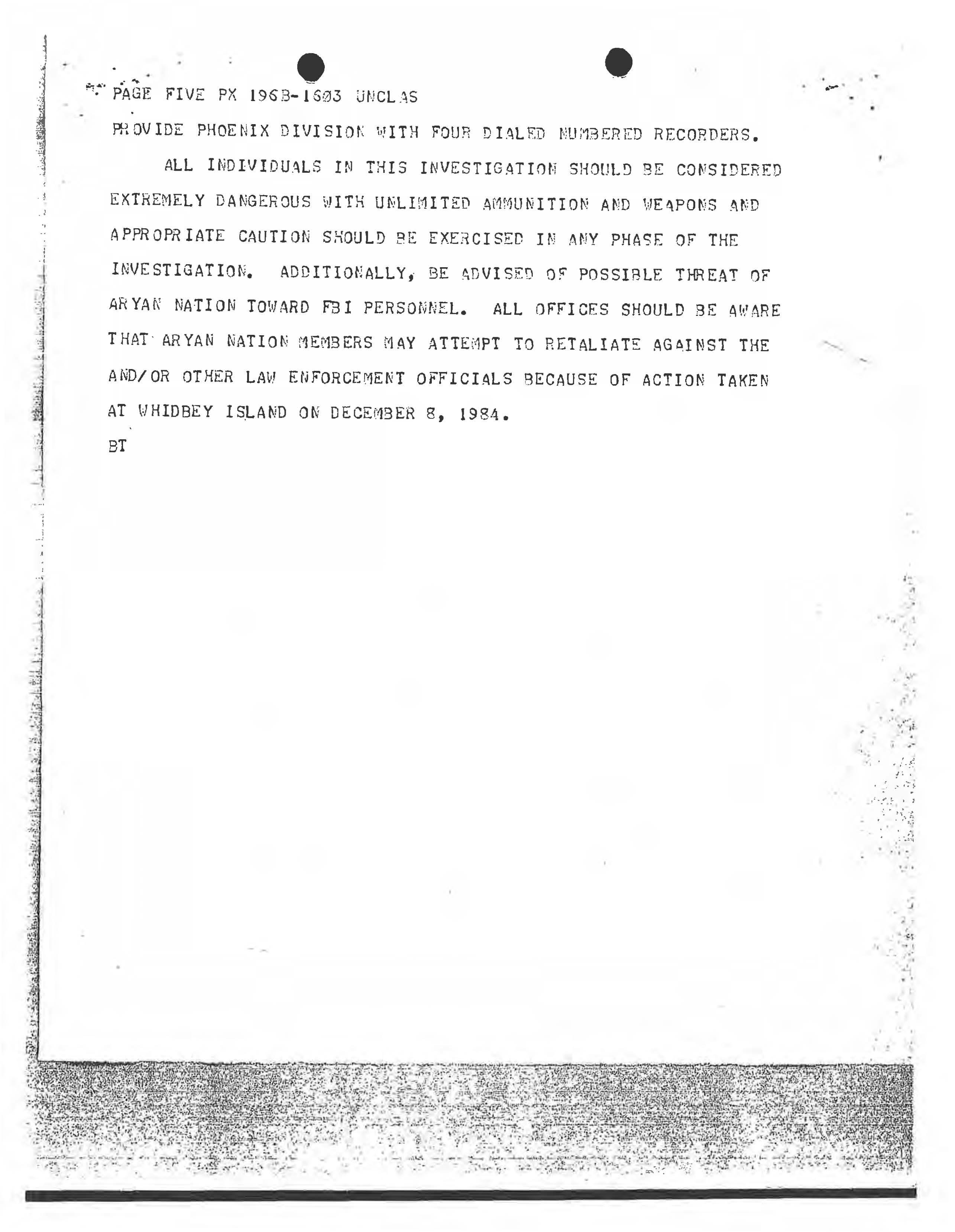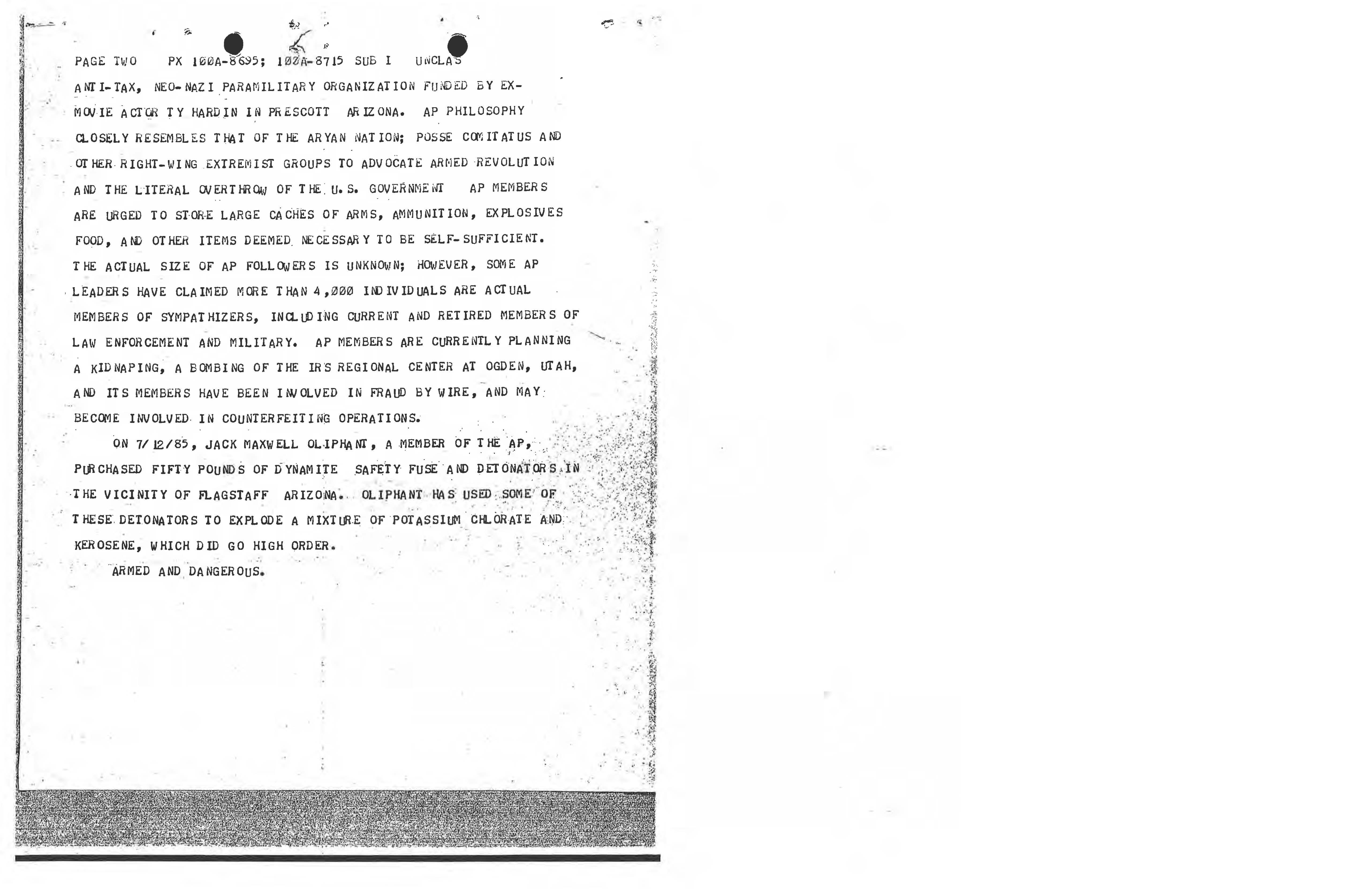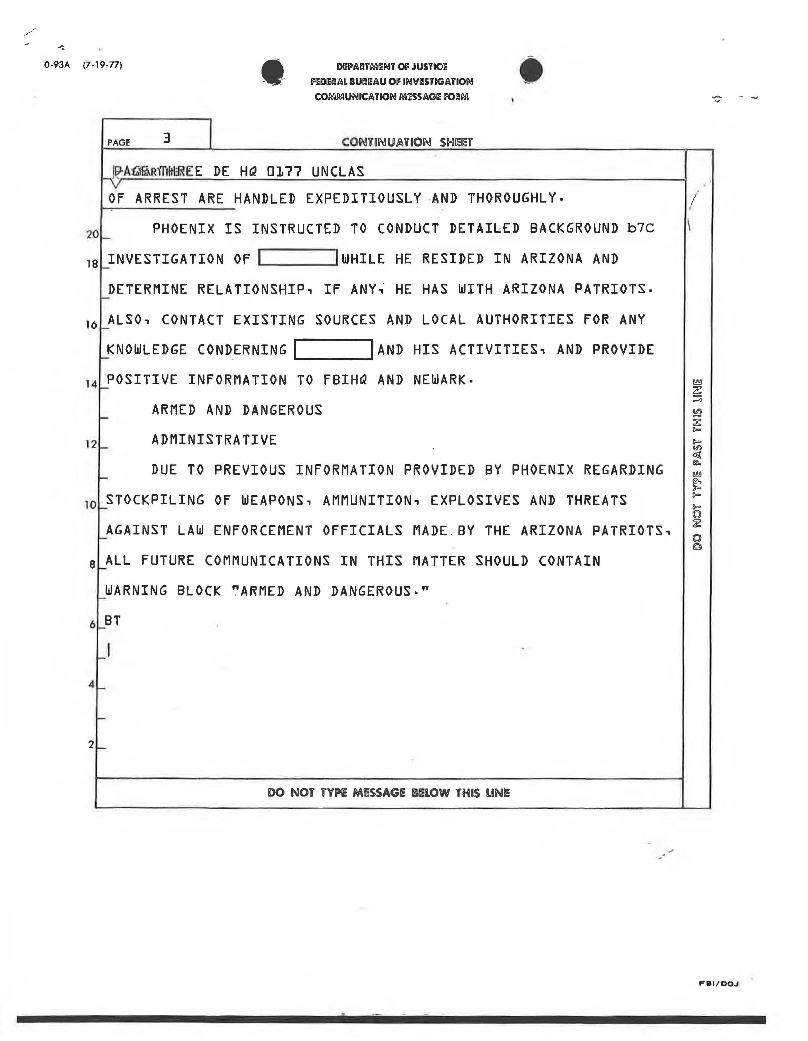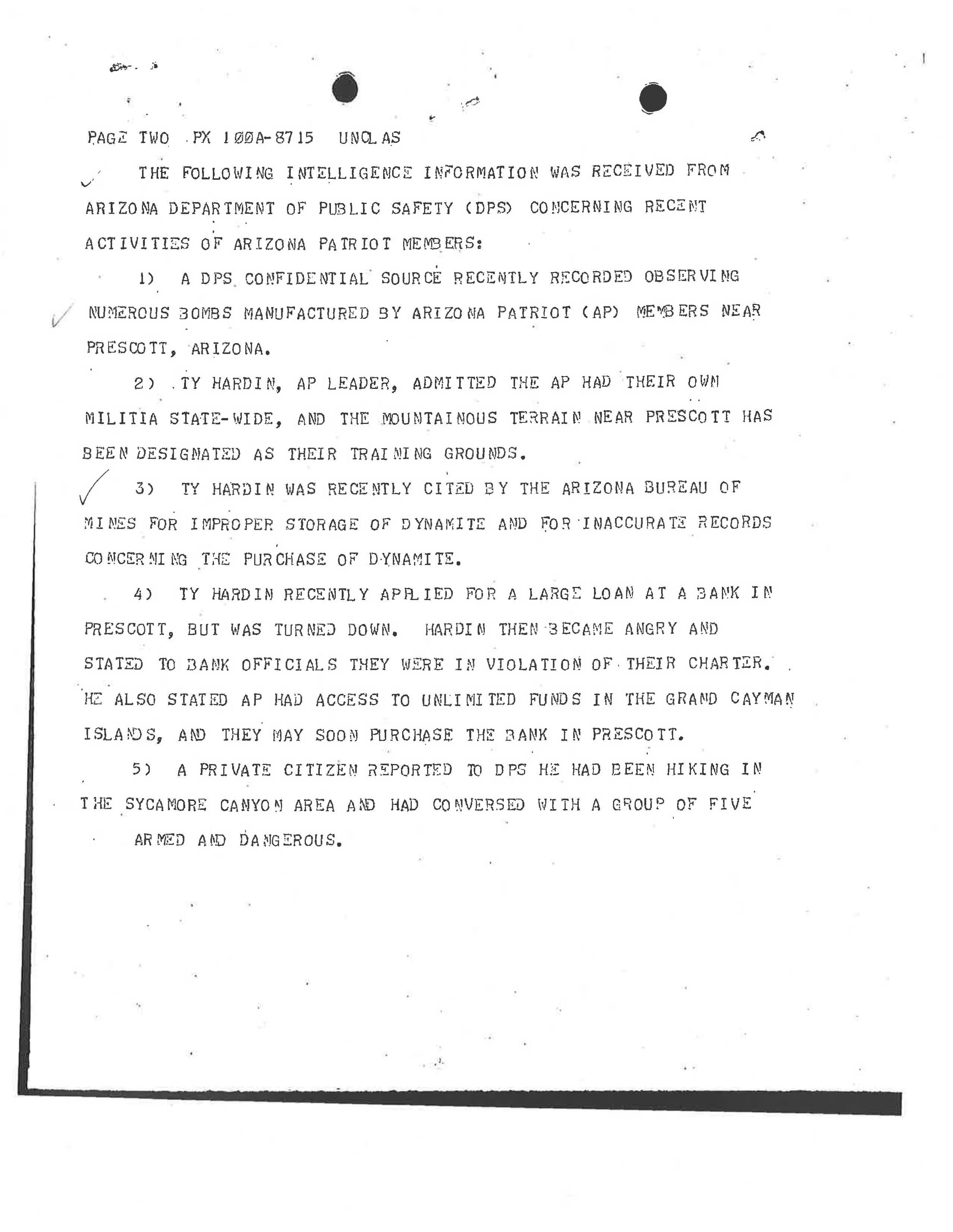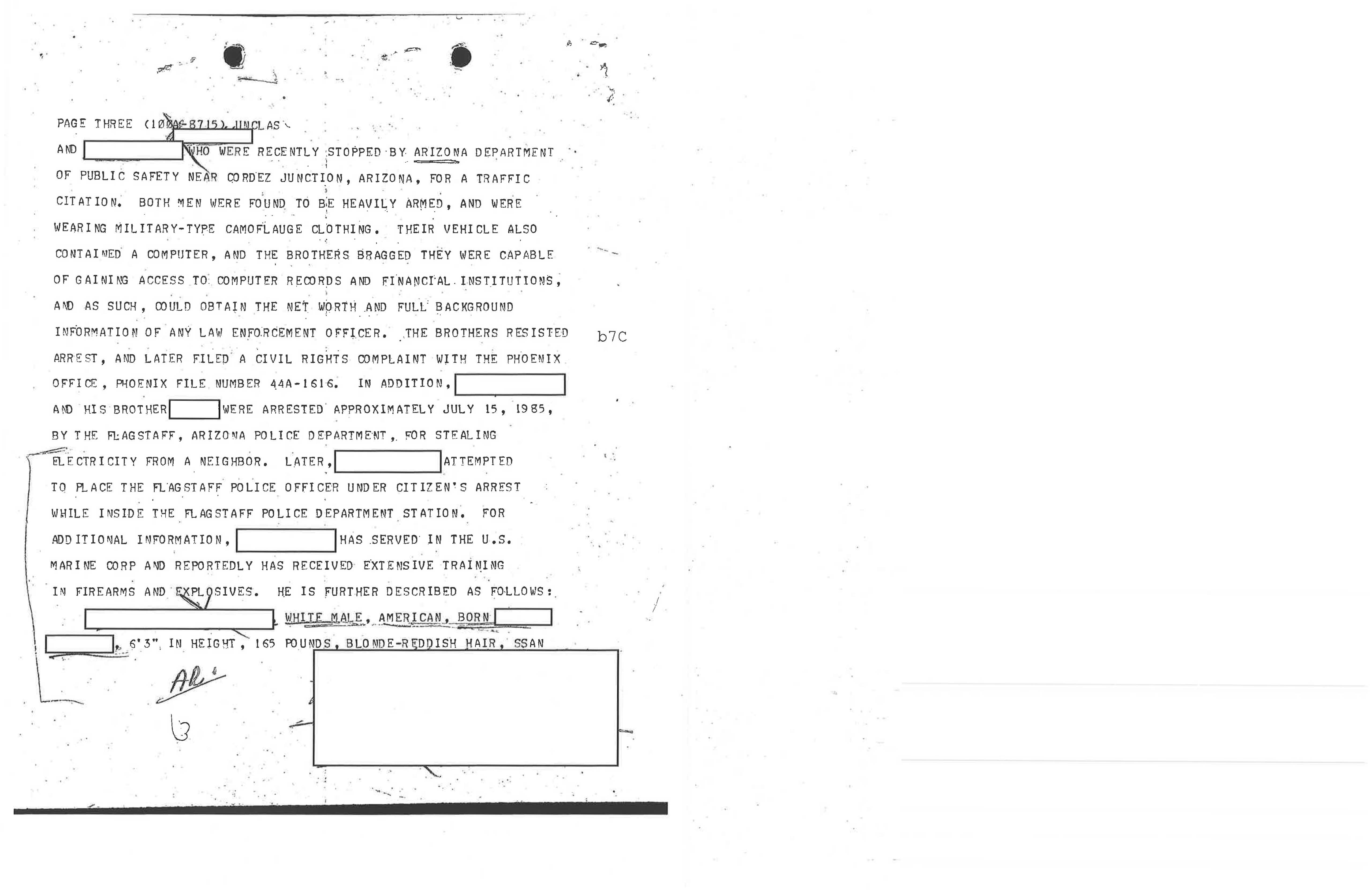 RECENTLY STOPPED BY. ARIZONA DEPARTMENT · 1 OF PUBLIC SAFETY NE~R GORD.EZ JU NCTI_ON, ARIZONA, FOR A TRAFFIC t CITATION~ BOTH "'1EN WERE rn 'uNQ TO s:E HEAVI~Y ARMED, AND WERE , . . WEARING MILITARY-TYPE CAMDFlAUGE CLOTHING. THEIR VEHICLE ALSO CONTAIMEO A COMPUTER, AND THE BROTHERS BRAGGED THEY WERE C.APABLE OF GAINU..'G ACCESS TO : COMPUTER REmRpS AND FI°NANCtAL. I.NST ITUTION$~ . A~O AS SUCH, CXlULD OBTAPI THE NET wpRT!-!_.~ND FULL' BACKGROUND