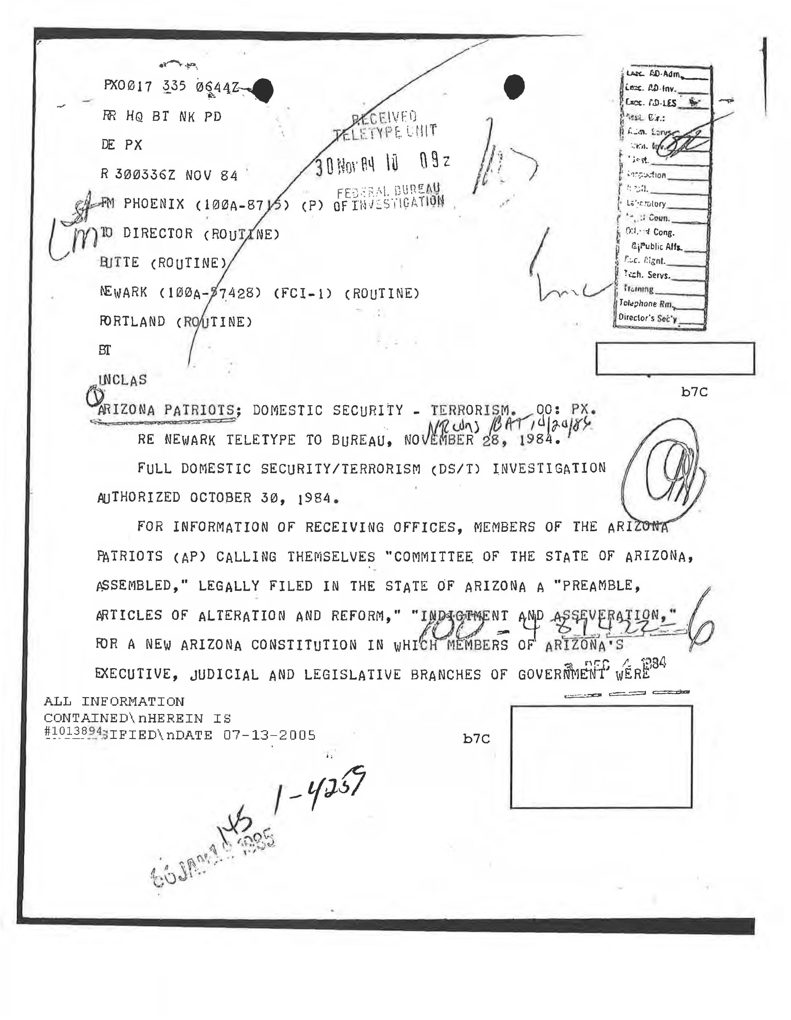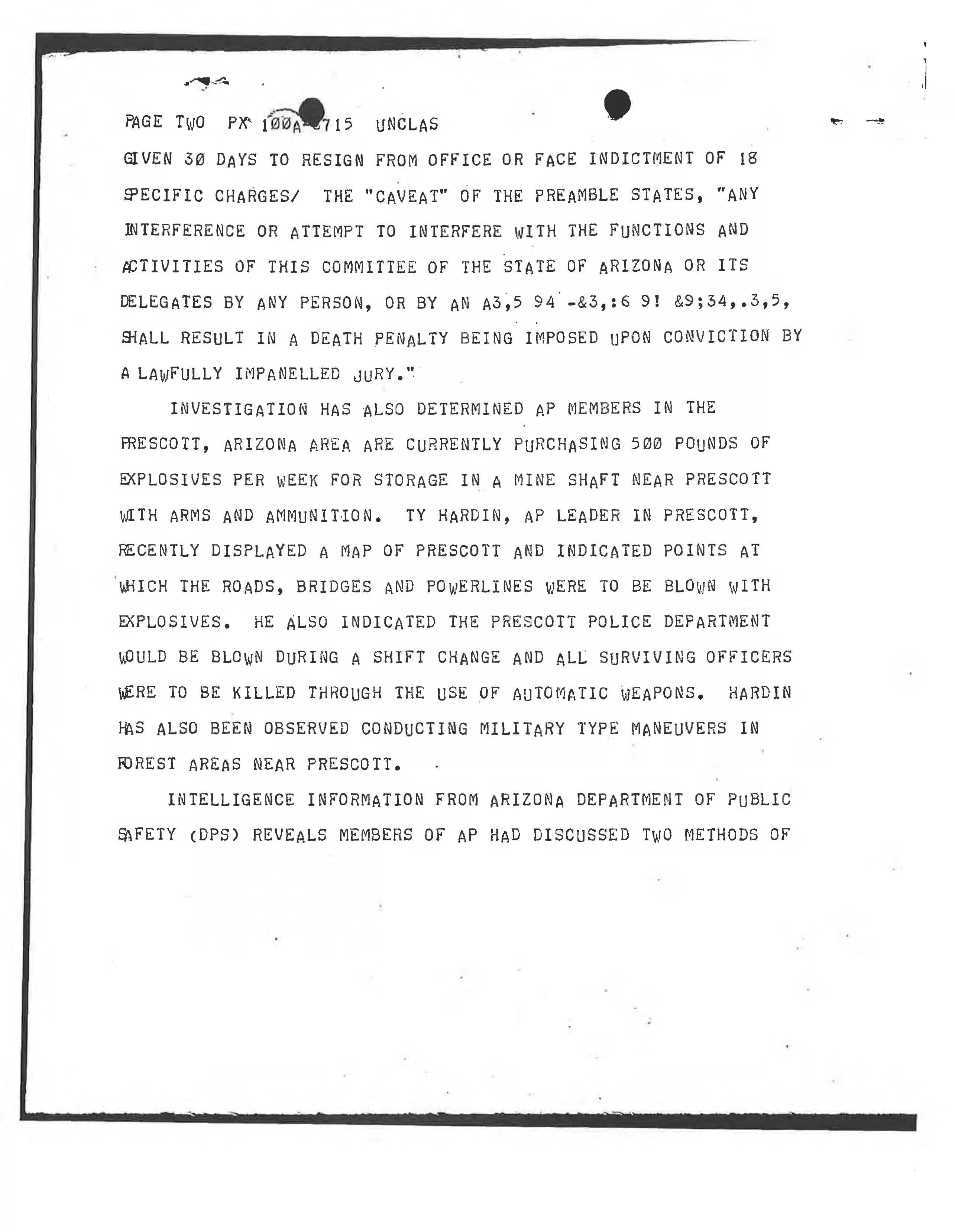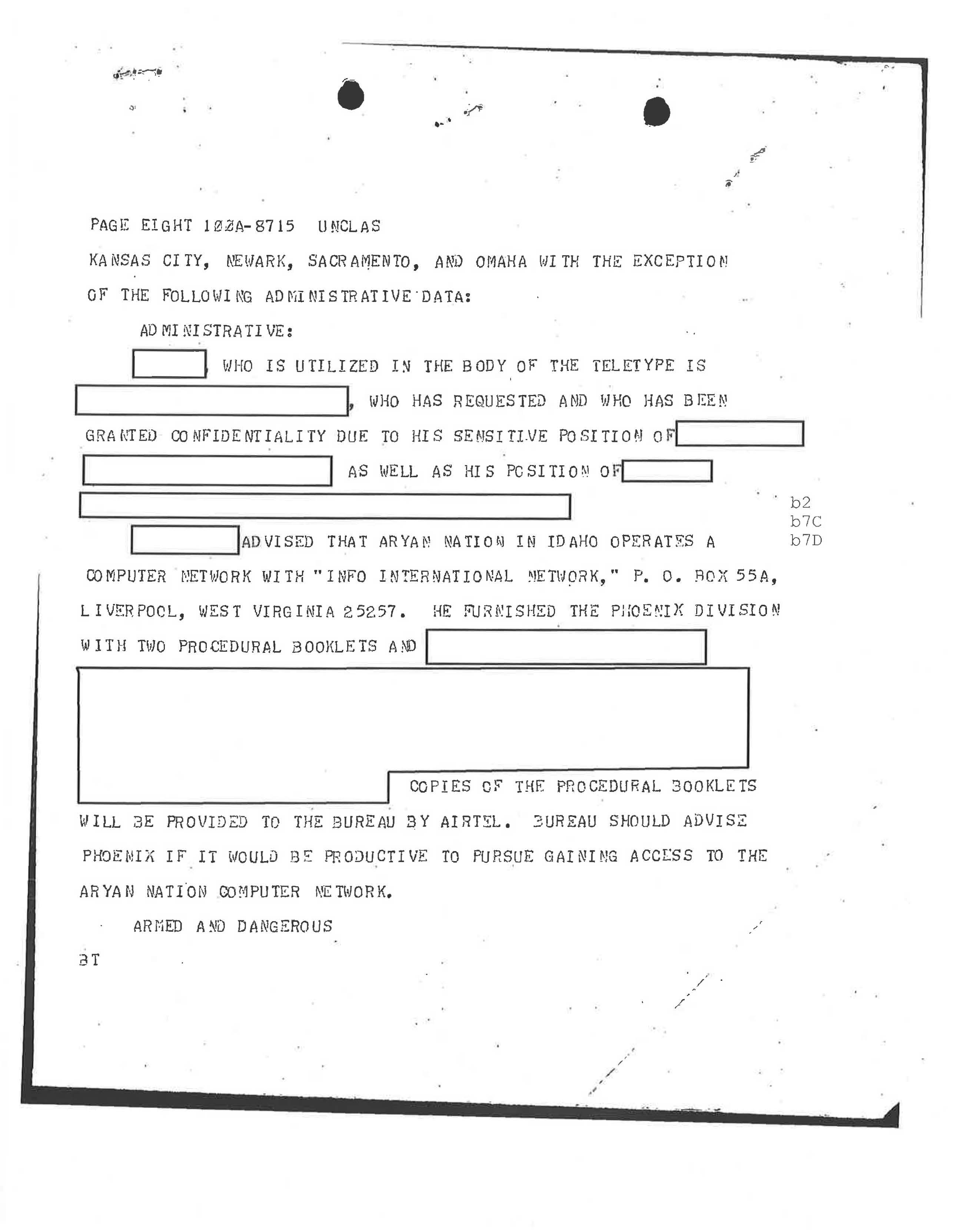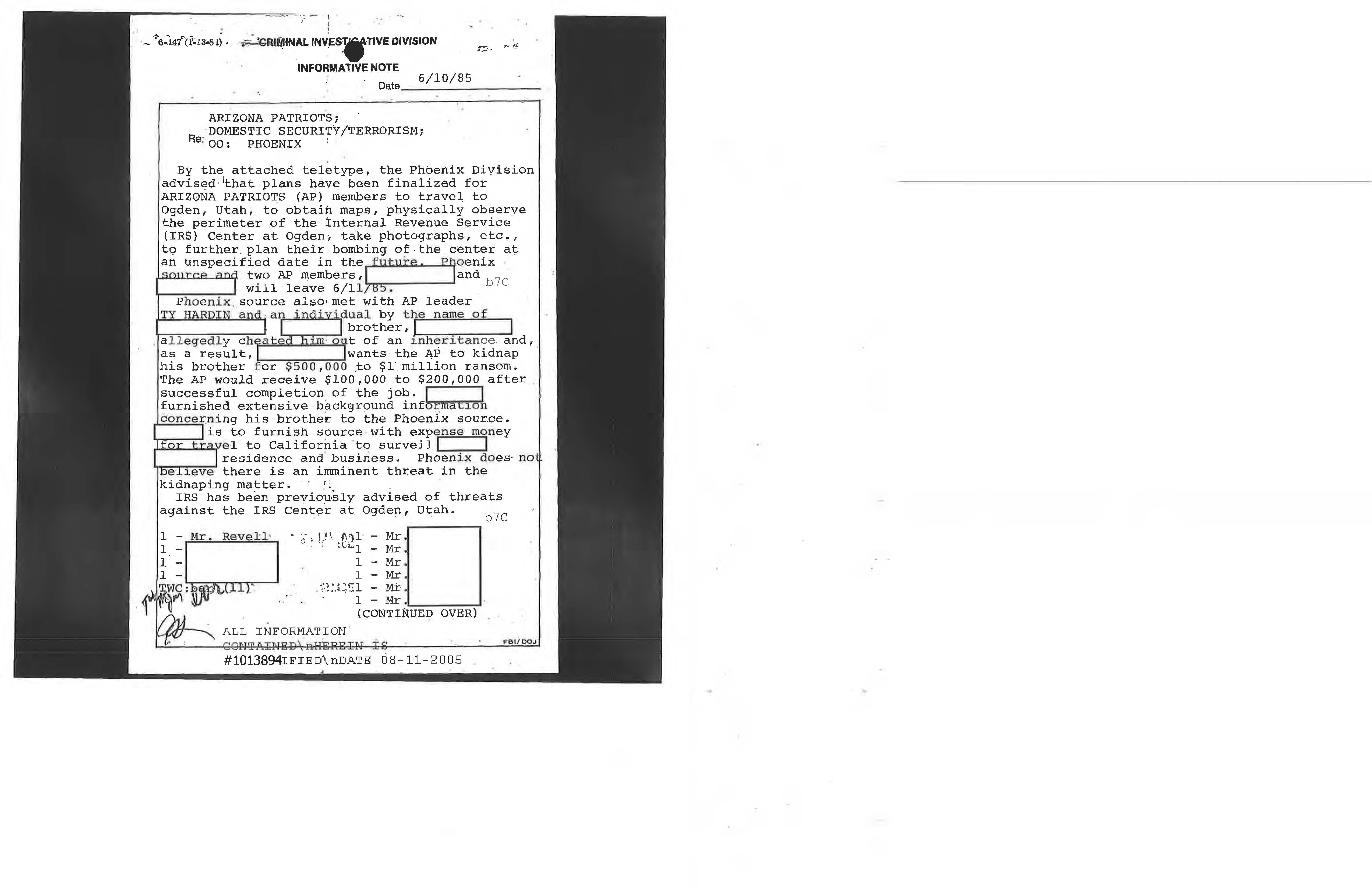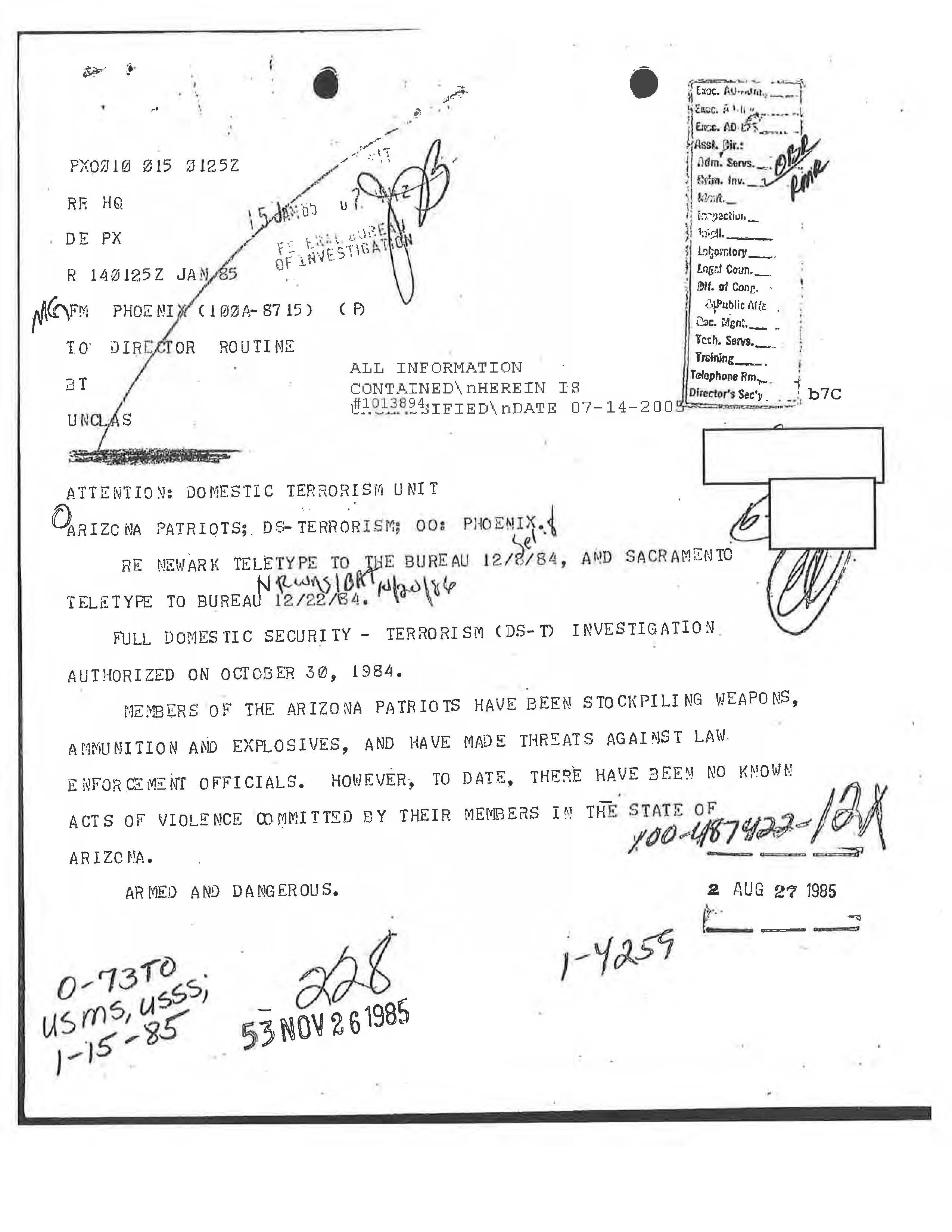 RECENTLY STOPPED BY. ARIZONA DEPARTMENT · 1 OF PUBLIC SAFETY NE~R GORD.EZ JU NCTI_ON, ARIZONA, FOR A TRAFFIC t CITATION~ BOTH "'1EN WERE rn 'uNQ TO s:E HEAVI~Y ARMED, AND WERE , . . WEARING MILITARY-TYPE CAMDFlAUGE CLOTHING. THEIR VEHICLE ALSO CONTAIMEO A COMPUTER, AND THE BROTHERS BRAGGED THEY WERE C.APABLE OF GAINU..'G ACCESS TO : COMPUTER REmRpS AND FI°NANCtAL. I.NST ITUTION$~ . A~O AS SUCH, CXlULD OBTAPI THE NET wpRT!-!_.~ND FULL' BACKGROUND