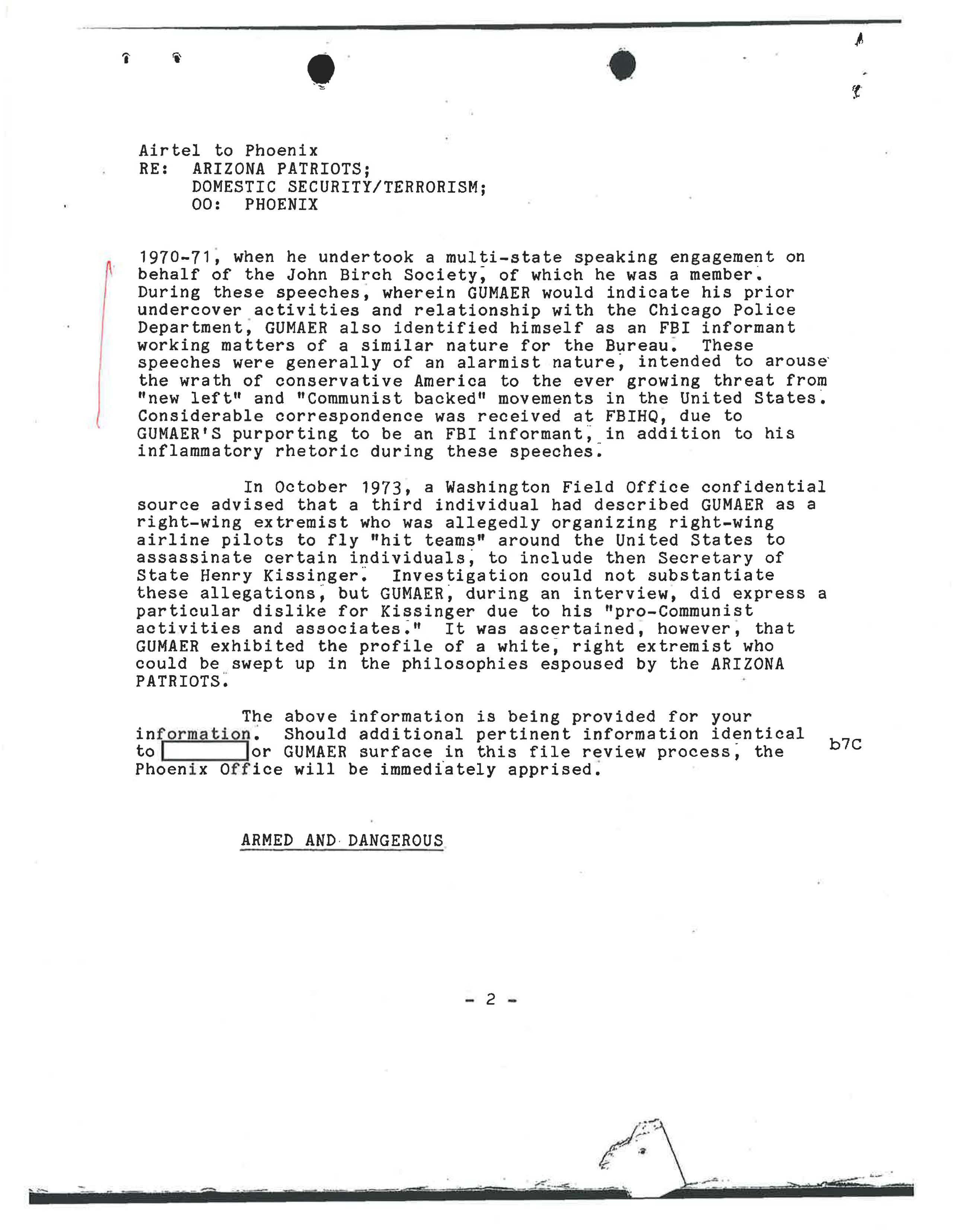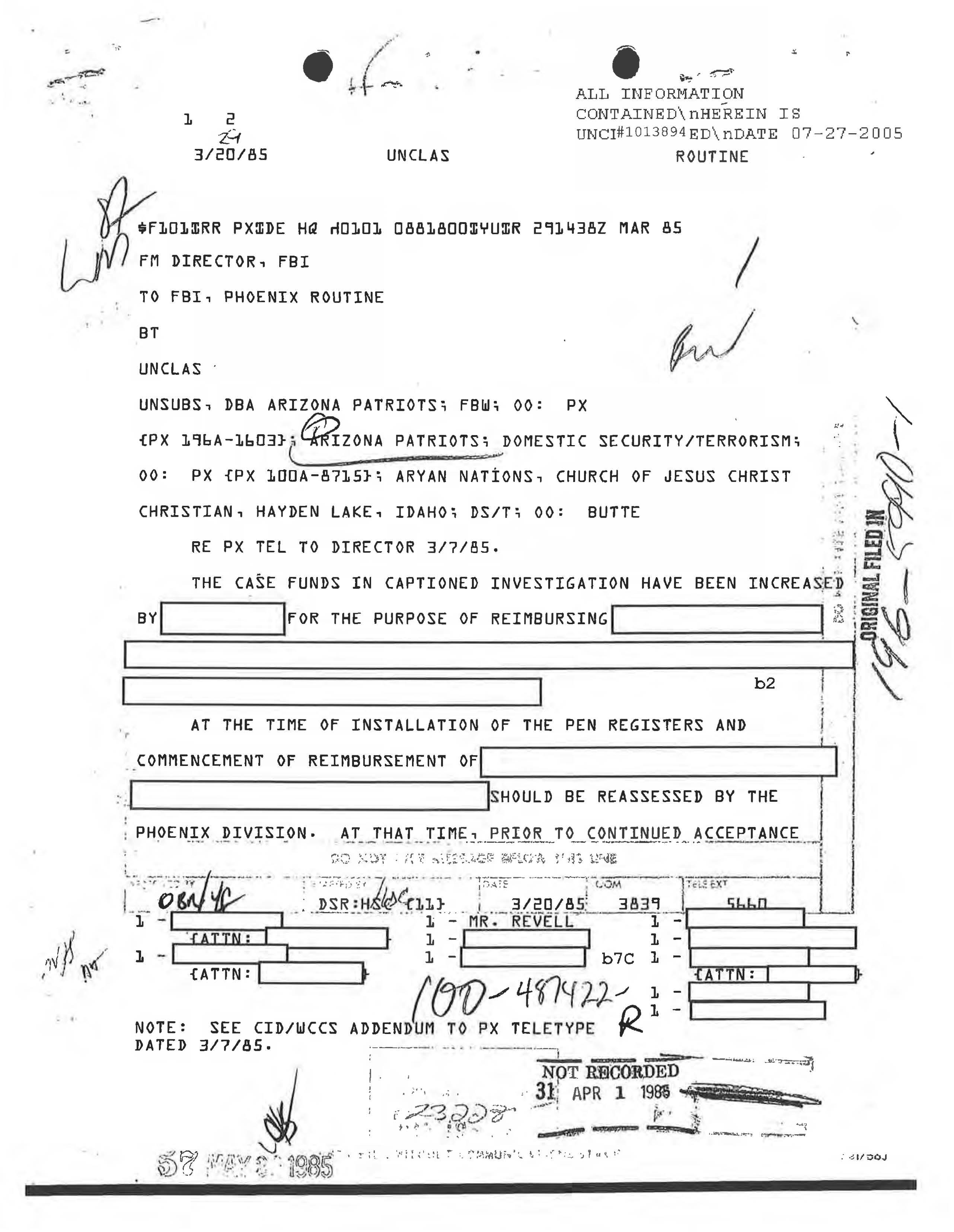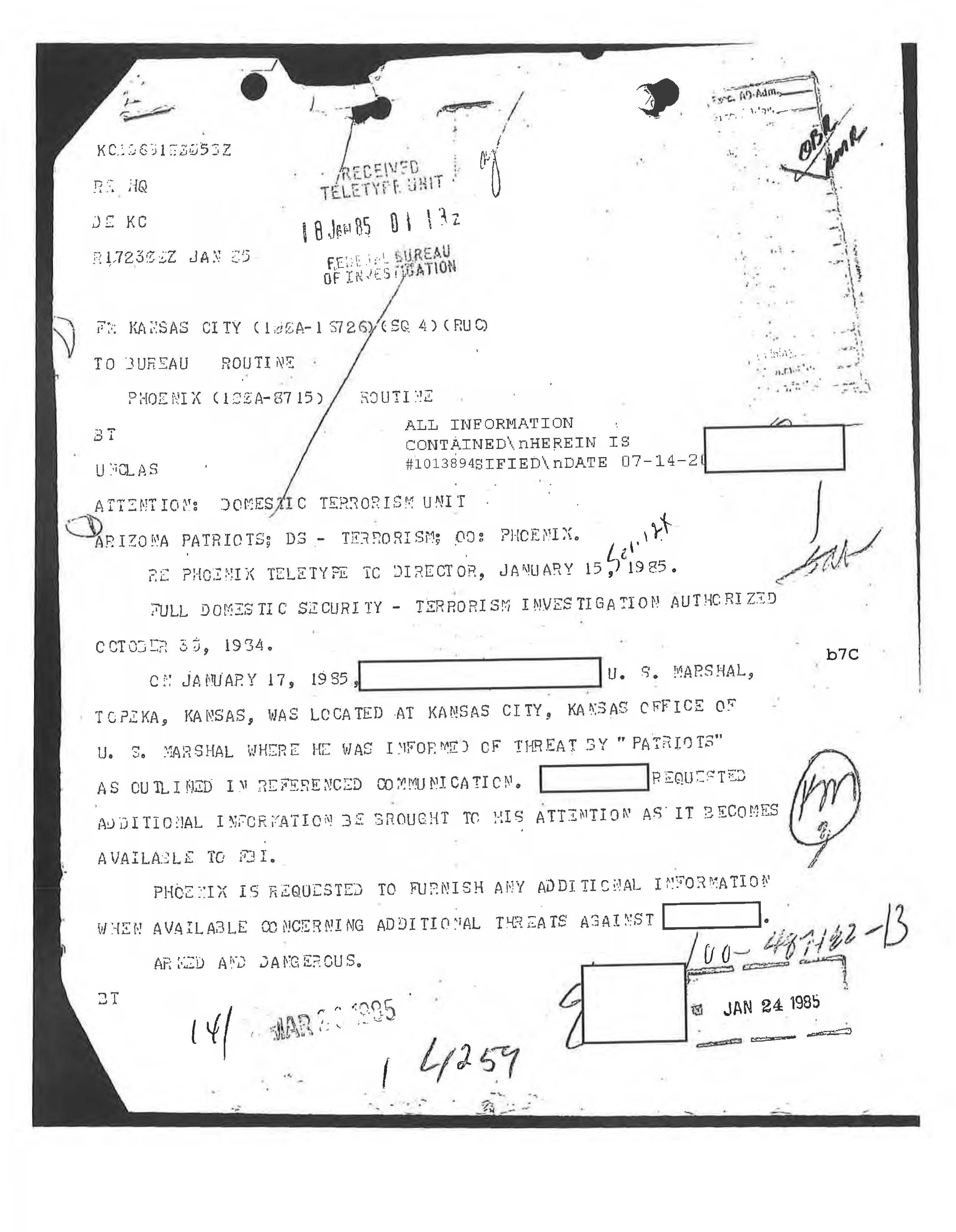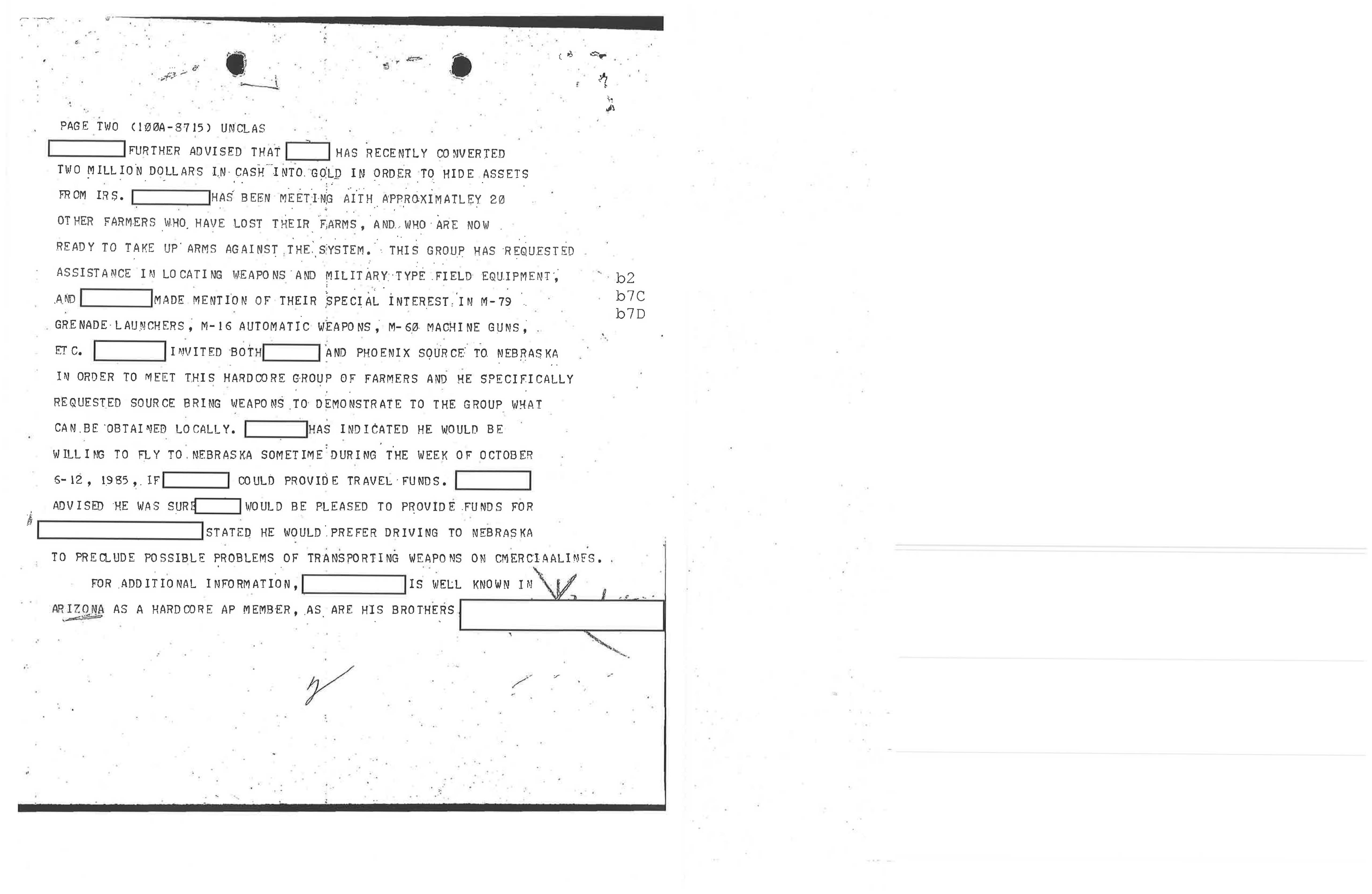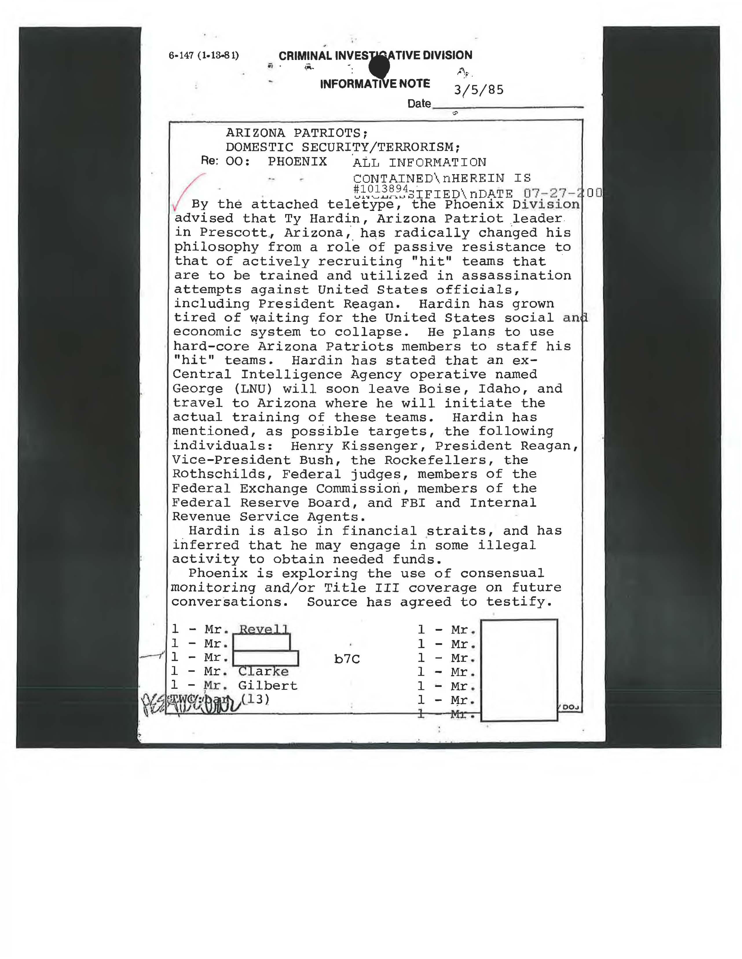 RECENTLY STOPPED BY. ARIZONA DEPARTMENT · 1 OF PUBLIC SAFETY NE~R GORD.EZ JU NCTI_ON, ARIZONA, FOR A TRAFFIC t CITATION~ BOTH "'1EN WERE rn 'uNQ TO s:E HEAVI~Y ARMED, AND WERE , . . WEARING MILITARY-TYPE CAMDFlAUGE CLOTHING. THEIR VEHICLE ALSO CONTAIMEO A COMPUTER, AND THE BROTHERS BRAGGED THEY WERE C.APABLE OF GAINU..'G ACCESS TO : COMPUTER REmRpS AND FI°NANCtAL. I.NST ITUTION$~ . A~O AS SUCH, CXlULD OBTAPI THE NET wpRT!-!_.~ND FULL' BACKGROUND
