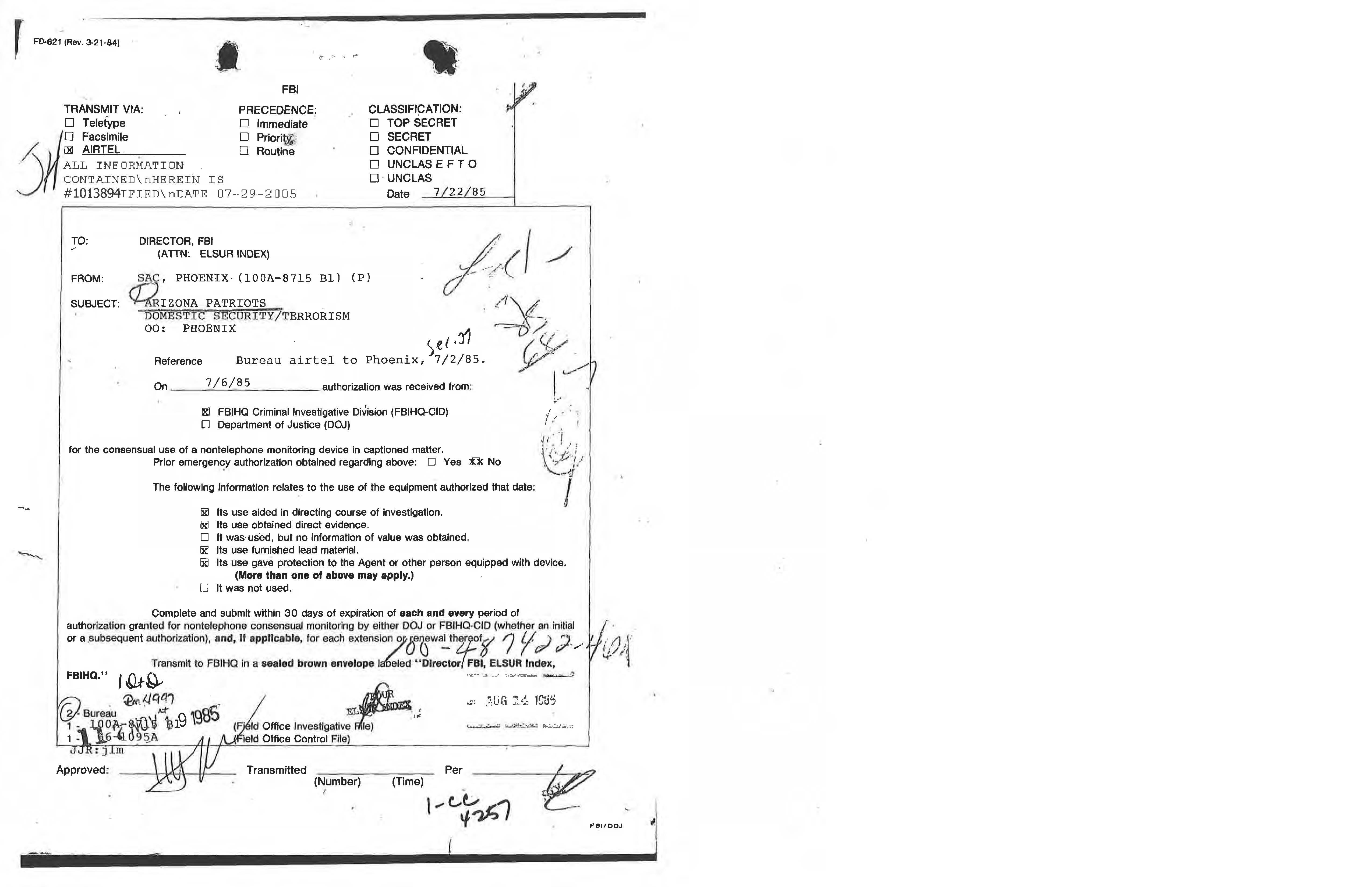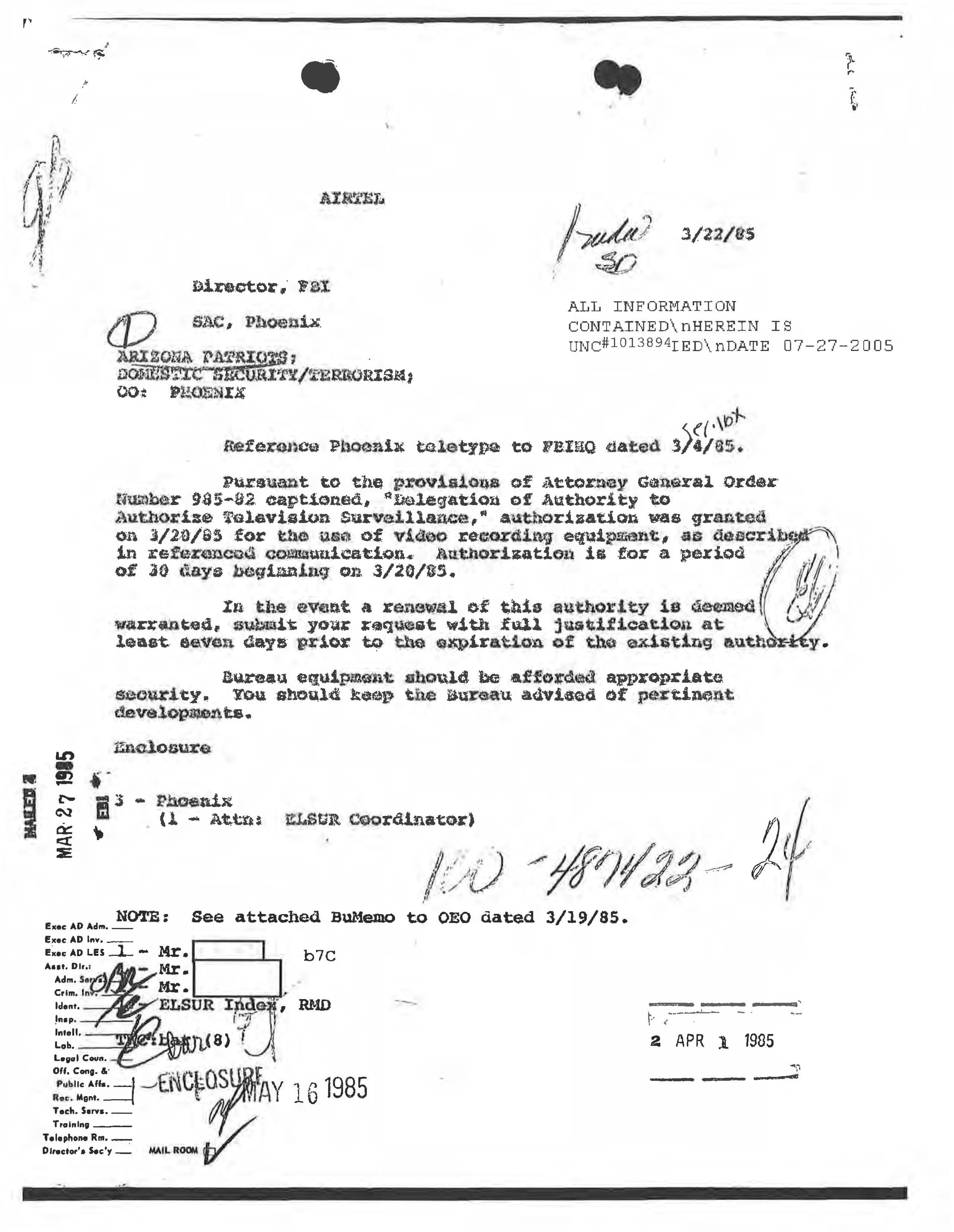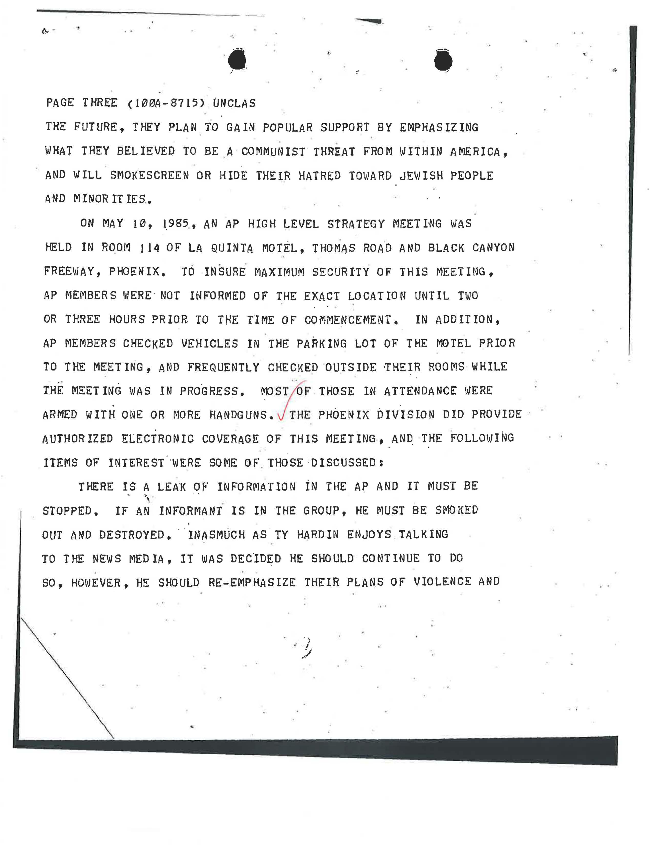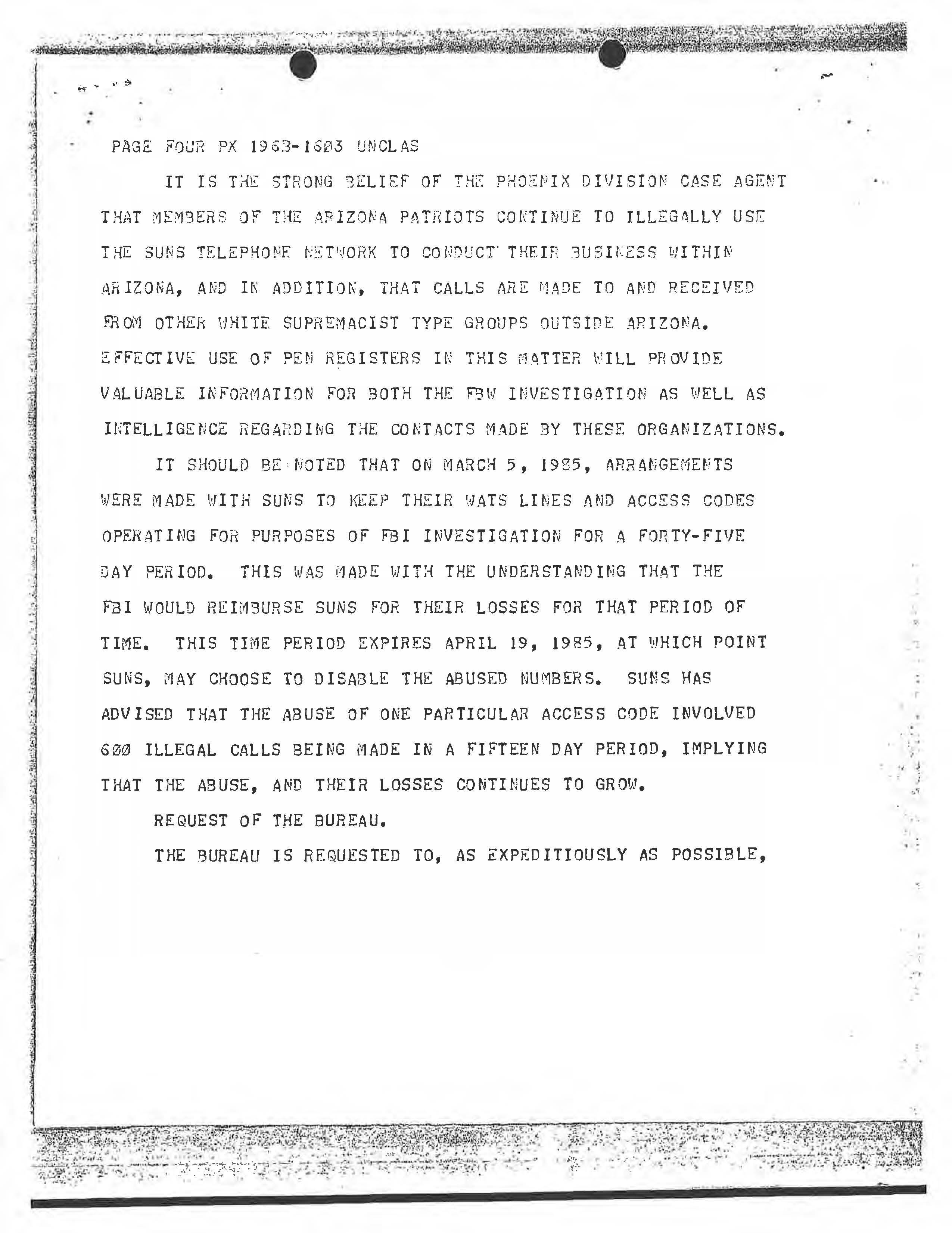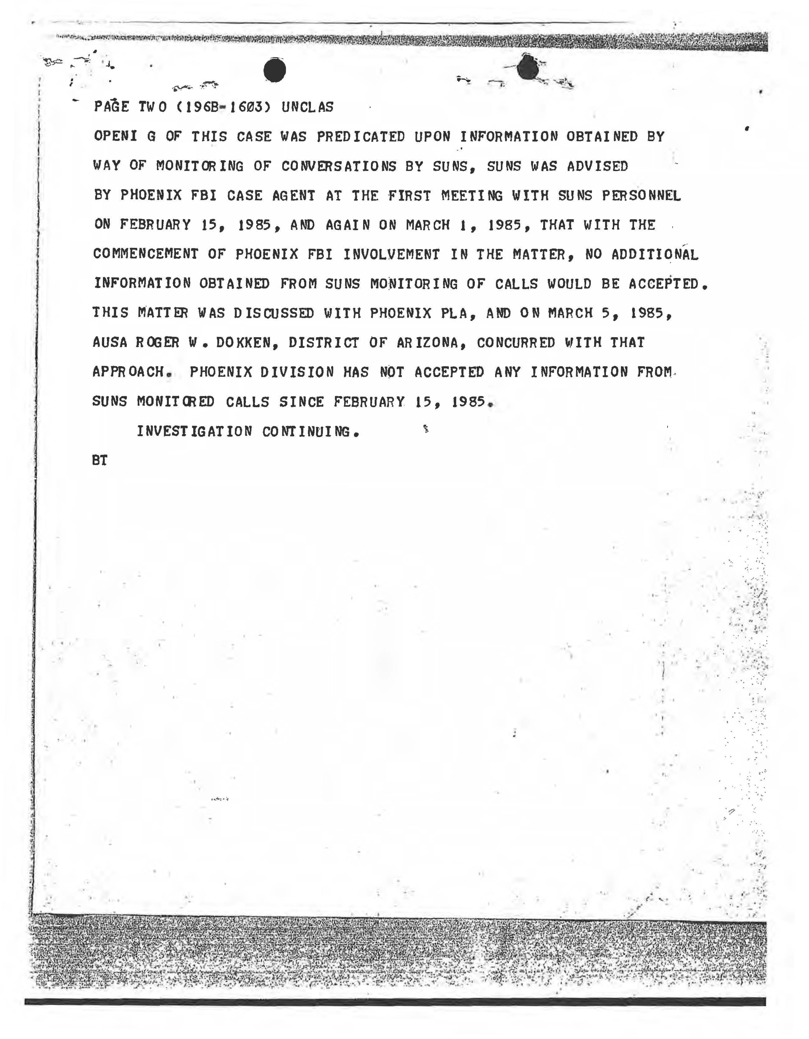 PHOENIX IS CONT INuIN G TO EVALuA~E POSSIBILITY OF' uTILIZA , OF TITLE III COVERAGE AND A GROUP I uNDERCOVER PROPOSAL REG'ARDING CAPTI,ONED ORGA'NIZAT ION. PHOENIX HAS PREPARED A F~LL THREAT fvrJ//t,<J~ di!' . . . . · - - · I (J O,.,. LI~ l L/ rx (;le- J ANALYSIS wHICH wILL·'BE. PRESENTED TO SAG,' PHOENIX, 10/25/85, FOR 0/ •, HIS EV-A-L,uAT~.ON OF THE -POSSIBILITY OF A: GROUP I- uNDERCOVER - -•( 't• OP~RAT ro~. ~~.: fo·ai~!i~~ :S(.!,~H rs DEC.IS io N IS REACHED, THE BuREAU a NOV 1 1985 W~LL BEOf6J7s:p '. ' . "•~. i:.:__ - 1~ . .. o,t /l..'.J , • /( .,,,,,, u -• I ,/ j