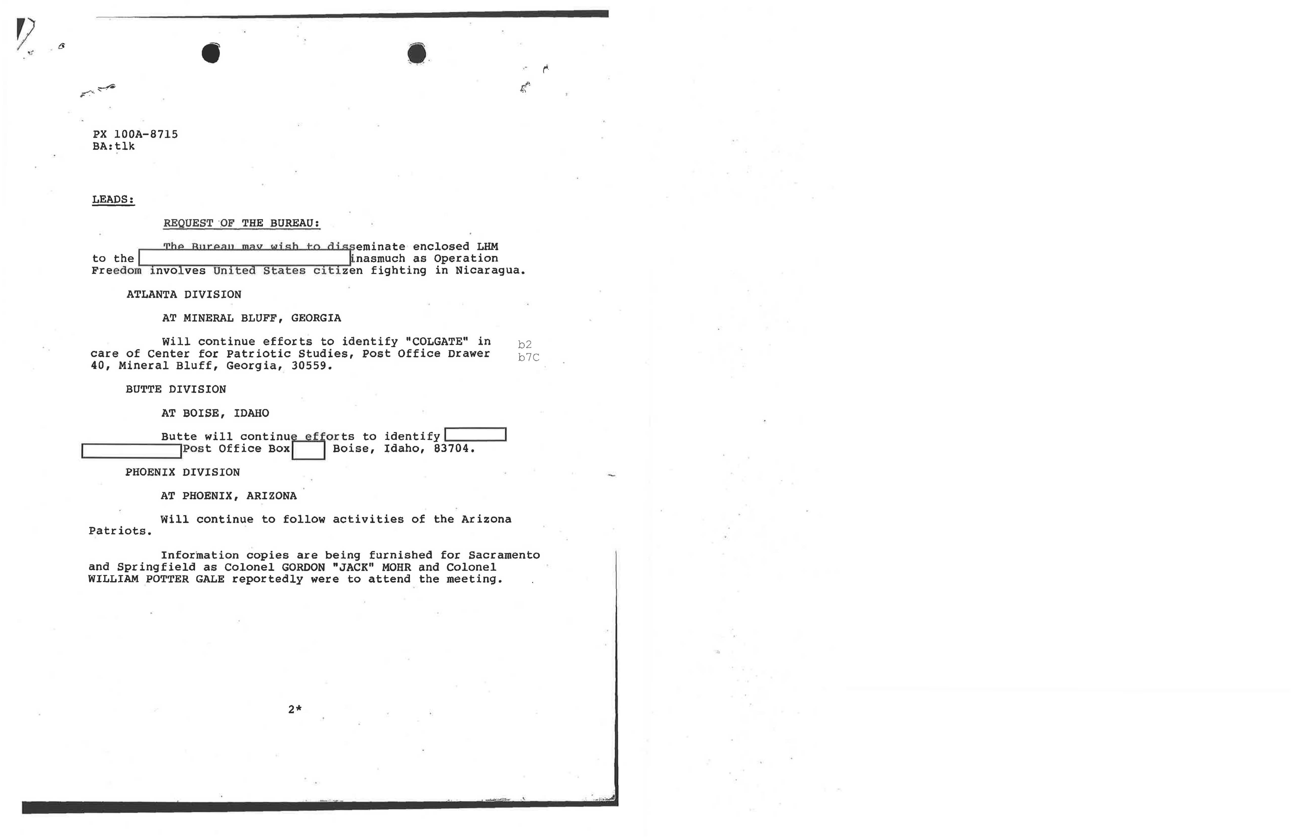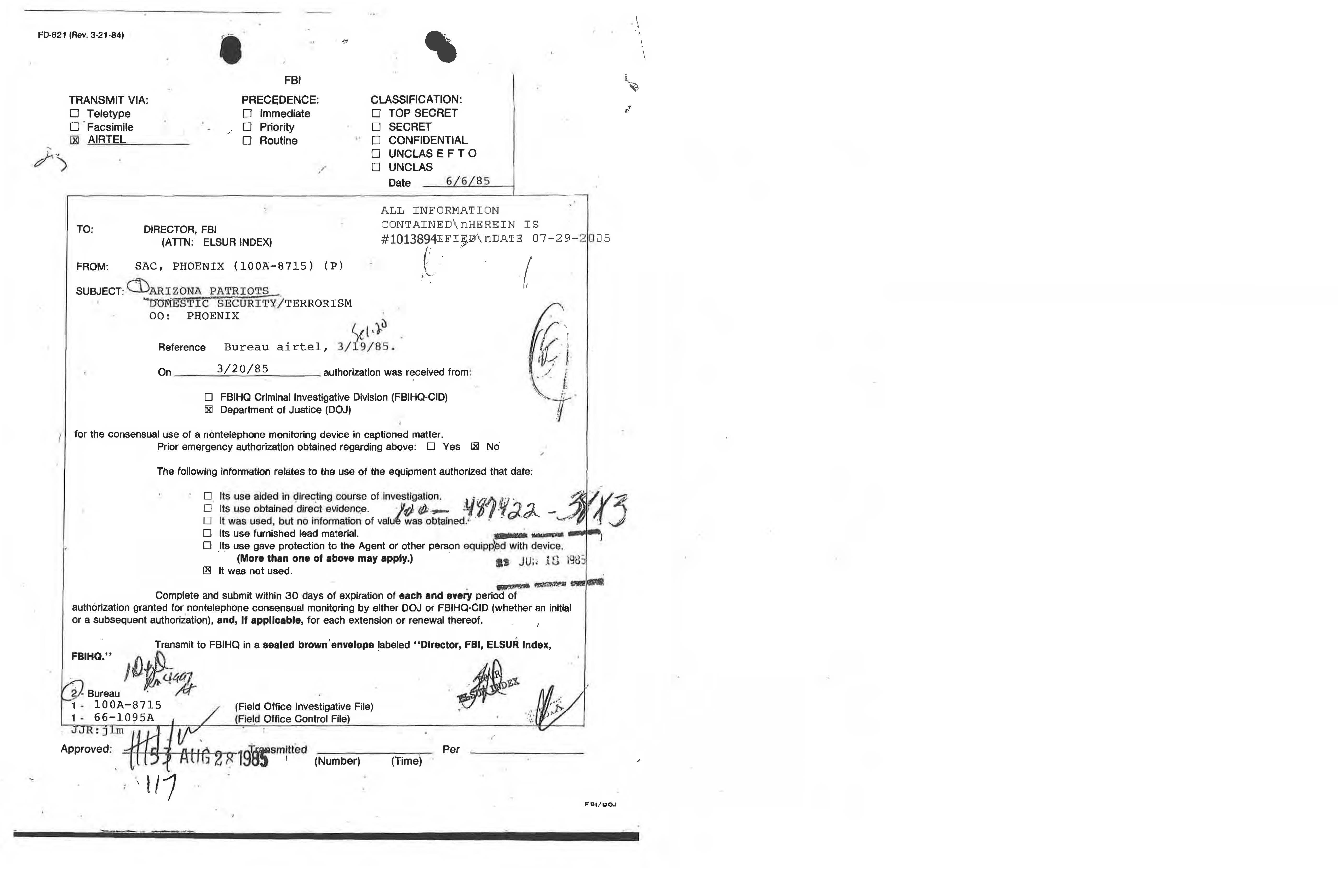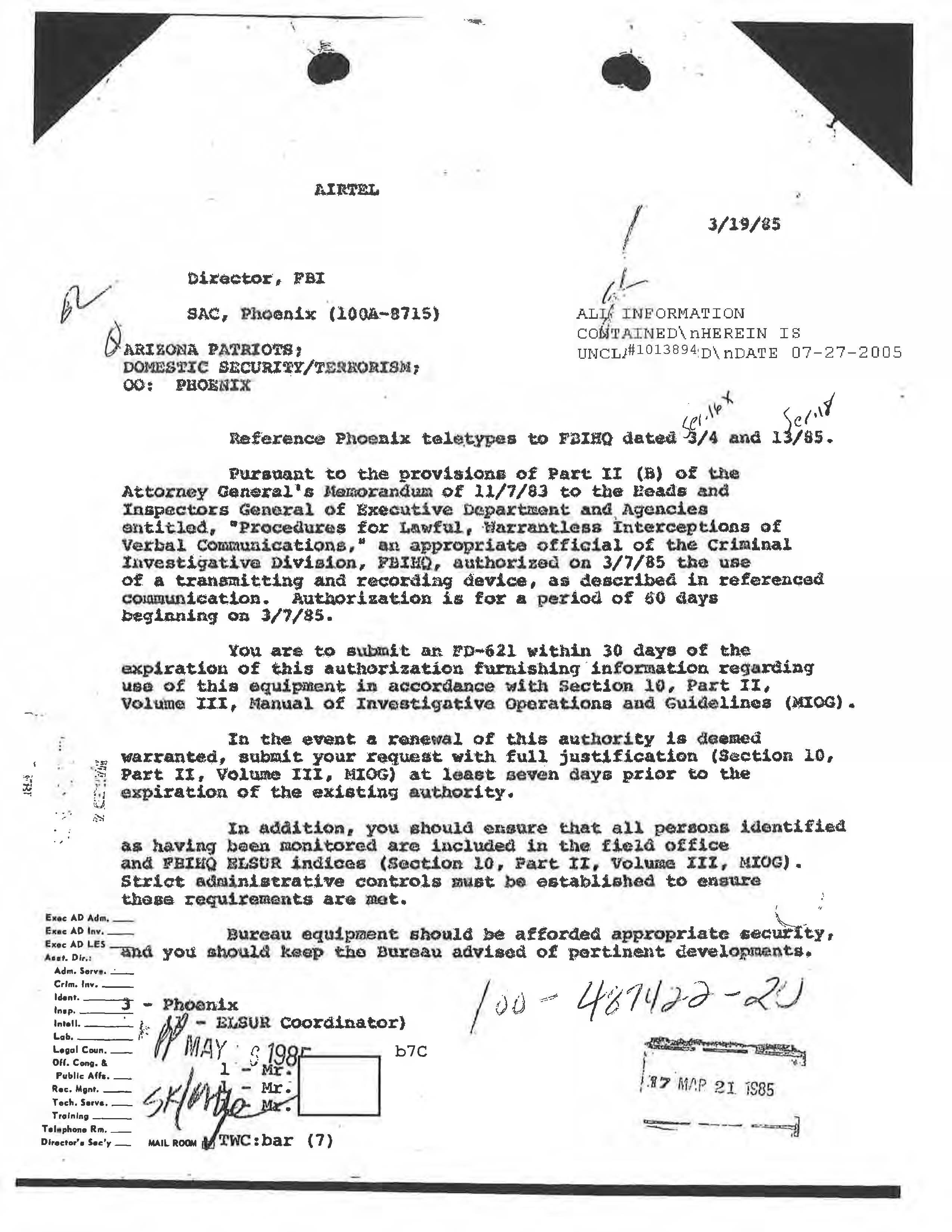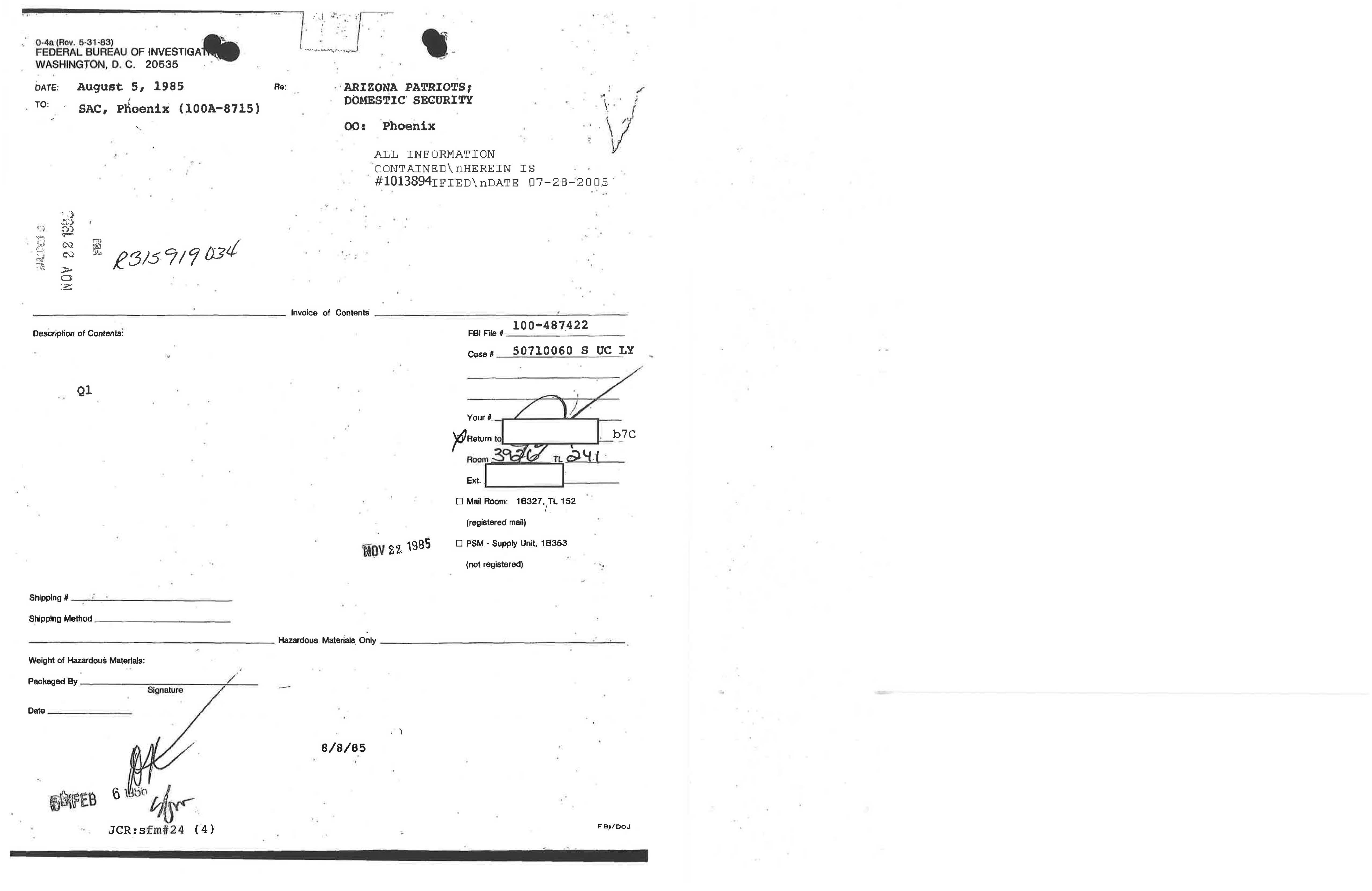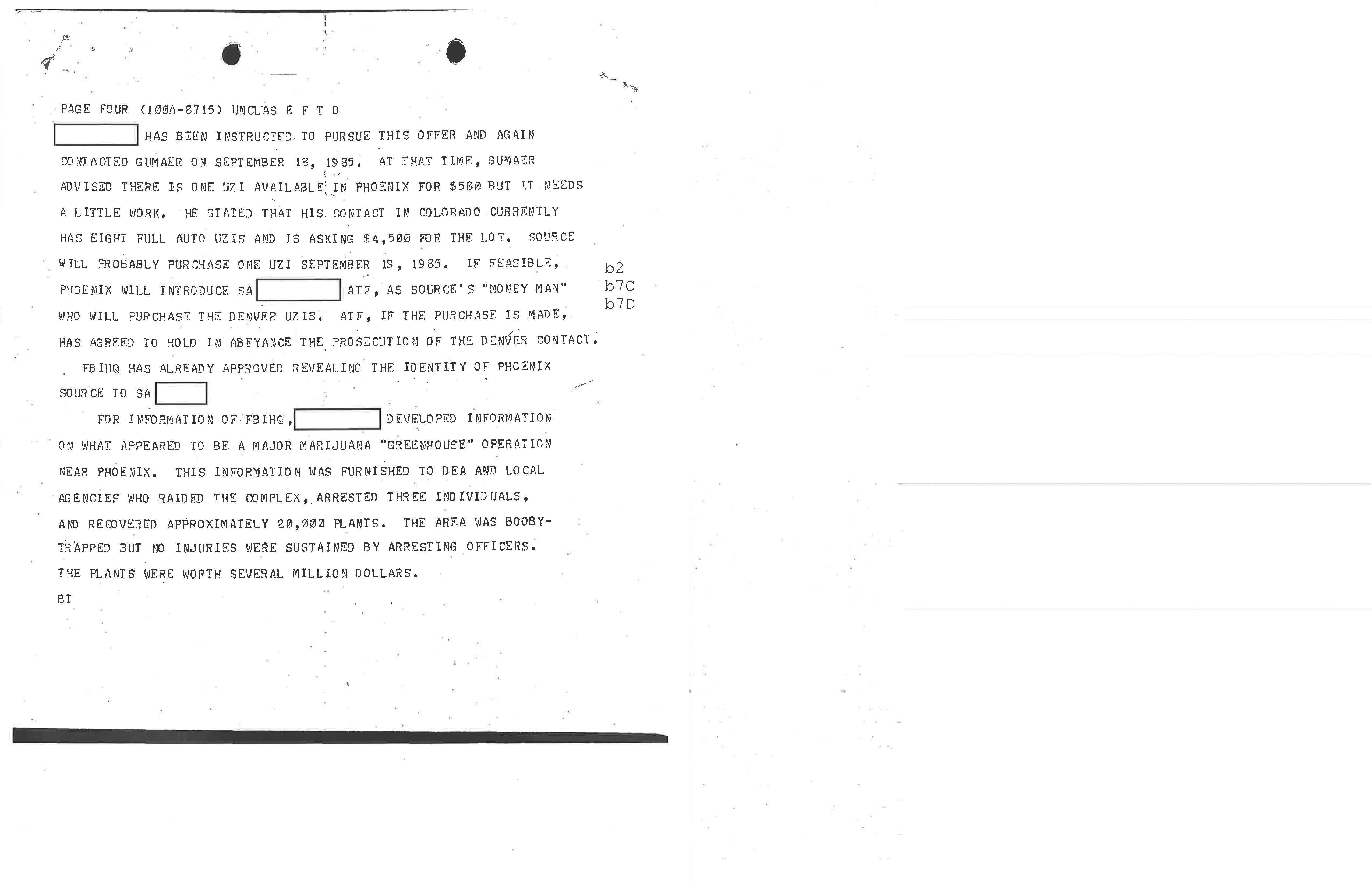 PHOENIX IS CONT INuIN G TO EVALuA~E POSSIBILITY OF' uTILIZA , OF TITLE III COVERAGE AND A GROUP I uNDERCOVER PROPOSAL REG'ARDING CAPTI,ONED ORGA'NIZAT ION. PHOENIX HAS PREPARED A F~LL THREAT fvrJ//t,<J~ di!' . . . . · - - · I (J O,.,. LI~ l L/ rx (;le- J ANALYSIS wHICH wILL·'BE. PRESENTED TO SAG,' PHOENIX, 10/25/85, FOR 0/ •, HIS EV-A-L,uAT~.ON OF THE -POSSIBILITY OF A: GROUP I- uNDERCOVER - -•( 't• OP~RAT ro~. ~~.: fo·ai~!i~~ :S(.!,~H rs DEC.IS io N IS REACHED, THE BuREAU a NOV 1 1985 W~LL BEOf6J7s:p '. ' . "•~. i:.:__ - 1~ . .. o,t /l..'.J , • /( .,,,,,, u -• I ,/ j