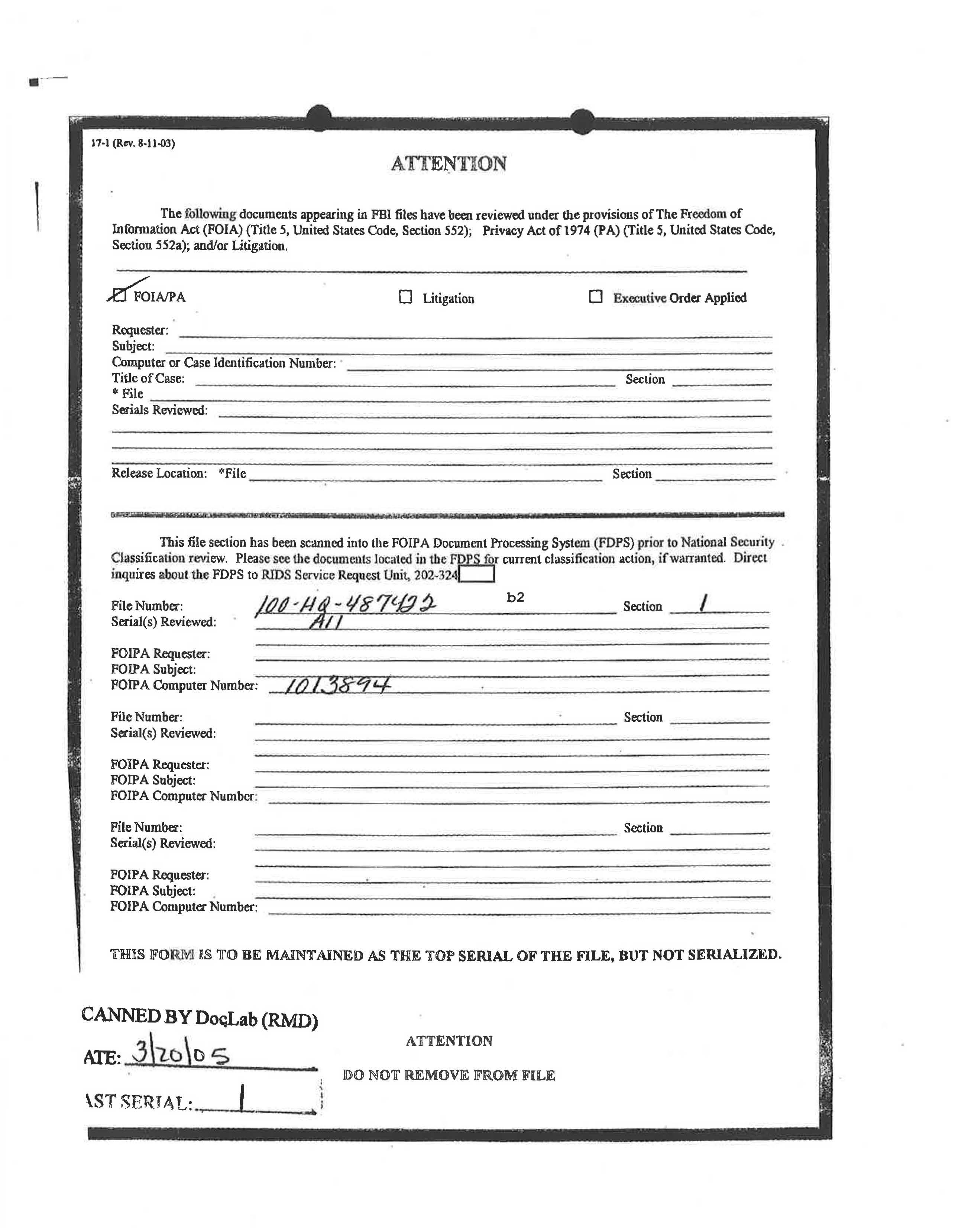 Computer Number : File Number: __________ Section ___ Serial(s) Reviewed : FOIPA Requester: FOIPA Subject: FOIPA Computer Number: 'll'HHS !FO RM IS 11'0 BE MAINTAINED AS THE TOP SERIAL OF THE FILE, BUT NOT SERIALIZED.