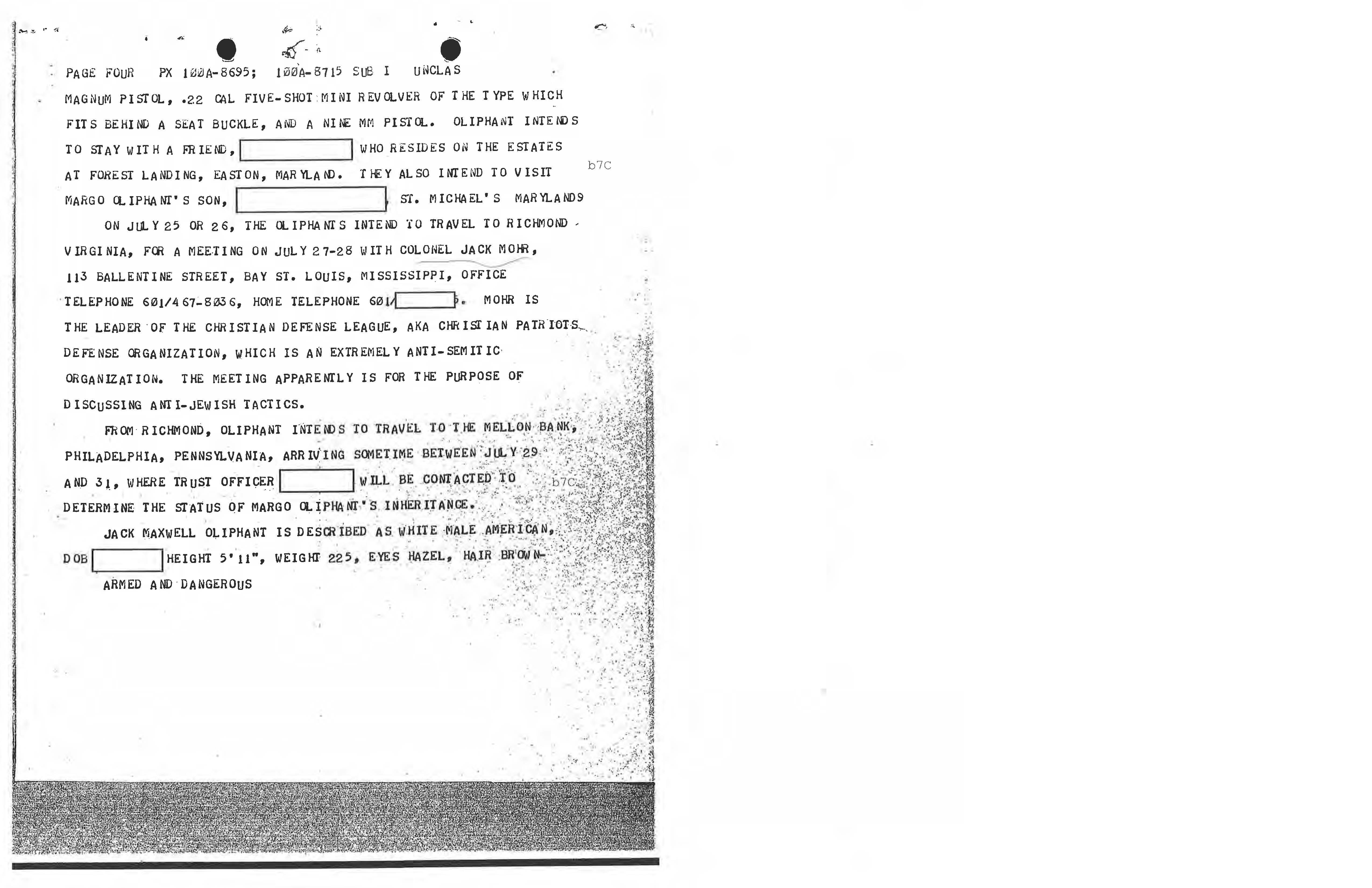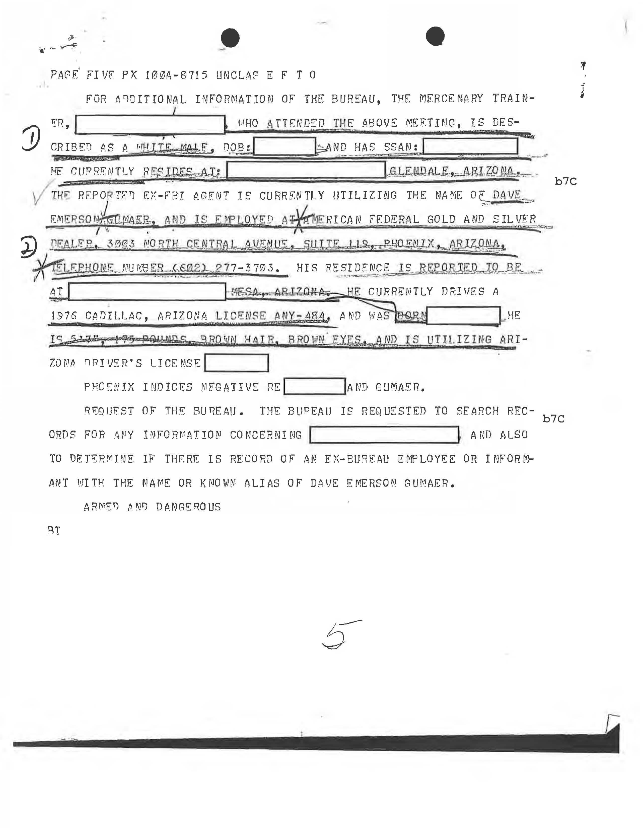 UTILIZING THE cooE NAME OF "GREY FOX", AND IS DESCRIBED AS WMA, 6" l", 245. POUNDS, 41 YEARS OF' AGE- , BROWN -HAIR, BROWN 'EYES·, AND WI.LL·BE DRIVING A