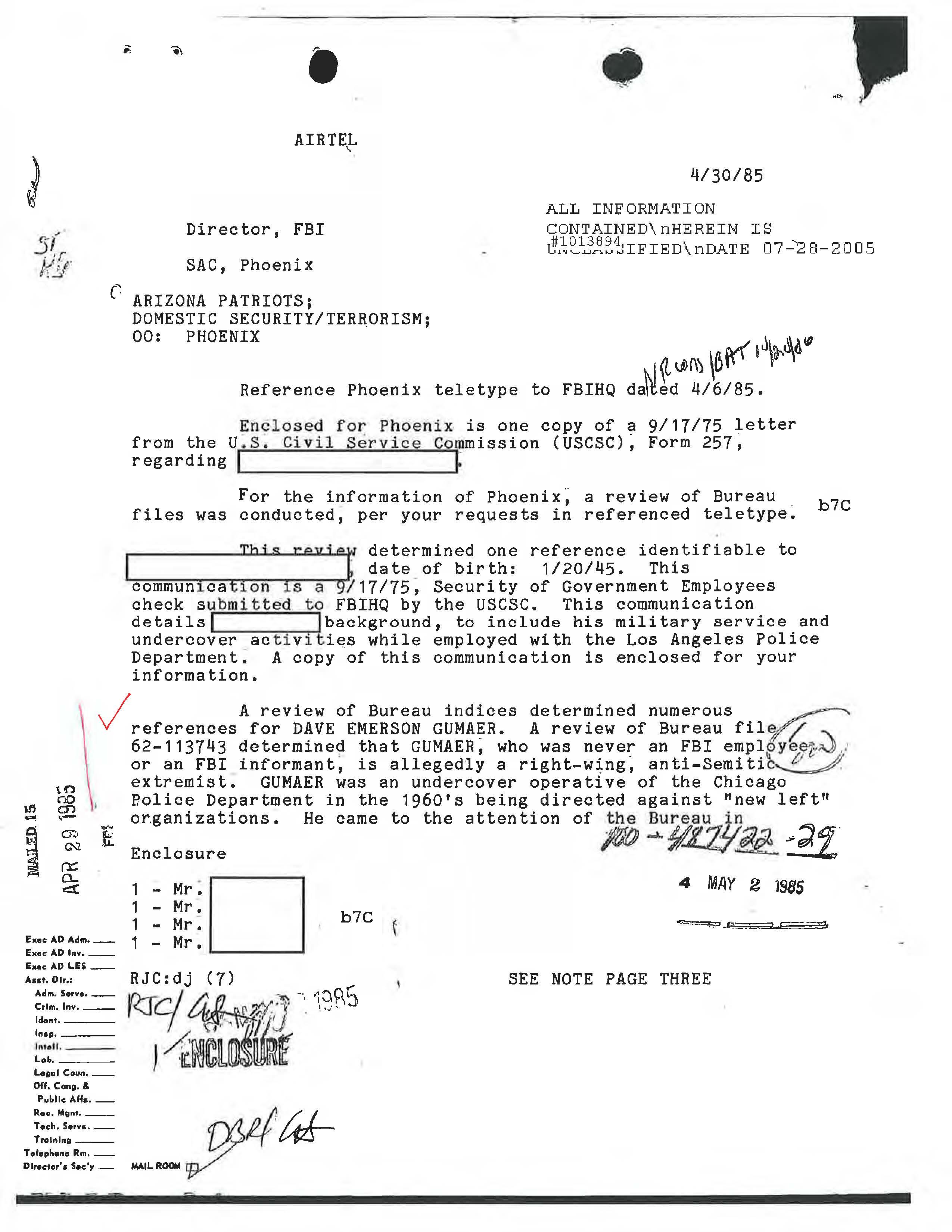 AS CRUCIAL IN THIS MATTER. ALISA ROGER DOKKEN, PHOENIX~· ARIZONA, , • \ ALSO CONCURS WITH TRAVEL OF PHOE Nl.X'. SOUR.CE, AND HAS STATED THERE ..rs NO REASON TO BELIEVE HIS TRAVEL- MAY B-E UTILIZE!) AS A FUTURE