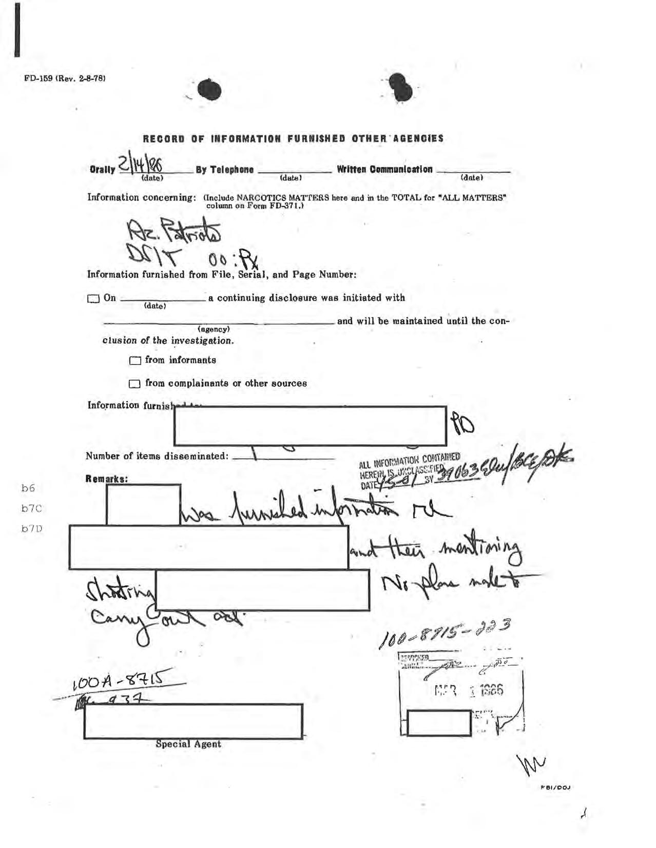FD-.'30'l 1Rev. 3•10-82) ' b7D b6 b7C FEDERAL BUREAU OF INVESTIGATION 1 3/5/86 Ollt• or transalptlon _________