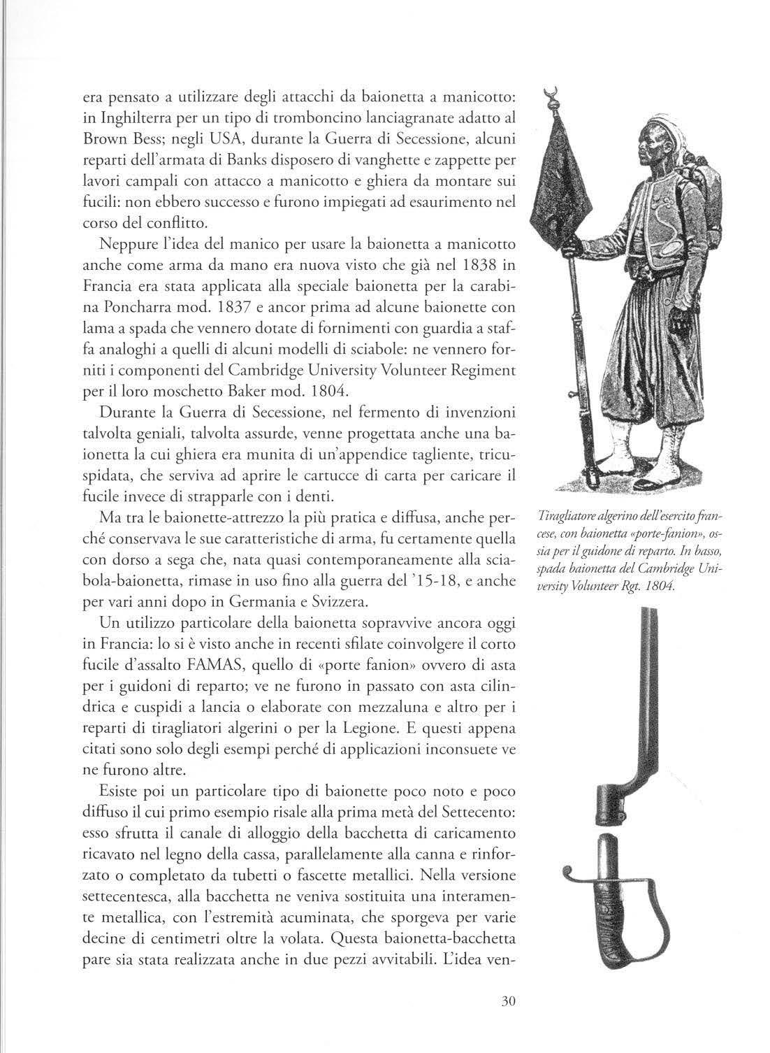 La Baionetta soooederu veno .il &ne del ~olo xmalle picche ed alle Corc:h.ette dei moscbeuieri. Si crede adoper.1t.1 per la prima ,oh.a io Fmdra dal sig. de Pay.égur nel 16~2 : en eua long:i due piedi , compreso il m.uuco di legog , $i porta\"a peodeote al fuoco sìoistro io luogo di aciabla, o òi spada, ed &I bisogno .si piaotava encro I.e bocca del fucile. Il P Daoiel , che ICIUlè lutori:i della miliiia francese, crede che oel 167 1se ne armasse per la prima volta un reggi meato iotiero L' ioconvenieiue di noo pot~i pi1'1 v11ler-del fucile come arma da fuoco quand o aven l:i Baionell.'l dentro l: caooa, ftee imagioare uo manico nioto, oode inr.a.strarlc, nelle canna con un braccio che dijCQSwse la lama della &ion~u.a dalla bocca -del facile: .&i fecero le prime pruove di questo ouovo trcmto alla prescnui d i Loigi .11,· nel 168~. e ooo sortirooohueo .dretto; ma nel 1 ·03 \"eone lìnalmeoi:: ridoUo alla sua perkaooe, ed abolite J~ picche. tutti i facil i dell' iofaot.ma e de' dragoui vennero ;:oarniti di BJionett:r 'r'h~ eh; CTt.'•.L cl, ~- ~bh i) aLttH" 11,:,m, 1'11:rd,, io\C'I,:::-· in Baiona , il eh~ non i: bt!n certo: rua è certo per altro che io B~ooa v'enno uaa volt.i ottime fabbriche di questa sort:i d arme.· La &ioueua decide meglio e piu presto l'onore