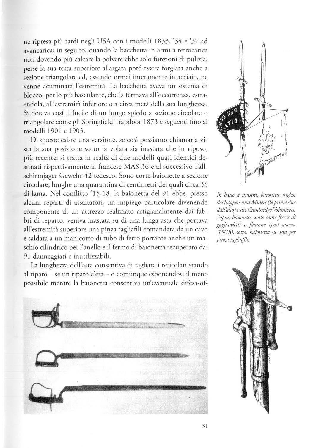 Ma, detro quesro, resta il problema di come nacque e si sviluppò la baionetta militare. Come al soliro ci sono resi var ie e spesso contrastanti. È un discorso vecchio e ripetitivo, ma che non è possibile tralasciare, a beneficio dei neofiti. Gli specia li sti, i collezionisti di li ve llo , gli st udiosi possono saltare a piè pari queste prime pagine.