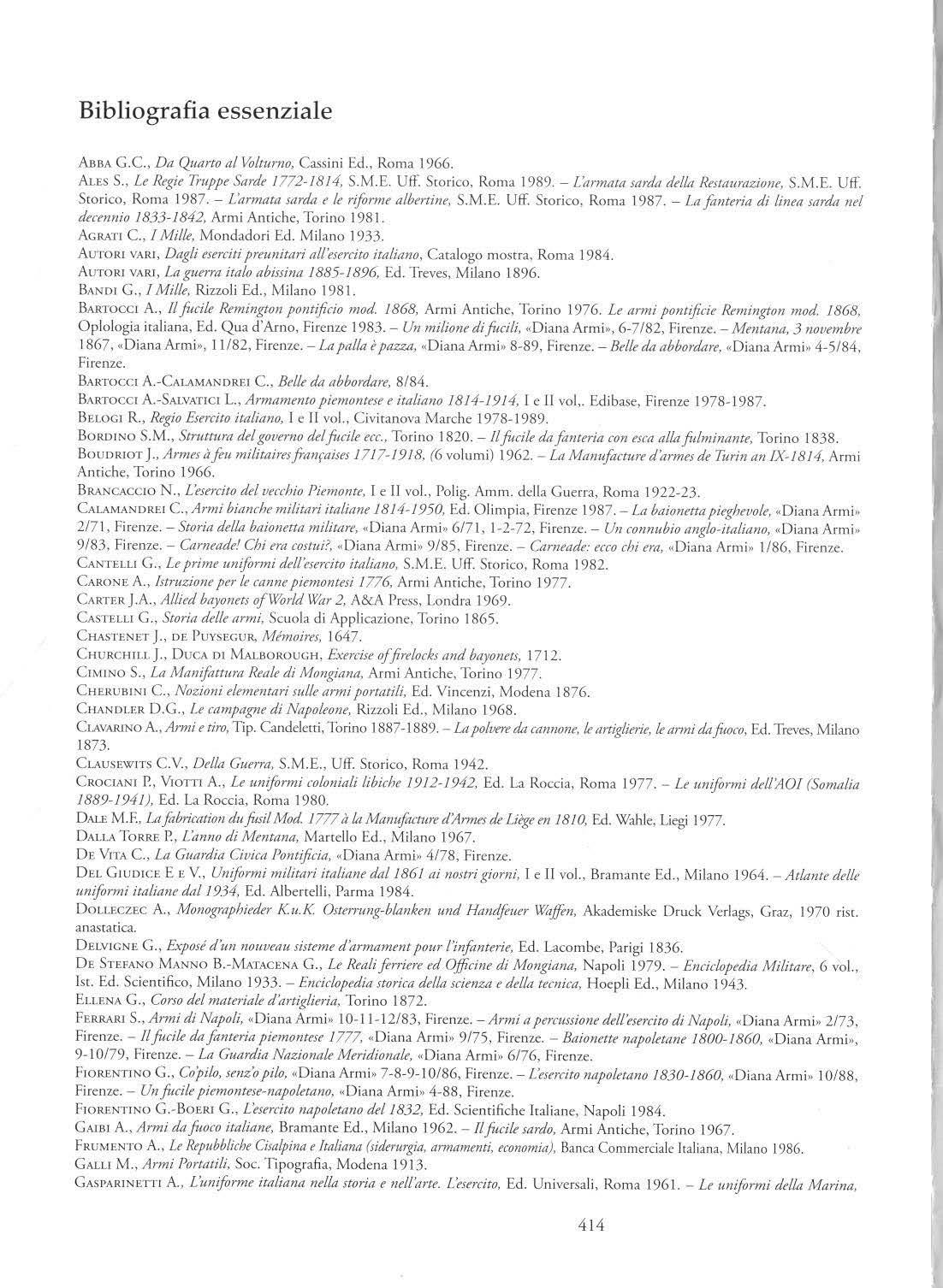 GOBBI U., Carabine napoletane per i bersaglieri, «Taca rm i,, 12/ 78, Milano. - !Lfucile piemontese 1842 a cartella ristretta, «Tacarm i» 8/77 , M ila no. - Storia del fucile piemontese 1860, (e altri), «l àcarmi» 1-4/ 79; 2-4 -8/80, Milano. - Le carabine La Marmora, «Tacarn1i» 3-4- 11/83; 7/84 Mi lano.