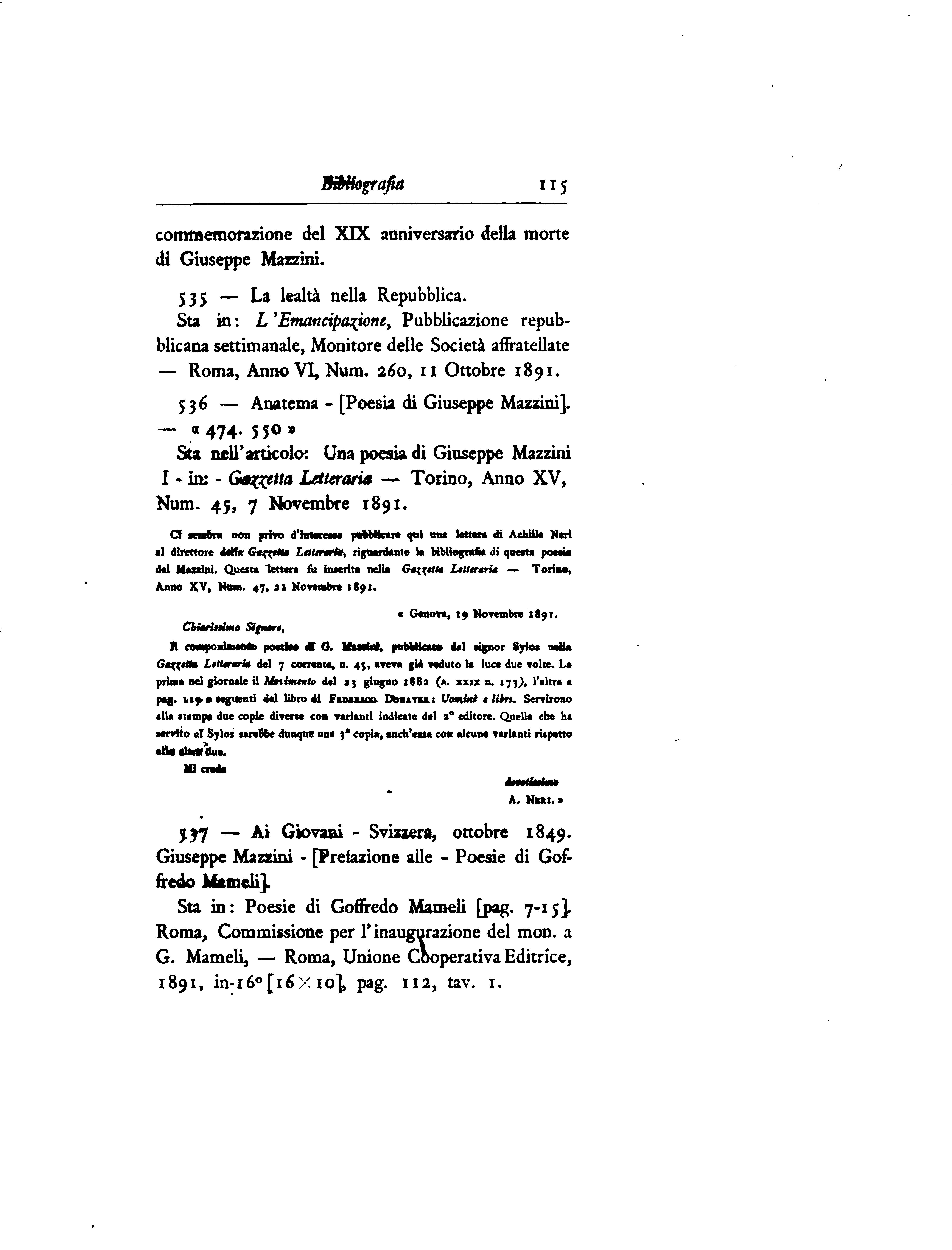 5 3 6 — A n a t e m a - [ P o e s i a d i G i u s e p p e M a z z i n i ] . " " , “ 4 7 4 - 5 5 ° ” S t a n e l l ’ a r t i c o l o : U n a p o e s i a d i G i u s e p p e M a z z i n i I — i n : - G a z z e t t a L e t t e r a r i a — - T o r i n o , A n n o X V , N u m . 4 5 , 7 N o v e m b r e 1 8 9 1 .