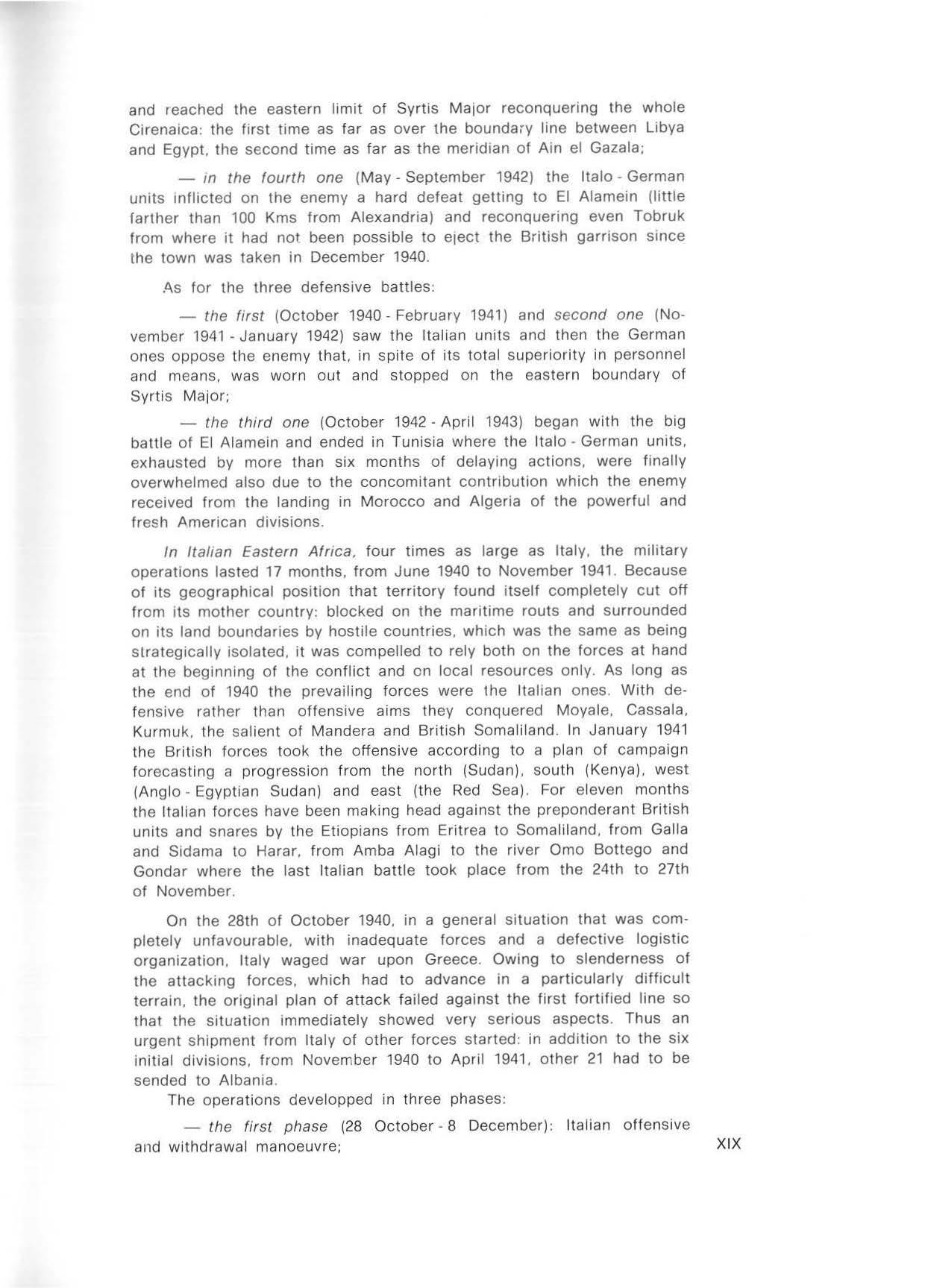 En Africa orientai italiana. ancha cuatro veces mas que Italia. las operaciones militares duraron unos diez y siete meses desde el junio de 1940 hasta el noviembre de 1941. A causa de su posici6n geografica, el territorio se encontr6 aislado por completo de la madrepatria: bloqueado en las vias maritimas. en las fronteras terrestres rodeado por naciones enemigas y por lo tanto estrategicamente asediato, tue preciso confiar solo con las fuerzas disponibles en los comienzos del conflicto y con las recursos locales. Hasta el fina! del ano 1940 prevalecieron las fuerzas italianas que ocuparon con fines mas defensivos que ofensivos a Moyale. Cassala, Kurmuk, el saliente de Mandera y la Somalia inglésa. En enero de 1941, los Britanicos emprendieron la ofensiva con un pian operativo que preveia el avance desde el Norte (Sudan). el Sur (Kenia). el Oeste (Sudan ang lo - egipcio) y el Este (M ar Rojo ). Por once meses las fuerzas italianas resistieron a las preponderantes unidades britanicas. a las que se anadian las insidias de los Etiopes. desde Eritrea y Somalia , desde Galla y Sidanna hasta el Harran desde el Amba Alagi hasta el rio Omo Bottega, a Gondar. en que del 24 al 27 de noviembre tuvo lugar la ultima batalla italiana.