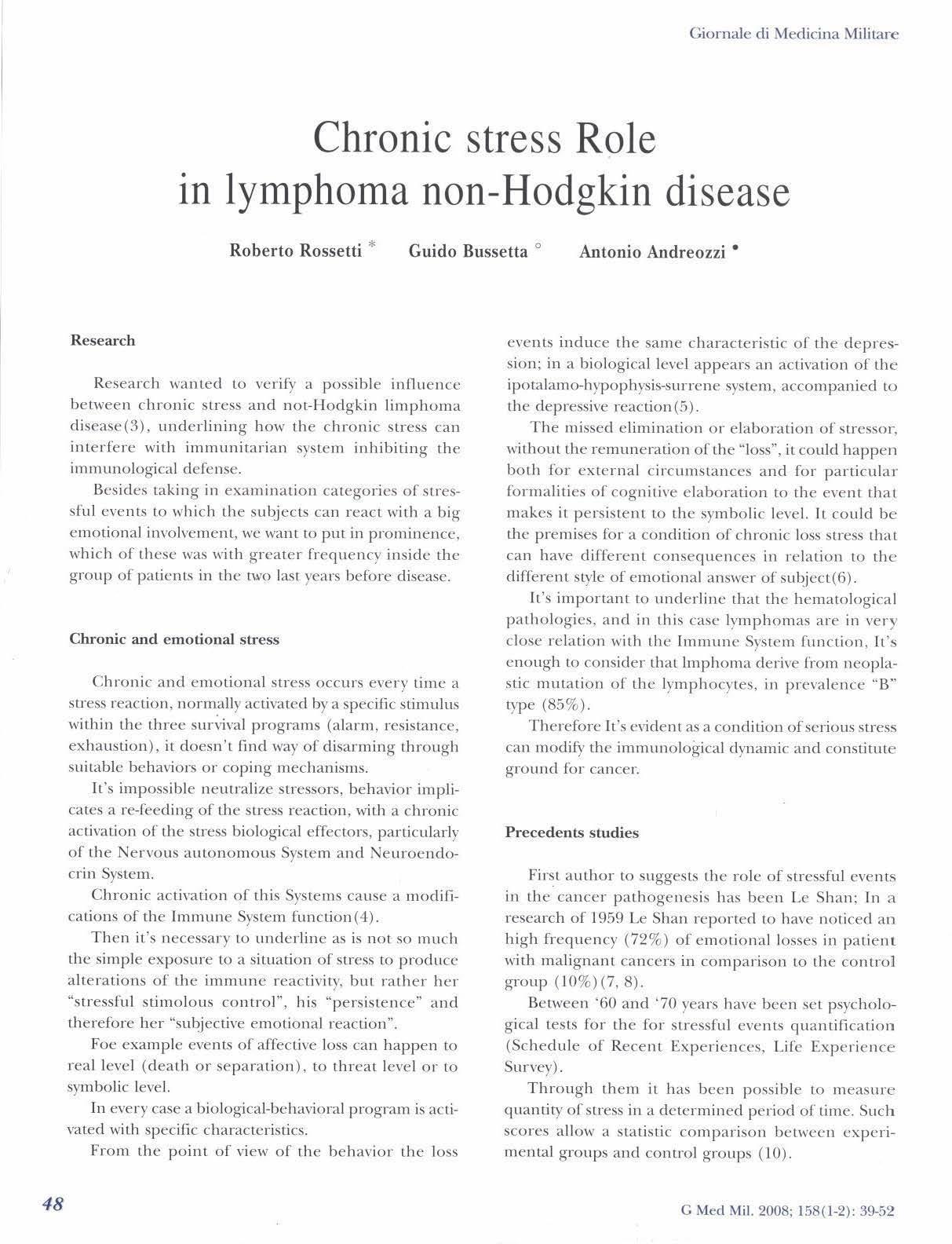 39 Il ruolo dello stress emozionale cronico nell' insorgenza del linfoma non-Hodgkin. *
