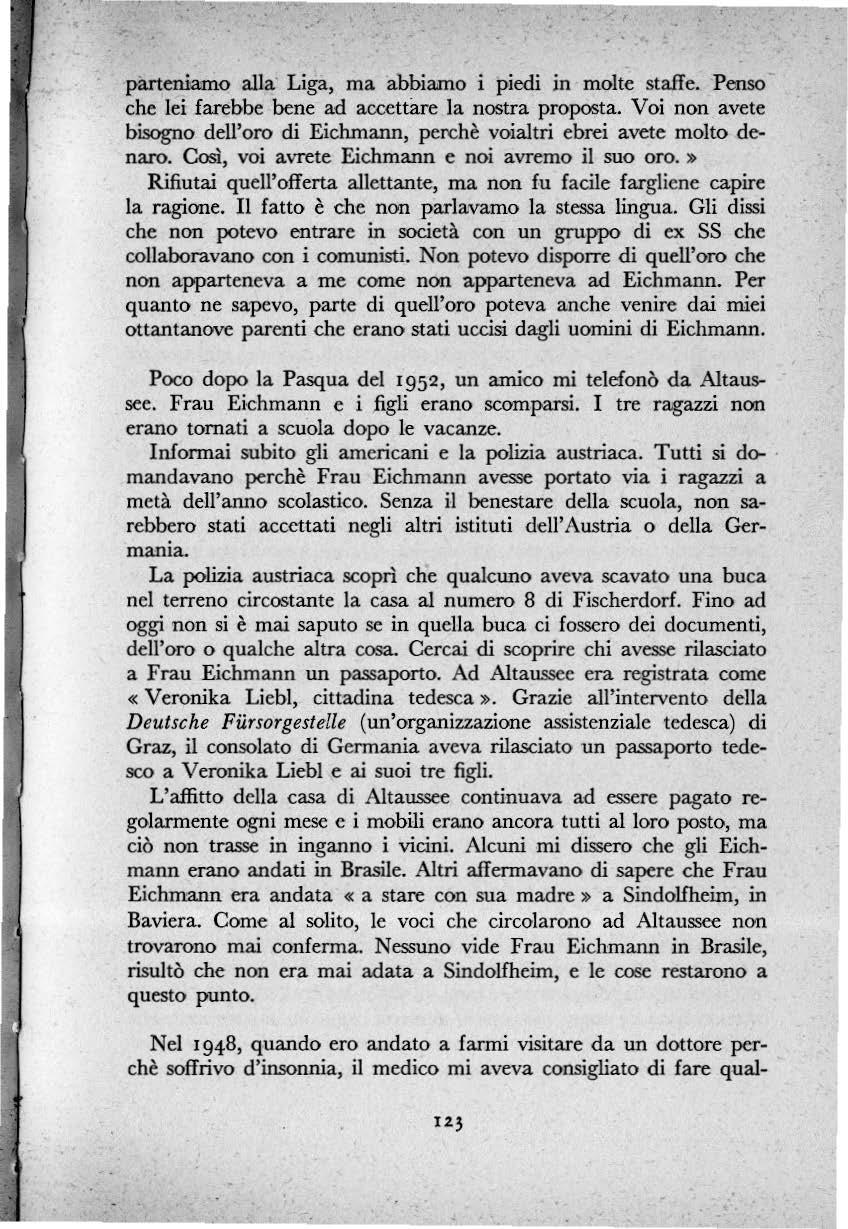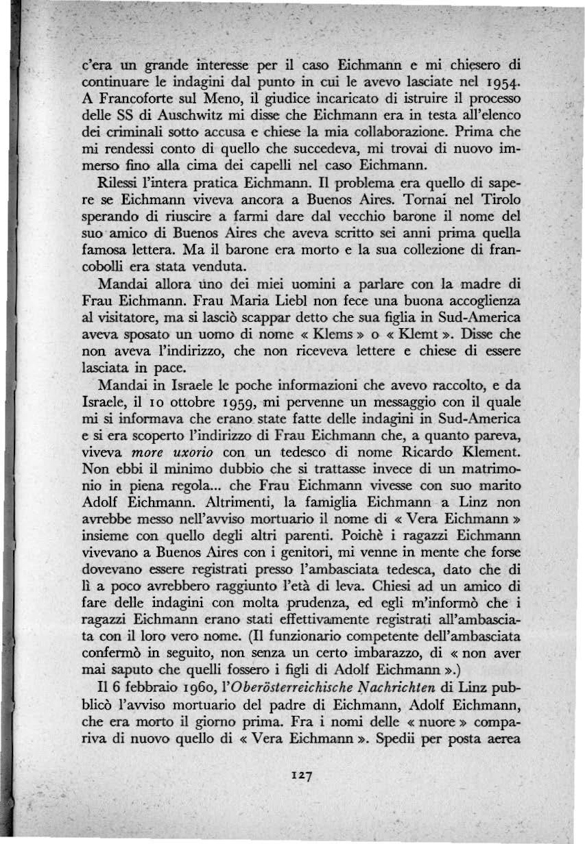 Diss i ai due uomini di tornare da me il giorno dopo poi chè volevo riflettere sulla proposta. Sapevo c he era assolutamente impos.sibile fare un patto del genere con la giustizia. Ma dissi loro che se veramente quell'uomo avesse collaborato alla ricerca e alla cattura di Bormann, si sarebbero potute ottenere al processo le circostanze attenuanti. E io sarei stato disposto a testimoniare davanti alla Corte che quell'uomo aveva realmente collaborato ad assicurare un grande criminal e alla giustizia.