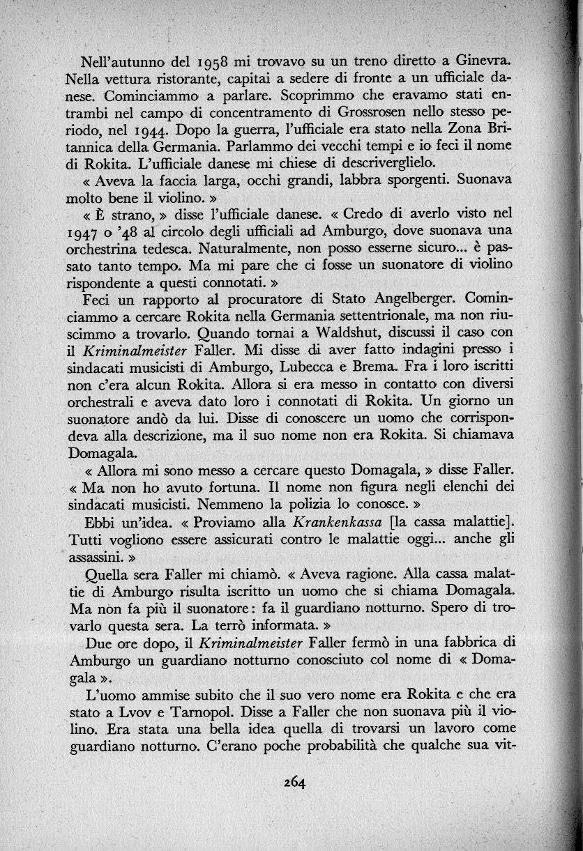 « Gli uomini come Beck e Schmidt furono per me delle prove viventi che era possibile torna.Te dalla guerra con la coscienza pulita, se si voleva, » disse. « Disgraziatamente, per ogni uomo con la coscienza pulita ce n'erano molti che non furono costretti a commettere dei crimini, ma che si offrirono volontariamente di uccidere e torturare. Lentamente, imparai che fra il bianco e il nero c'erano molte sfumat ure di grigio: grigio acciaio, grigio perla, grigio tortora. E c'erano molte sfumature di bianco. Nemmeno le vittime erano sempre innocenti. Una volta parlai con un ebreo che era stato Kapò in un campo di concentramento, dove si era salvato la vita uccidendo un compagno ebreo. Una dannata SS gli disse che sarebbe toccata a lui o all'altro. Il Kapò adduceva a sua difesa che, se non lo avesse fatto lui, qualcun altro avrebbe sparato all'ebreo; e anche lui sarebbe morto. Non accetto questa tesi: un omicidio è sempre un omicidio, chiunque lo commetta. Ogni nazione ha i suoi collaboraz;onisti. Anche npi ebrei li abbiamo avuti, forse meno di altri popoli, ma non siamo tutti angeli. Era stata una trovata diabolica tipica delle SS costringere gli ebrei ad uccidere gente della loro stes-53. razza. »