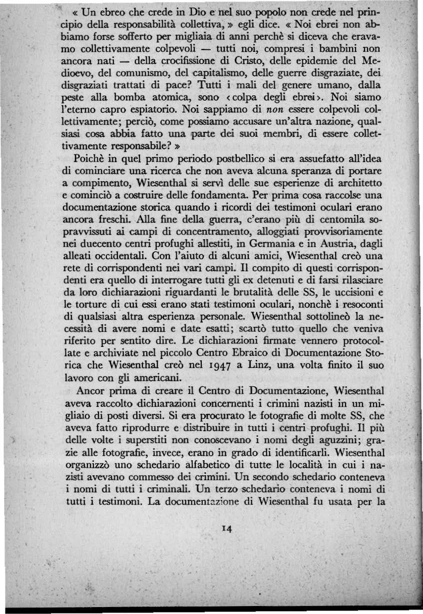 Qualcosa, però, si poteva fare: e questo pensiero si fece strada a poco a poco nelle notti insonni di Wiesenthal. Egli poteva almeno cercare di erigere un monumento simbolico ai morti e forse dare un esempio ammonitore contro eventuali eccessi futuri. Naturalmente, era impossibile punire i delitti in base a una responsabilità rigorosamente controllata. Che importanza aveva se un nazista che aveva ucciso migliaia di persone andava in galera per due anni ... venti minuti per ogni assassinio? La cosa importante era impedire che in futuro ci fossero altri eccidi.