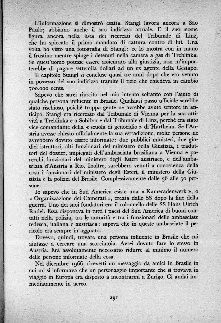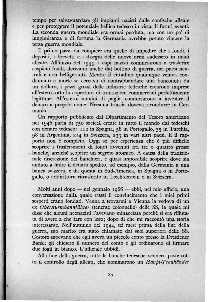 Primo : Grazie ad un amico svizzero, ho preso visione della testimonianza di una donna che è assolutamente certa di avere visto Martin Bormann nel I 956 su un autobus di Sao Paulo, Brasiie. (In seguito la deposizione di costei. fu accuratamente controllata dalle autorità tedesche.) Questa donna aveva conosciuto personalmente ·Bormann a Berlino, e aveva parlato diverse volte con lui alla Can-
