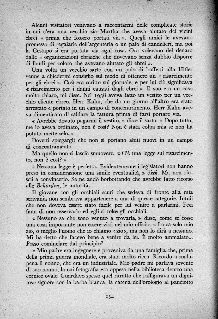 « Se fosrero stati salvati tutti gli ebrei di cui mi fu parlato in quei mesi, ci sarebbero stati più ebrei vivi alla fine della guerra di quanti ce n'erano prima che cominciasse. Dopo un po' non credetti più a quelli che cercavano di convincermi che loro non avevano saputo assolutamente nulla. Forse non avevano conosciuto tutta la verità su ciò che accadeva nei campi di sterminio. Ma quasi tutti avevano notato qualcosa dopo che Hitler aveva invaso l' Austria, l' 11 marzo 1938. Non potevano fare a meno di vedere i vicini ebrei che venivano portati via dagli uomini wn le uniformi nere delle SS. I loro figli, quando tornavano a casa da scuola, raccontavano che i loro compagn i ebrei erano stati cacciati via. Vedevano le svastiche sulle vetrine infrante dei negozi ebrei saccheggiati. Non potevano ignorare le macerie delle sinagoghe incendiate nella notte del 9 novembre 1938. 1 La gente sapeva quello che stava succedendo, sebbene molti avessero paura e pref~ guardare altrove per non vedere troppo. Soldati e ufficiali in licenza dal fronte orientale parlavano spesso dei massacri degli ebrei che avvenivano colà. La gente sapeva molto più di quanto volesse ammettere, ed è per questo che oggi molti provano un acuto senso di colpa. »
