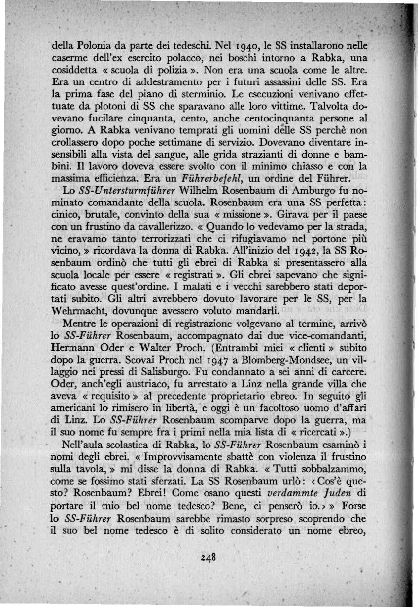 sibile punire tutti i crimini nazisti. Prendiamo - il caso di Auschwitz: almeno 6ooo uomini vi lavorarono, in periodi diversi, come guardie, personale tecnico addetto alle camere a gas e ai forni crematori, medici, impiegati. Solo di goo si conoscono i nomi Circa 300 furono consegnati ai polacchi, e dei restanti 6oo si conosce il nome e l'indirizzo di una metà appena, ma per ognuno di essi non si troverebbe un solo testimone disposto a deporre in tribunale. Nel campo di concentramento, le vittime non sapevano i nomi dei loro carnefici. Alcuni grossi criminali erano conosciuti: i Mengele, gli Stangl. Ma le anonime ruote nell'ingranaggio dello sterminio, gli uomini insignificanti che uccidevano, che aprivano le manette del gas, che iniettavano dosi letali di acido fenolico ... dove sono adesso? Vanno in giro liberi, e forse godono miglio:- salute e dormono meglio di quell e fra le loro vittime che sono sopravvissute.