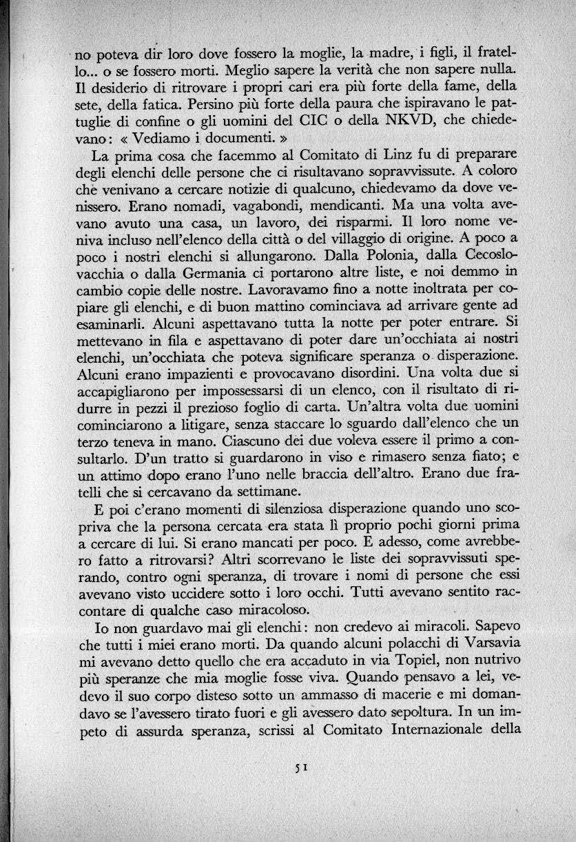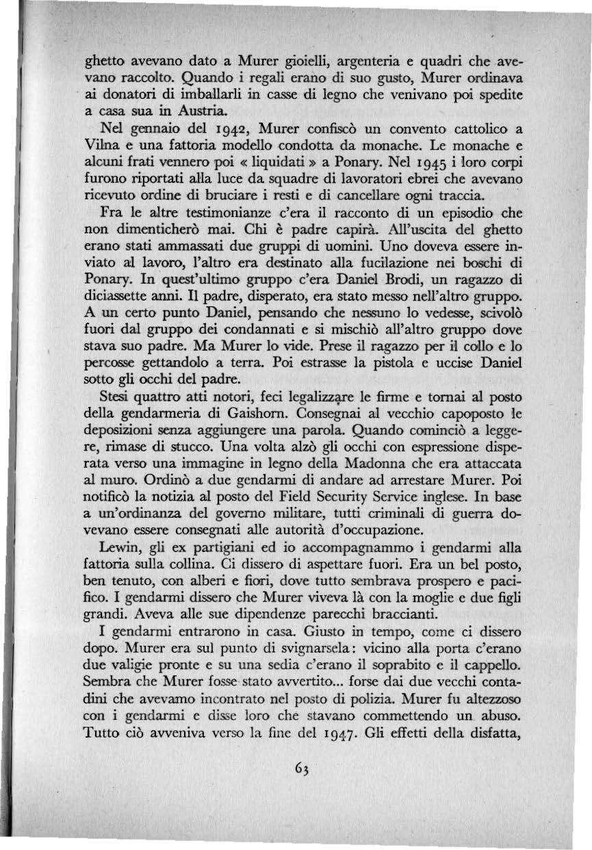 fissando il pavimento. « Molta gente mi ha fatto questa domanda, » disse. « I miei amici dicono: < Perchè ti torturi con queste c05C? > Quelli che non mi sono amici dicono senza tante ambagi : <Che bisogno ha di frugare nel passato, di accumulare nuov9 odio su quello vecchio?> Porchè non torno a costruire case come facevo prima della guerra? Avrei potuto andare in America, condurre una vita normale e far quattrini. » Scrollò le spalle. « t inutile. Lo faccio perchè devo farlo. Non sono spinto da un sentimento di vendetta. Forse lo fui por breve tempo, proprio all'inizio. Alla fine della guerra, quando venni liberato dopo aver passato quattro anni in più di dodici campi di concentramento, mi era rimasta ben poca forza fisica, ma avevo un gran desiderio di vendetta. Avevo perso tutta la famiglia. Mia madre era stata portata via sotto i miei occhi. Credevo che mia moglie fosse morta. Non avevo nessuno per cui vivere.