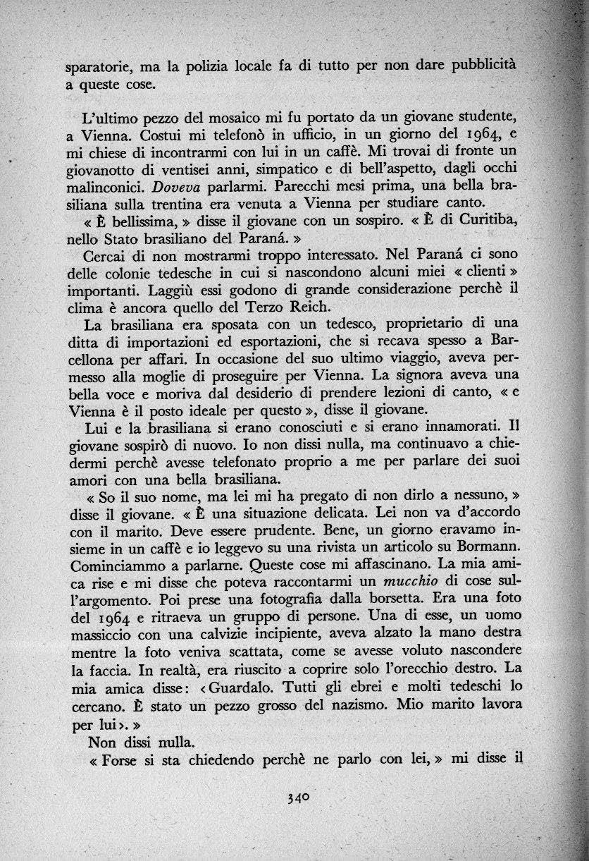 « Esattamente. E lei potrebbe procurarsi l'indirizzo di Borrnann a Curitiba. La mia amica glielo darà... Lei non desidera che una cosa: vivere con me in Europa. »