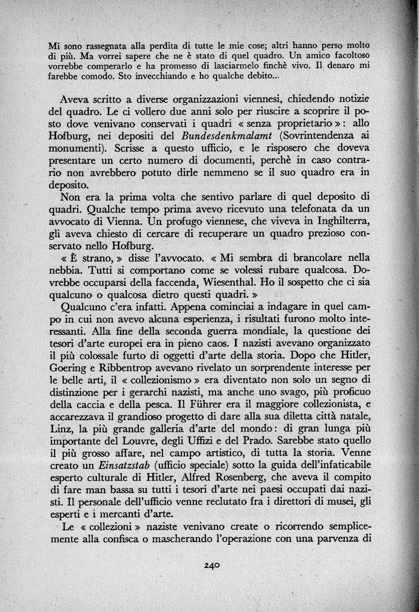 L'atm06fera spartana che avevo già notato entrando, la ritrovai nell'ufficio di Wiesenthal: u111a gr.ainde scrivania con molte cartè, un paio di sedie, un vecchio divano senza pretese. La parete di fondo della stanza era tappezzata da scaffali di libri. WiesenthaA -possiede una delle migliori biblioteche sulla storia, l'organizzazione e le attività delle SS di Heinrich Himmler. Create in origine come reparti speciali per la protezione di Adolf Hitler, di Himmler e degli altri capi nazisti (SS signifioa Schutz-Staffel o Guardia di sicurezza), le SS in ~niforme e stivali neri divennero il corpo sc elto nazista, dopo la sanguinosa purga, ordinata da Hitler nel 1934, delle SA o SturmAbteilungen (Truppe d'assalto) in camicia bruna, di Ernst Roehm. 1