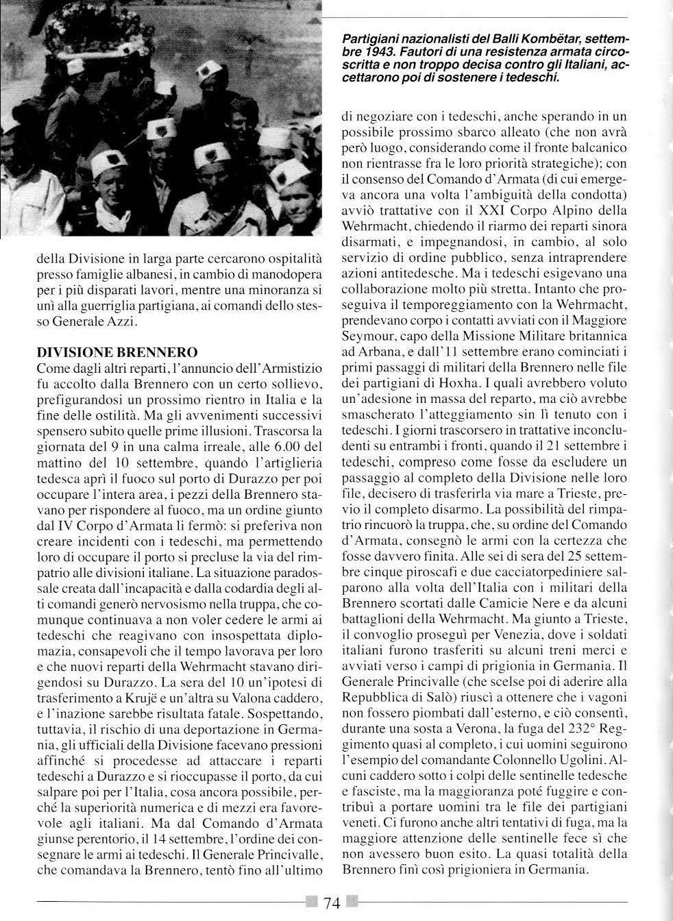 rit e <.lèl Gòliko, furono atta(.'cate il 16 aprile dalla Divi ione Ferrara. che riuscì a sopraffare la 1enace rc).i~tcna1 nemica sol ta nto ci nqu e giorni più 1ardi. Apcrta!ii fin al mcmc la ~1rada , er!>O la Valle del O rino. la Di vii.ione poté schieran,i fra ArgirocasLro e Libohovc. Qui rima e fino al me e d i agos10. qua ndo fu ridislocata fra Elba an. Valon a e Tirana. li 19 apri le. dal la Valle de l Orino. giunse ad Arg iroc astro an c he la Div is ione Casa le, c he in seg uiva i repa rt i grec i e li aveva affrontat i s ul fiumc Ca rdi g u ; il reparto pro seg uì la marcia verso s ud. e ntrand o in Grecia il 22. schieran d osi p rim a ne ll a i'om1 di Kani D elvina ki . e poi. dal 1942. fra i golfi di Arta e di PaLrasso. do,e rim ase fino a11'8 ettembre del ·43_ Dalle ve n e del G òliko . approlìuando dello i.fondamento effe11u ato dalla Ferrara. si mo!>se alla me1à di aprile a nche la Julia. che aurave r ~ò tuua l'Albania pe r a rri va re . dopo il 23. in territorio g re co , nel Pe lo po nn eso . Vi rimase. con compi ti d i co ntro ll o de l ter rit or io, rin o al marzo dell"ann o s uccess i vo. qu a nd o fu ri c hiamata in ltalia pe r la riorgan izza zio ne. prima de ll' invio s ul front e or ie ntal e nel lu g li o de l '4 2. li 19 a prile anche la Di vis i o ne Pu s te ri a pot é muoversi dalle posi zion i di Ma li Spadarit. dove era fe rma da marLo.dirigendosi a ud vcr<;o Leskovik. nella valle de lla Vo}ussa. a pochi chi lome tri dal co nlìnc greco. Fu un a marci a -;en7a resis te nza nemi ca e iÌ 23 a prile.giornodell'armi s ti l io la Divisio ne entrò in Grecia fi ssa nd o il Qu a rti e r G e nerale nella c ittadina di Stratsami. Qua tt ro g iorni dopo. però, ru ri c hiamata in Alba ni a e in lug lio tra sfe rita in Montenegro.dove sarebbe rima s ta f'ino all'agos to del ·42 quando fu schiera ta in Alta Sa vo ia. La Di visio ne Ma rche, l'ultimo repart o arrivato in AJbania. il 20 a prile varcò se nza particolari difficoll~ il confine jugos lavo . attestandosi fra Ragusa. Trebinjc. Bileca . Mo s tar e su lle i ole di Meleda e Curzola ami stant i la co5ta dalmata. R imarrà in Jugoslavia fino a i tragici giorni del se tt embre 1943.