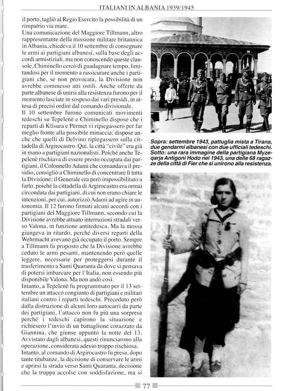 C'era . infine. il pres idi o cl i Dura zzo . comandato dal Magg io re Ab az Kup i , c he disponeva di un batta g lion e Guard ie di Front ie ra, uno de ll a Gendarmeria Reale. un plotone di fanteria di marina . un a co mpa g ni a del gen io. e sei ca nn o n i. o ltre alla s taz io ne radio. Non si tra tt ova. quindi. di un eserc ito particolarmente be n equipaggia to e temibile forte di appena IS.600 uomini e 29.000 riservisti . In ogni caso. a seguito della fuga del Re e del governo e del cao~ in cui era precipitare il Paese. no n sparò un colpo contro i :-.oldati italiani. i quali sin dal primo giorno. appena barcati. ebbero ubito la en~azione di dover compiere un'impresa assai semplice. osservando quell'a:-.soluta mancanza di reazio ne. Si ebbero o lrnnt o isolati episodi di reis tenza . quasi sempre da pane di civil i . raramente per iniziativa personale di pochissimi so ldati. Fra i pochi c i fu il Sergente di Ma rin a Mujo Ulqinaku. c he a Durazzo s i mise a capo di un gruppo di marina i s band ati arma ti di un a so la mitrag l iatri ce Prima di venire ne u tralizzato. iI g ruppo infli sse alcune perd it e ag li italiani. U lqinaku fu uc c iso da u na g ra n ata, e anco ra ogg i un mo n ume n to lo ricorda a Du razzo. Appena fuo ri Va lo na . a lc u ne im bosca te te se da irregolari contro le pauu g lie de i Be rs ag lie r i Mot oc ic li s ti ca usa rono a lc un e v ittim e. Ma furono que5ti g li uni c i ep iso ui di "rc:-io; te nza" d i un a s ia pur minima rilevanza.