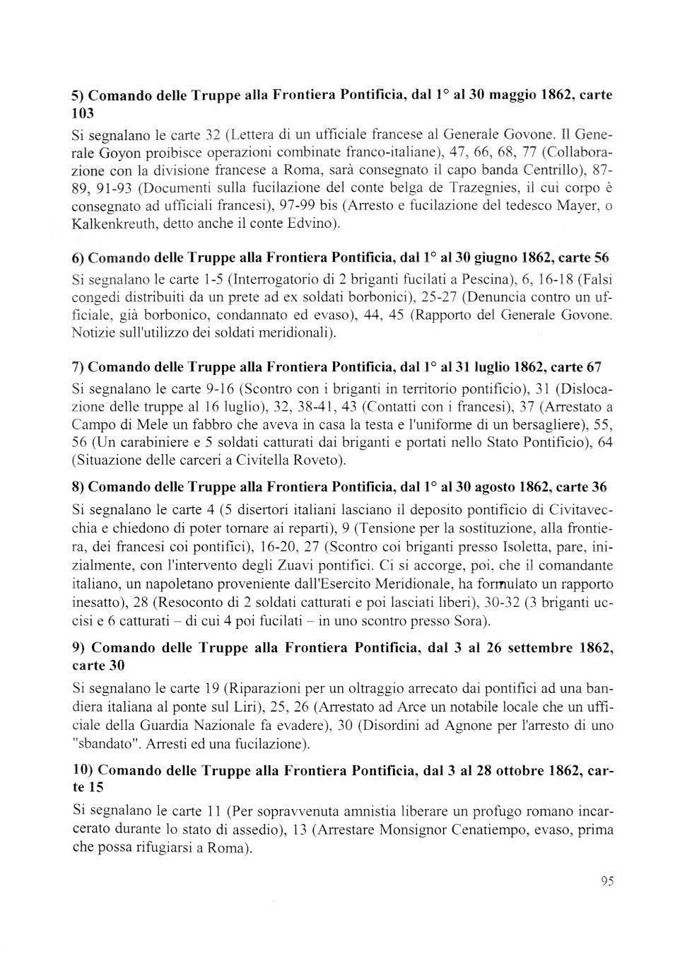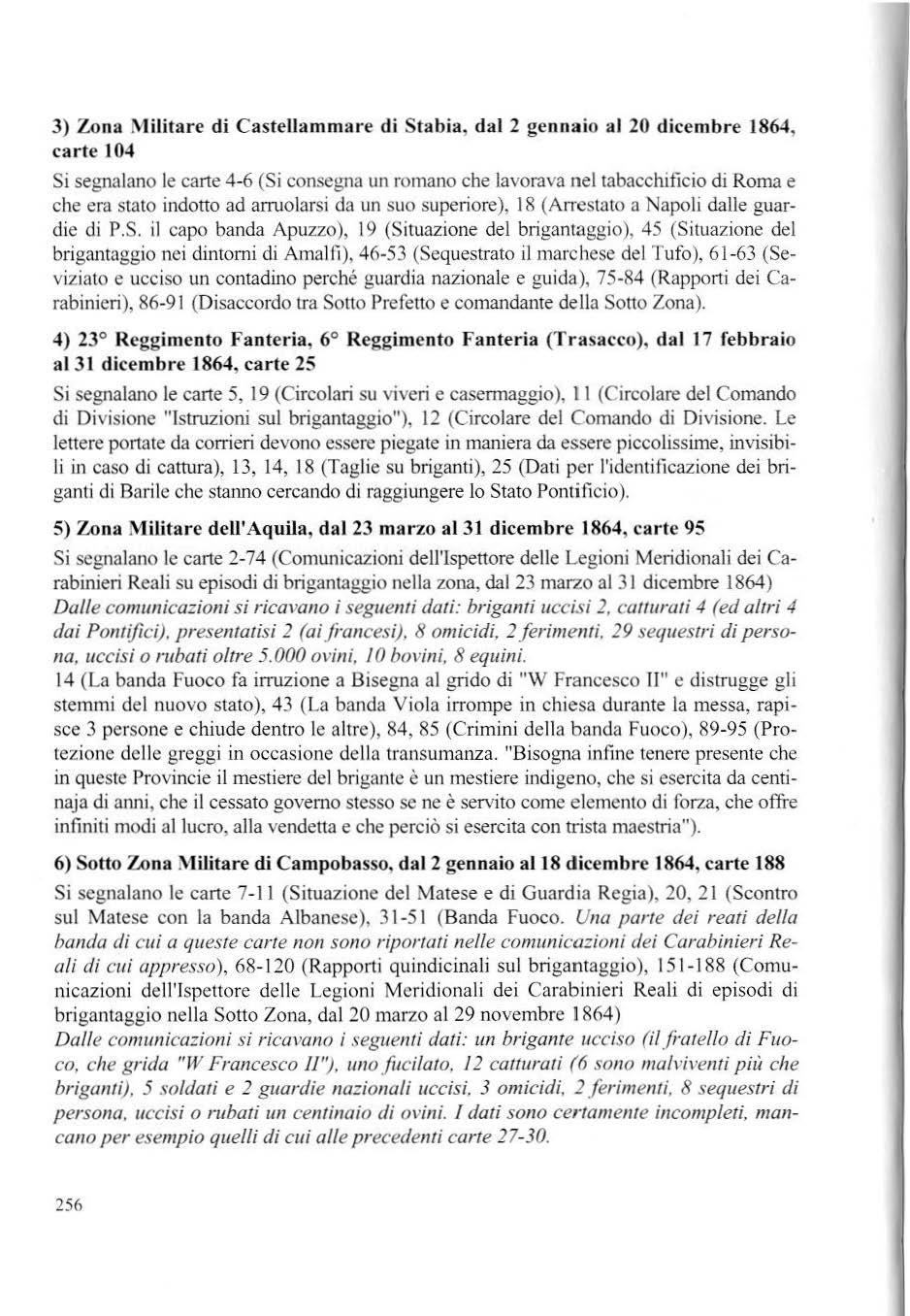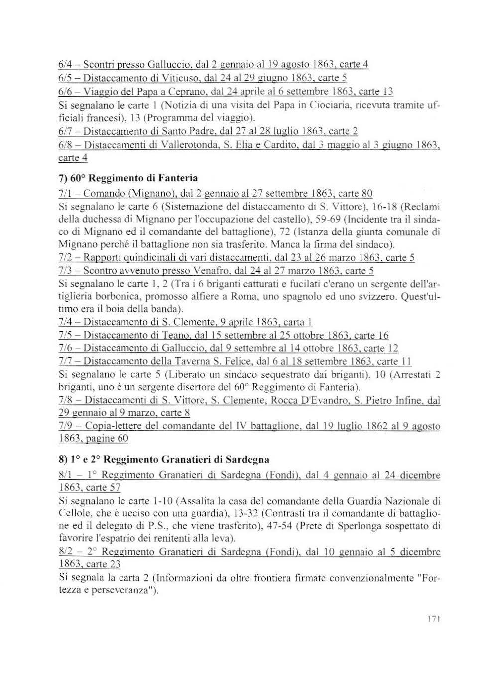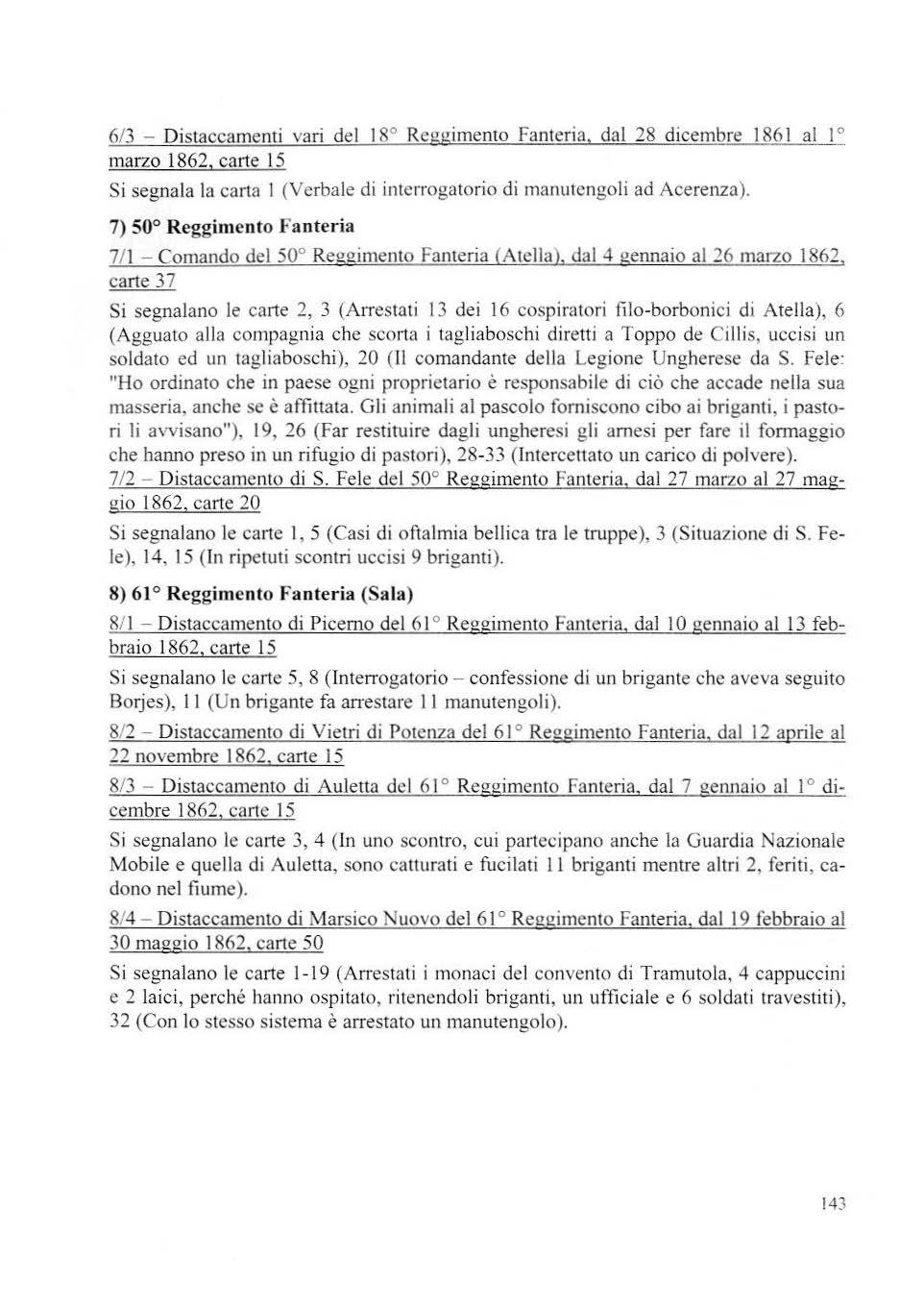 Il risultato di questo lavoro è o ra disponib il e, preceduto da un saggio che intende me tt e re a fuoco g li aspett i che emergono dalla conoscenza, nel suo insieme, de l fondo , quali le mo da li tà operative, i risvolti di carattere lega le e g iud izia ri o , i rapporti con le autor ità politiche locali e con la magistrat ur a, la v ita quo t id iana del soldato in distaccamento o in guarn ig ione, le condizioni sanitarie, il comportamento dei brigant i e delle popo lazio ni e la rilevanza attribuita dal governo a possibil i, se non probabili, complicaz ioni di carattere internazionale che sarebbero potute derivare da un eve ntuale passaggio della fro nt iera da parte di membri d ella fam ig li a rea le borbonica in esilio a Roma.