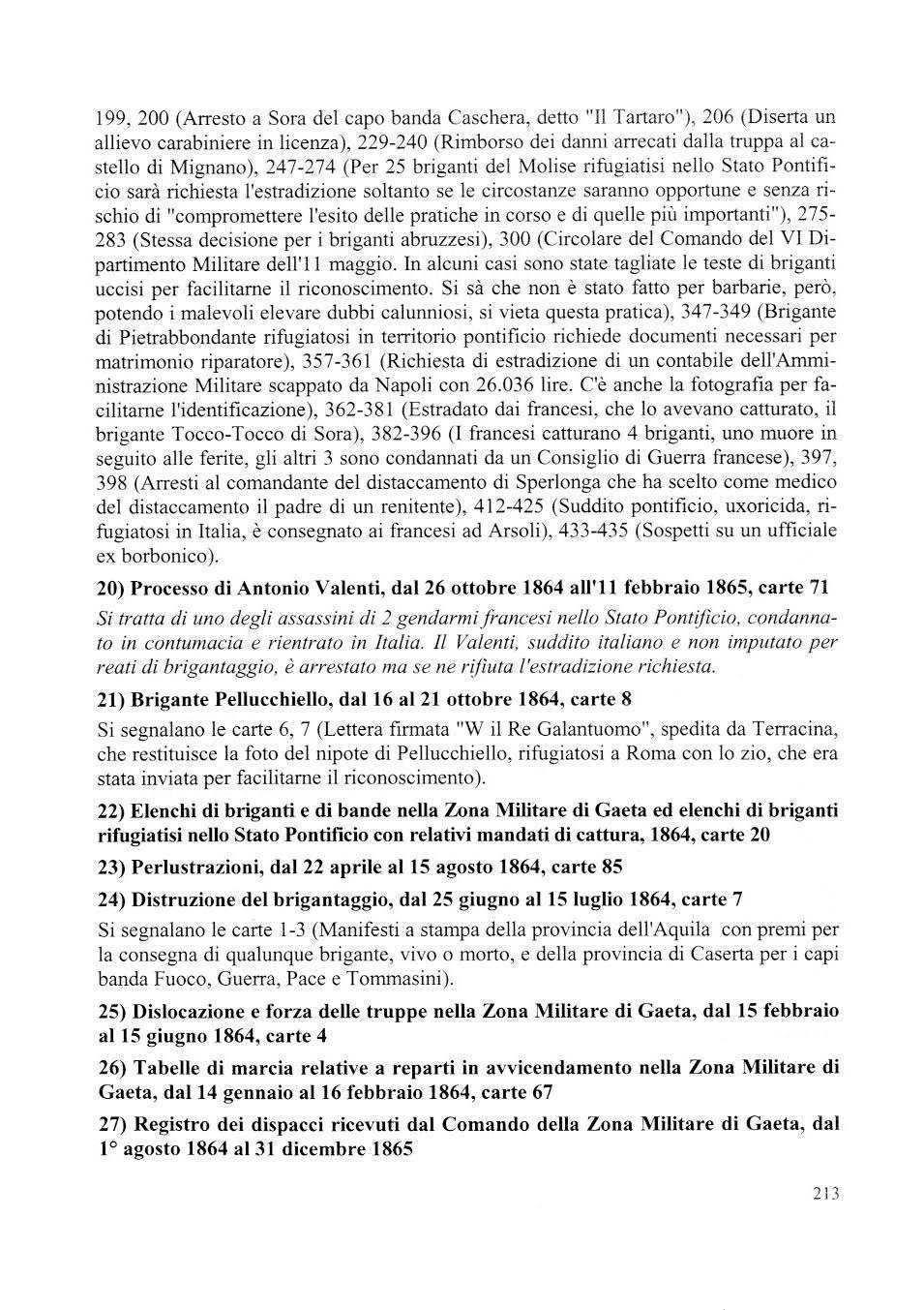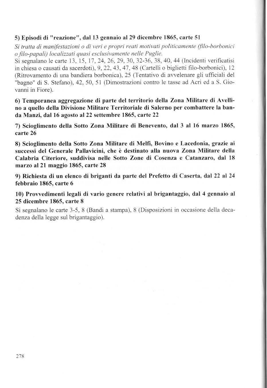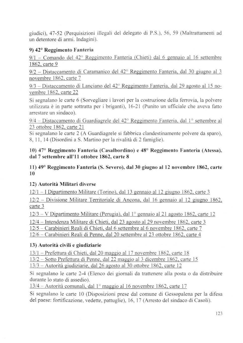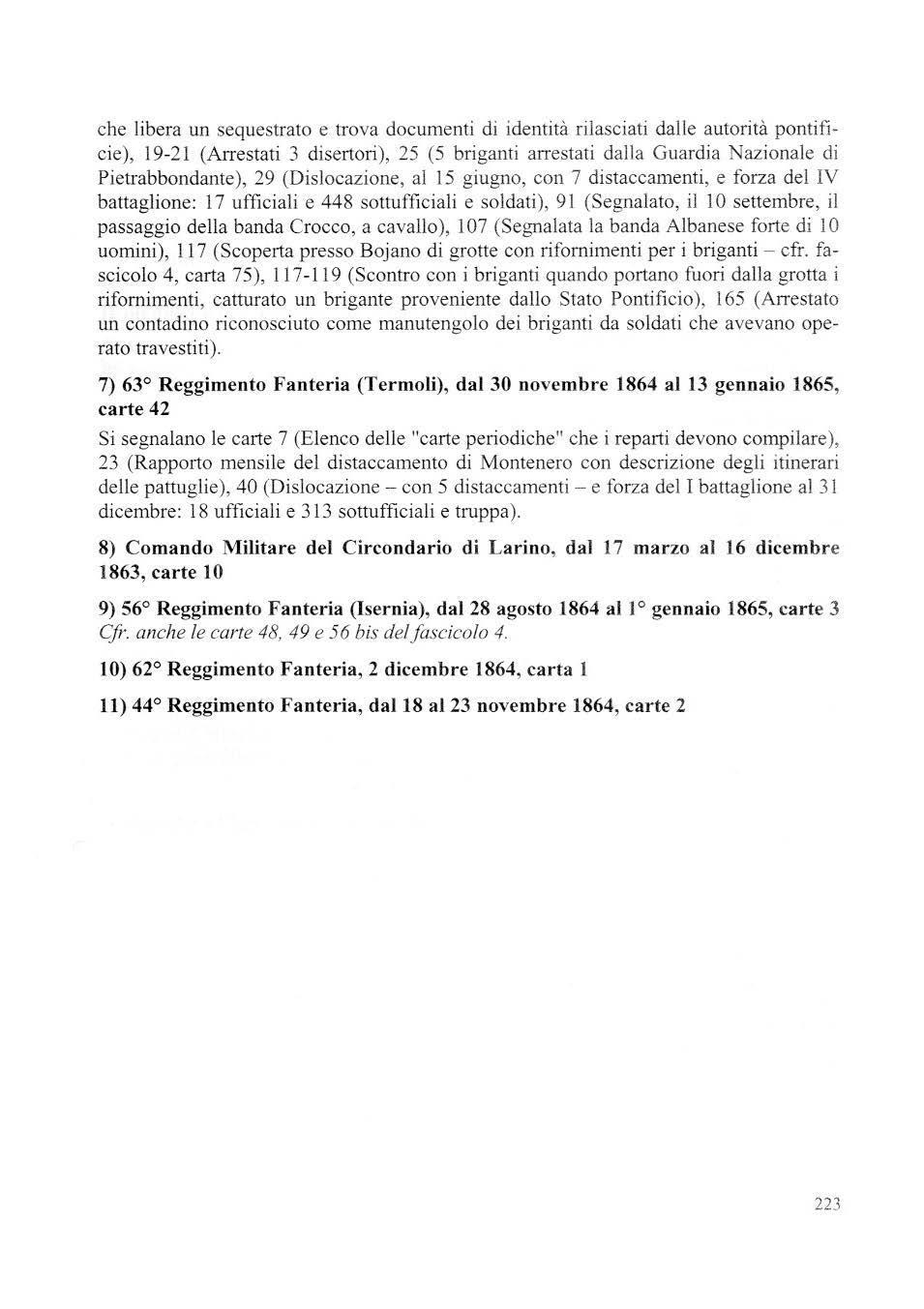 Il risultato di questo lavoro è o ra disponib il e, preceduto da un saggio che intende me tt e re a fuoco g li aspett i che emergono dalla conoscenza, nel suo insieme, de l fondo , quali le mo da li tà operative, i risvolti di carattere lega le e g iud izia ri o , i rapporti con le autor ità politiche locali e con la magistrat ur a, la v ita quo t id iana del soldato in distaccamento o in guarn ig ione, le condizioni sanitarie, il comportamento dei brigant i e delle popo lazio ni e la rilevanza attribuita dal governo a possibil i, se non probabili, complicaz ioni di carattere internazionale che sarebbero potute derivare da un eve ntuale passaggio della fro nt iera da parte di membri d ella fam ig li a rea le borbonica in esilio a Roma.