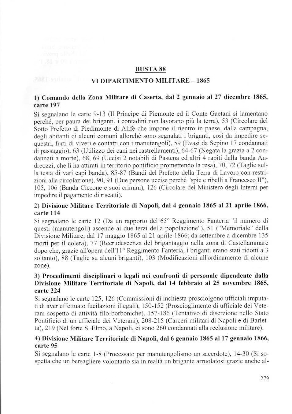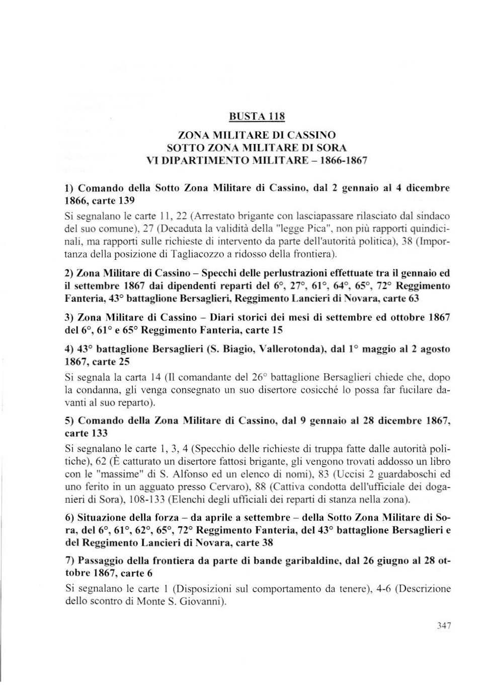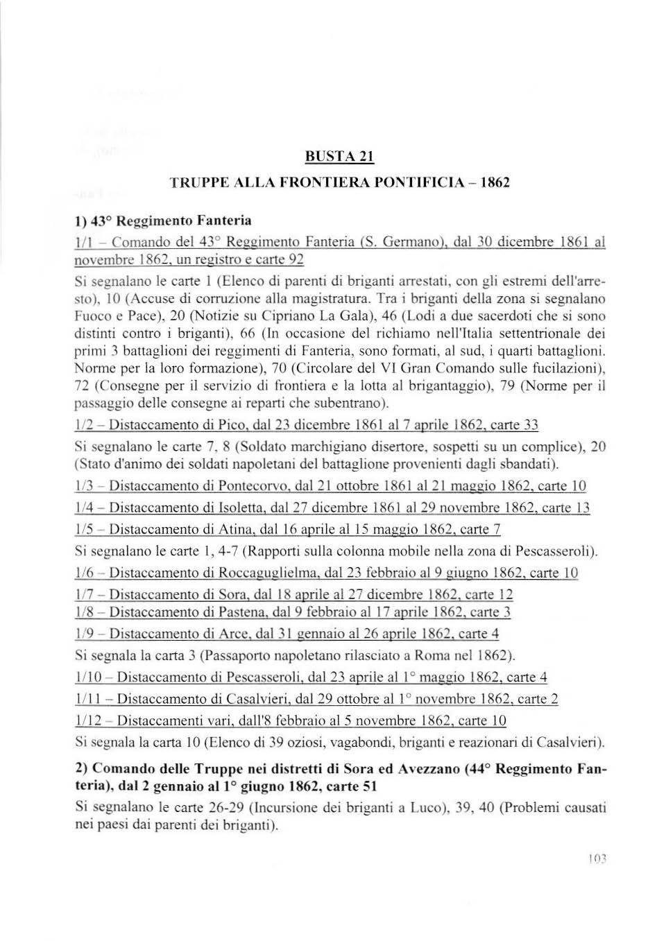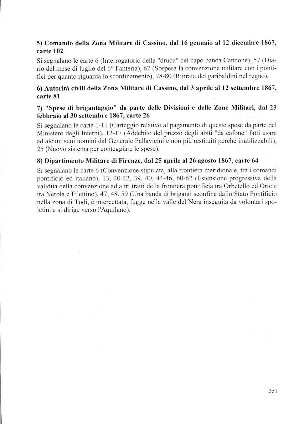 Il risultato di questo lavoro è o ra disponib il e, preceduto da un saggio che intende me tt e re a fuoco g li aspett i che emergono dalla conoscenza, nel suo insieme, de l fondo , quali le mo da li tà operative, i risvolti di carattere lega le e g iud izia ri o , i rapporti con le autor ità politiche locali e con la magistrat ur a, la v ita quo t id iana del soldato in distaccamento o in guarn ig ione, le condizioni sanitarie, il comportamento dei brigant i e delle popo lazio ni e la rilevanza attribuita dal governo a possibil i, se non probabili, complicaz ioni di carattere internazionale che sarebbero potute derivare da un eve ntuale passaggio della fro nt iera da parte di membri d ella fam ig li a rea le borbonica in esilio a Roma.