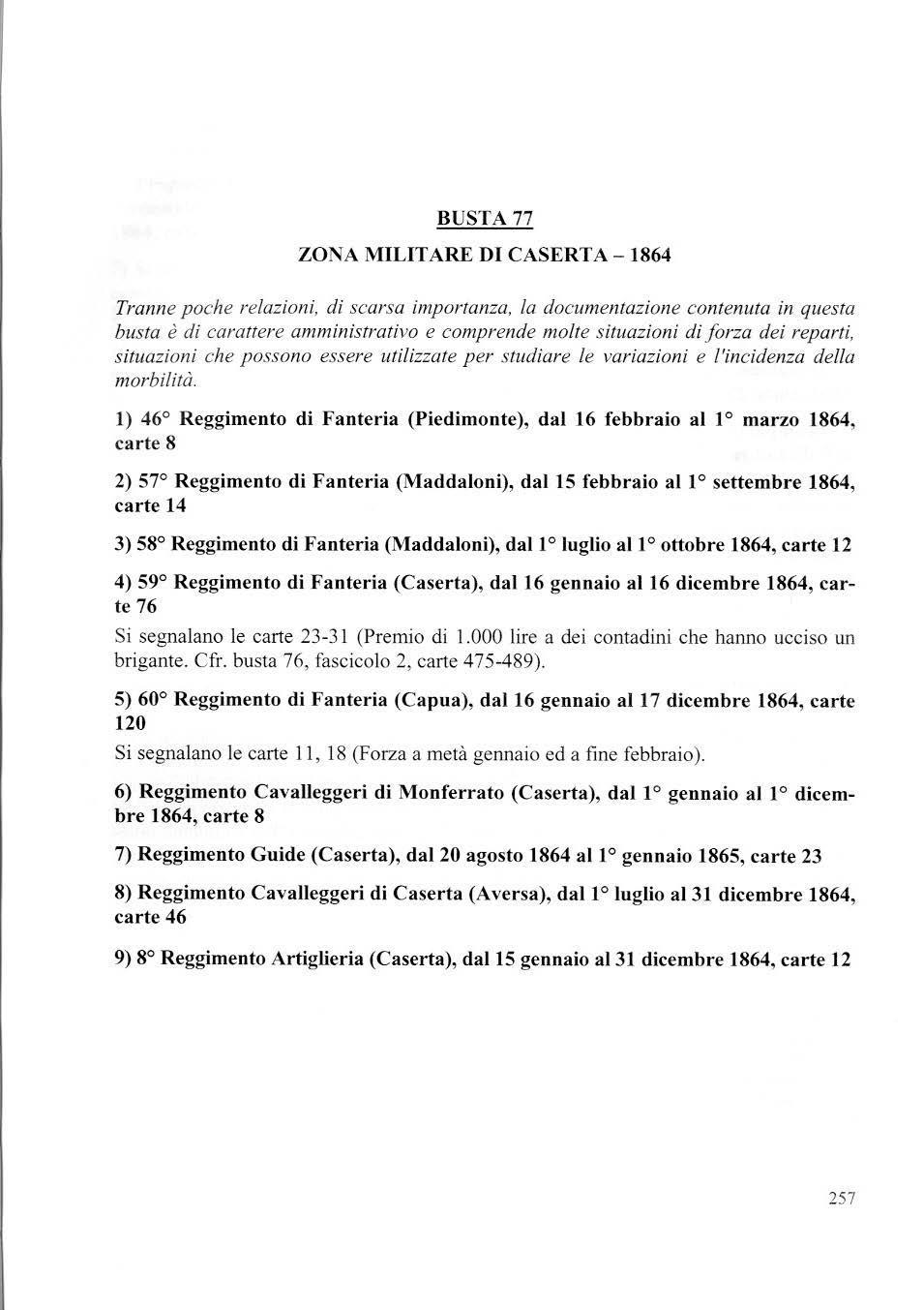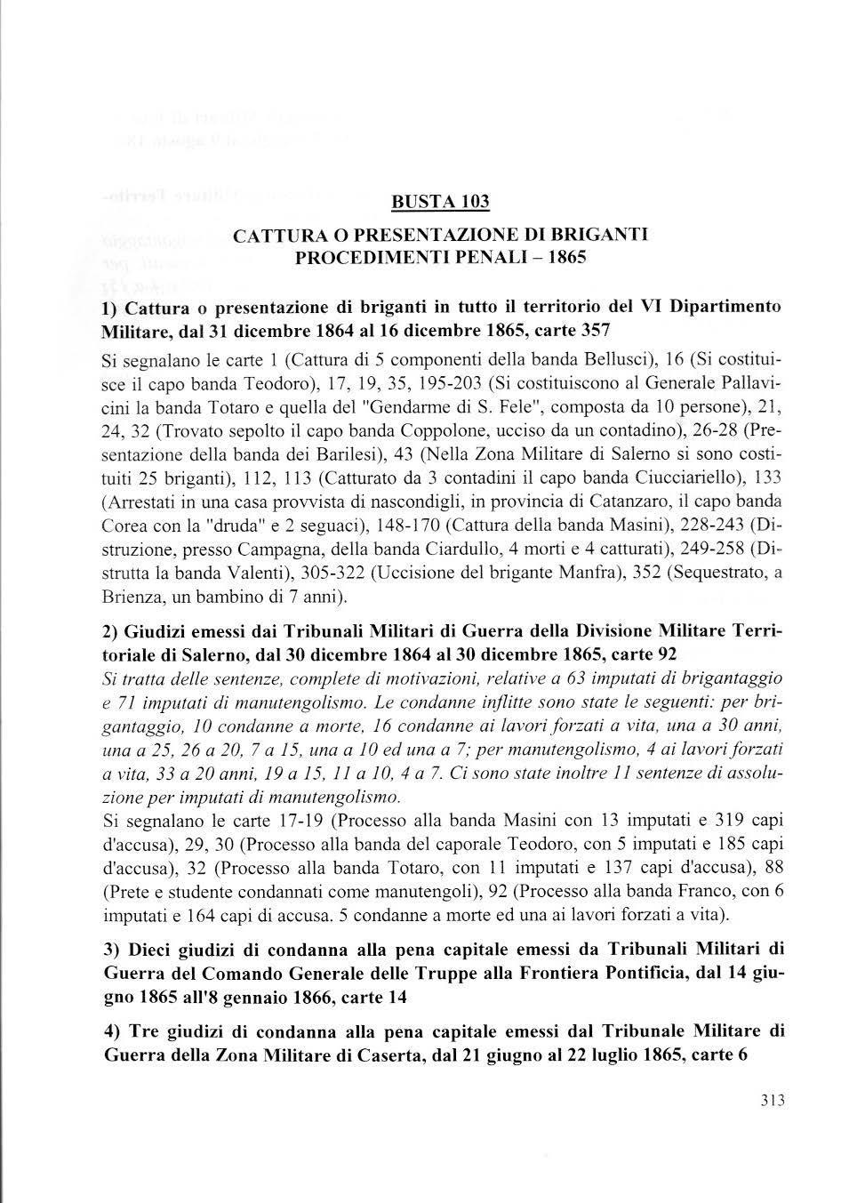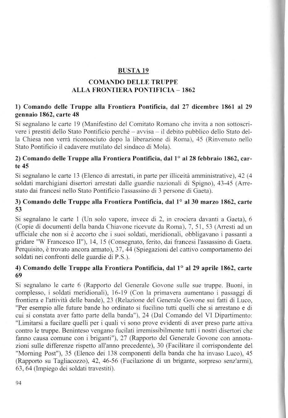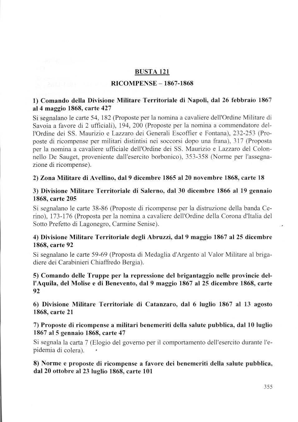 Il risultato di questo lavoro è o ra disponib il e, preceduto da un saggio che intende me tt e re a fuoco g li aspett i che emergono dalla conoscenza, nel suo insieme, de l fondo , quali le mo da li tà operative, i risvolti di carattere lega le e g iud izia ri o , i rapporti con le autor ità politiche locali e con la magistrat ur a, la v ita quo t id iana del soldato in distaccamento o in guarn ig ione, le condizioni sanitarie, il comportamento dei brigant i e delle popo lazio ni e la rilevanza attribuita dal governo a possibil i, se non probabili, complicaz ioni di carattere internazionale che sarebbero potute derivare da un eve ntuale passaggio della fro nt iera da parte di membri d ella fam ig li a rea le borbonica in esilio a Roma.