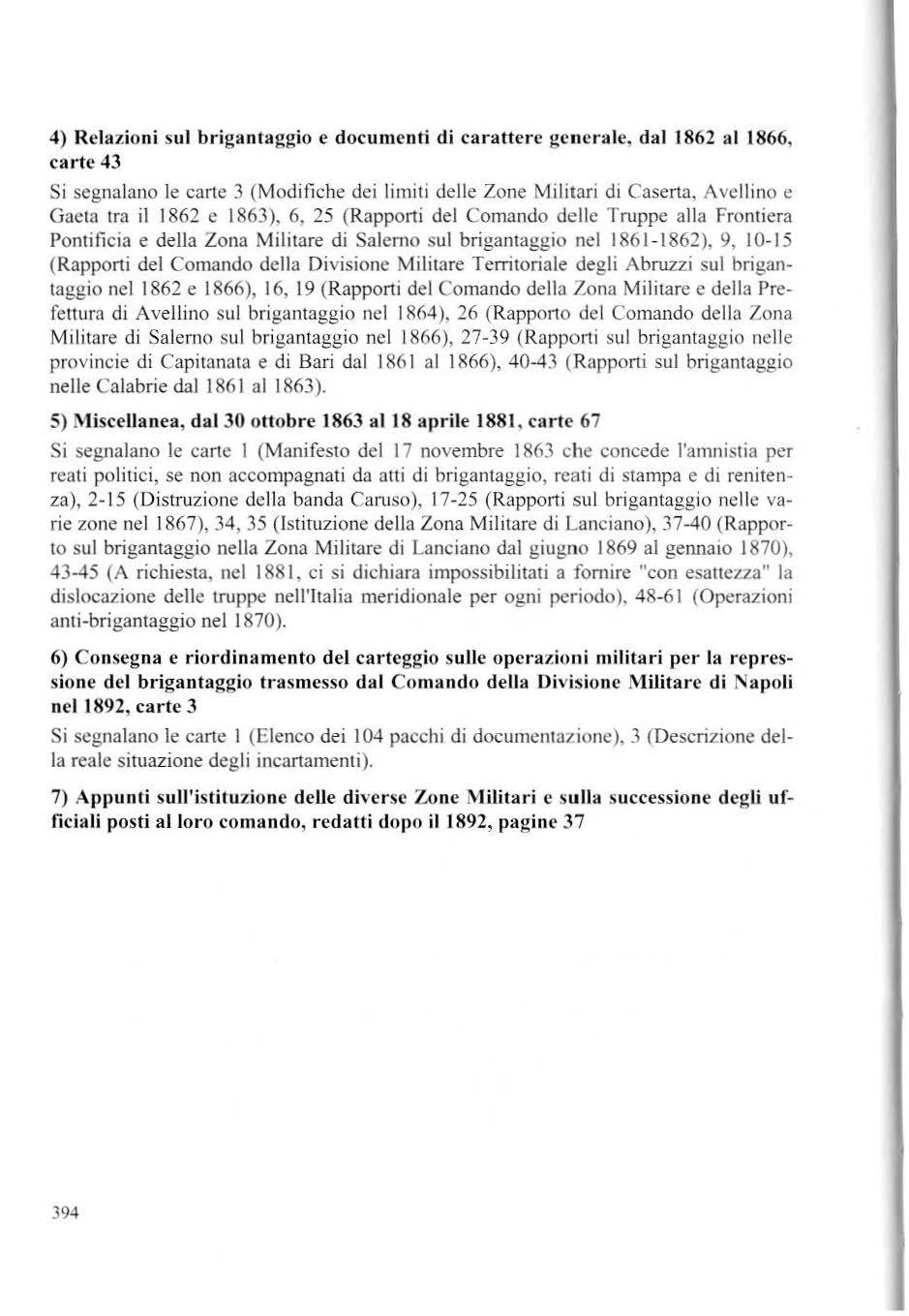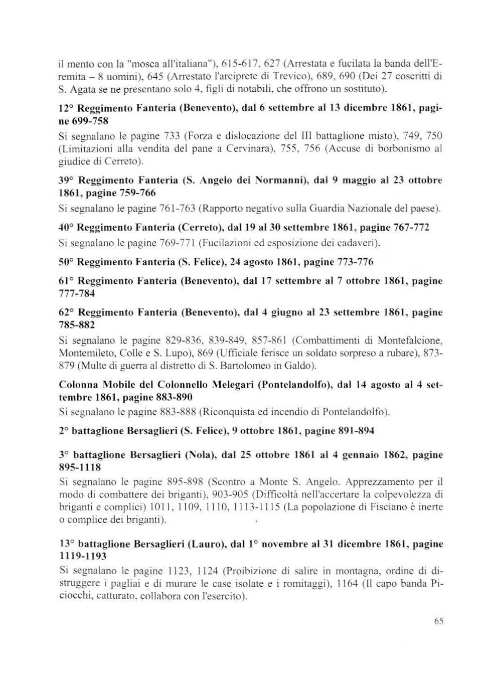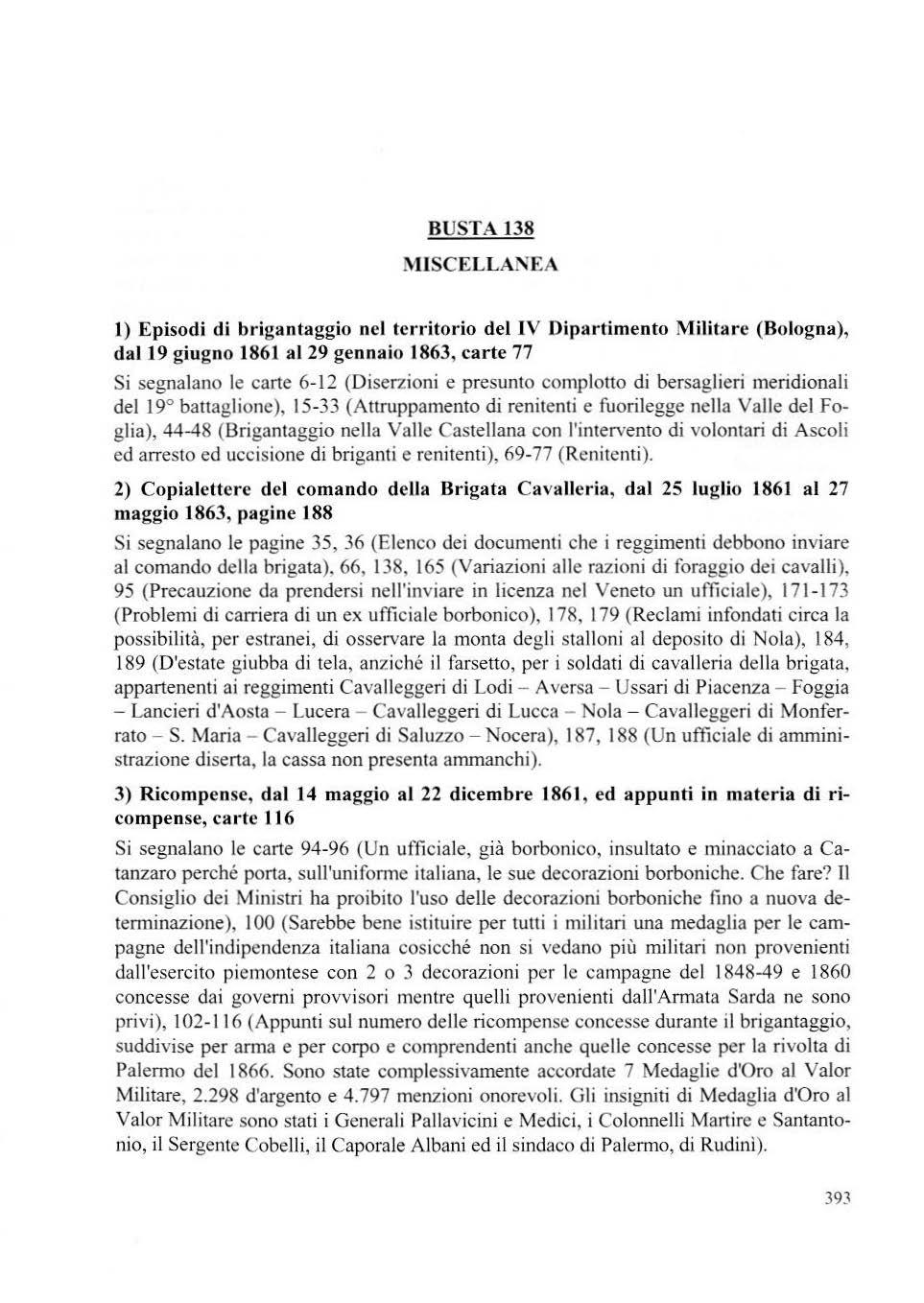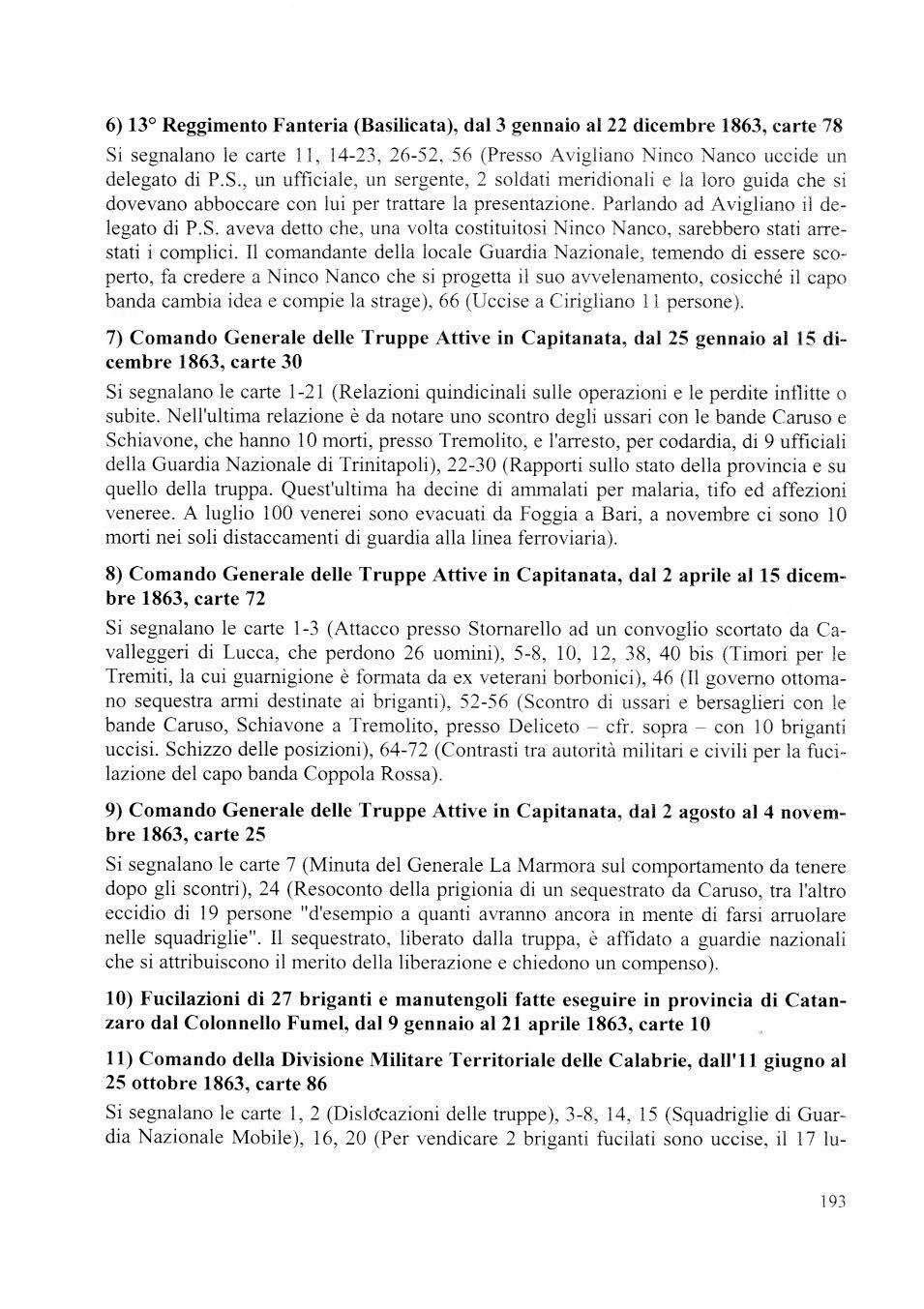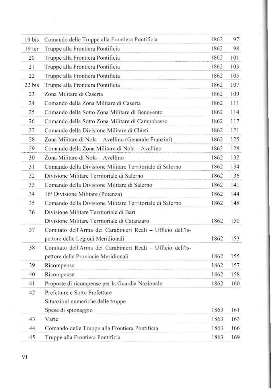 Tu tti questi aspetti sono stati tenuti, ovviamente, pre se nti a nche nella ampli ss ima sce lta dei documenti segna lati, pur se, naturalmente, qu esta scelta ha pun tato sop rattutto sui documenti operativi o su quelli diffici lmente riscontrabili in altri carteggi. Più che la sto ria dei corpi, comunque, s i è pri v il eg ia ta, nelle segnalazioni, la storia locale, che sembra ora incontrare il ma ssimo favo re per quanto a tt iene alle ricerche s ul brigantaggio, così da far opera meritoria presso gli studiosi e gli student i interessat i, ed a qu esto proposito risu lterà utilissimo l'indice dei no mi d elle loca lità acc luso al vo lume .