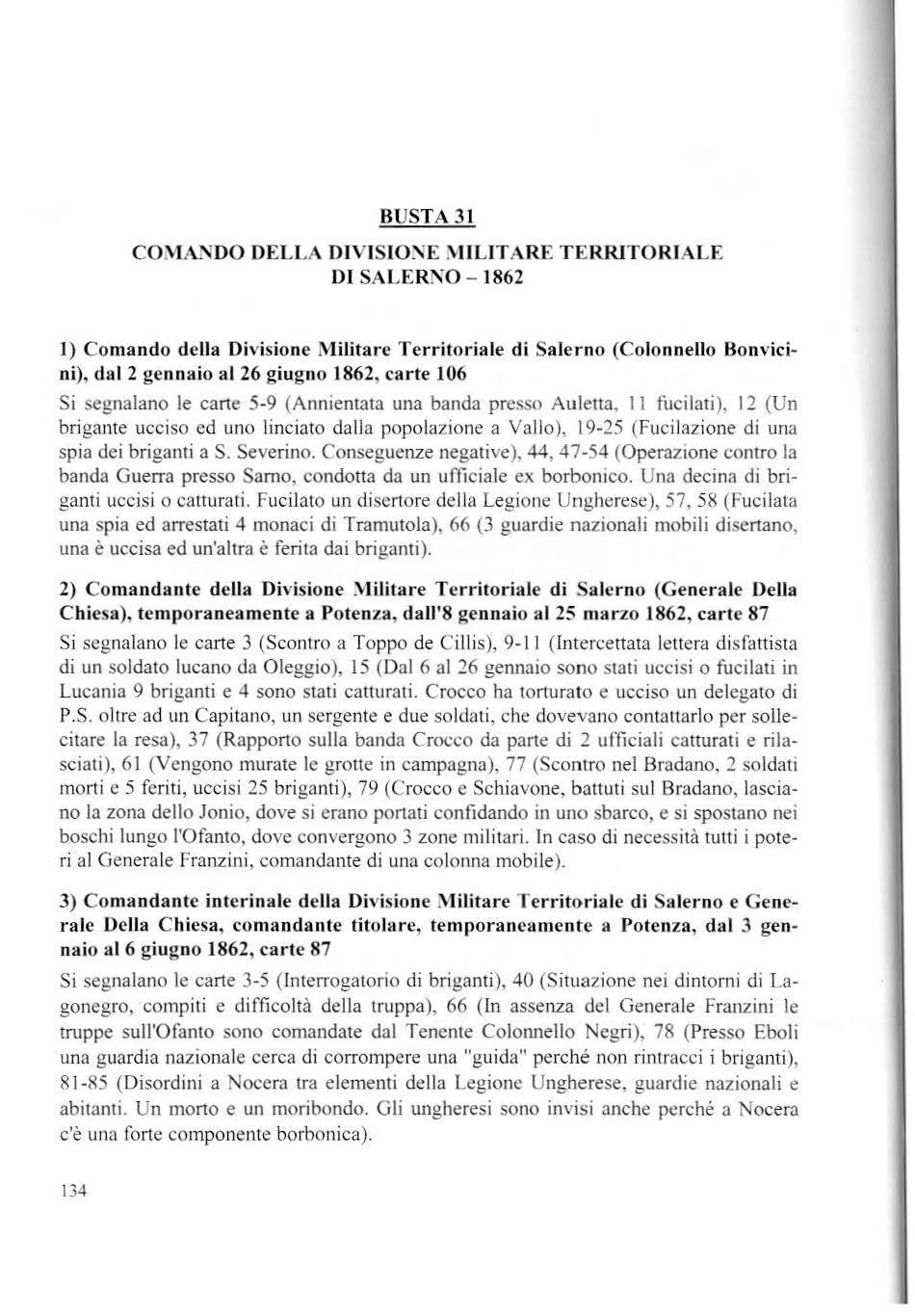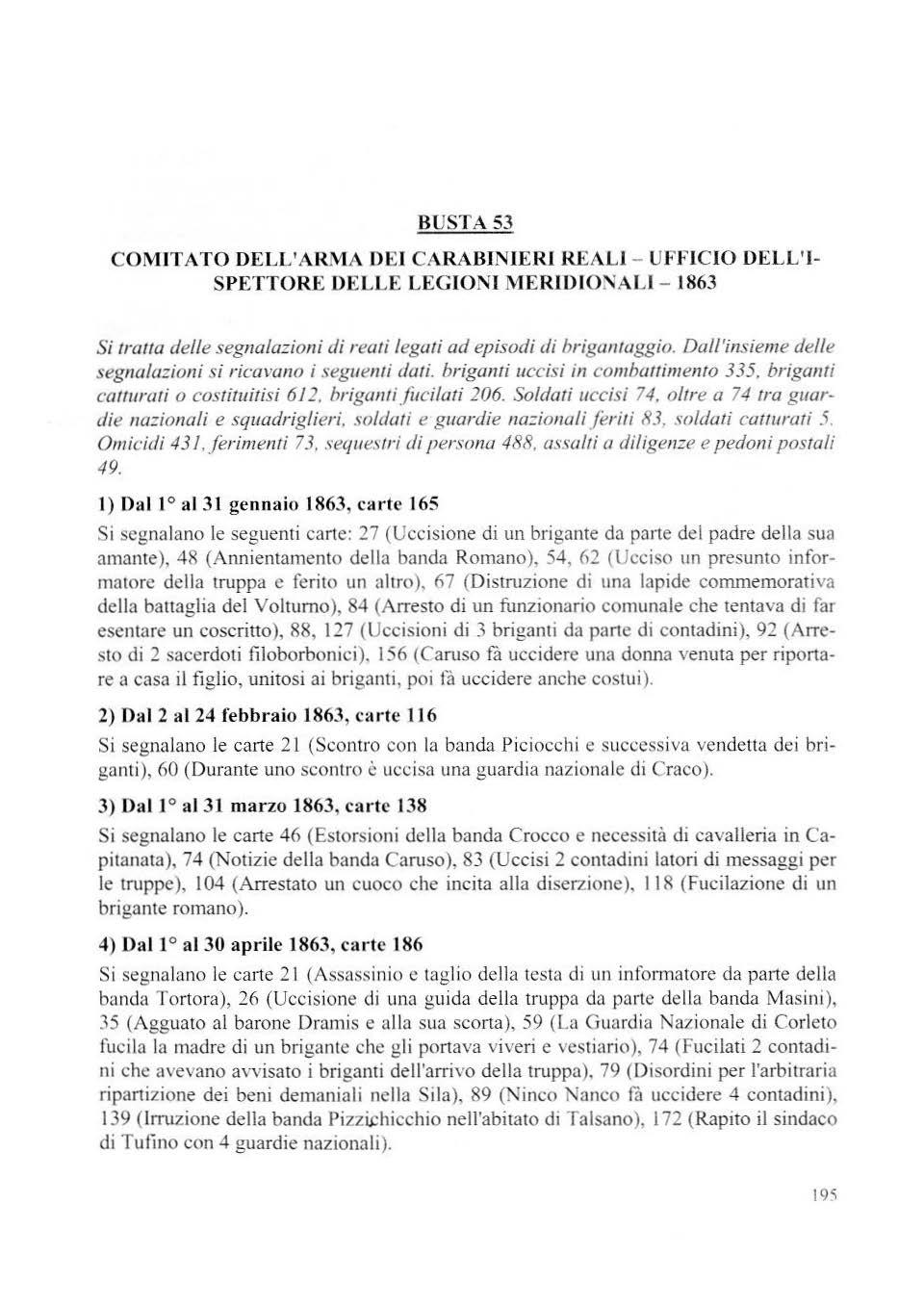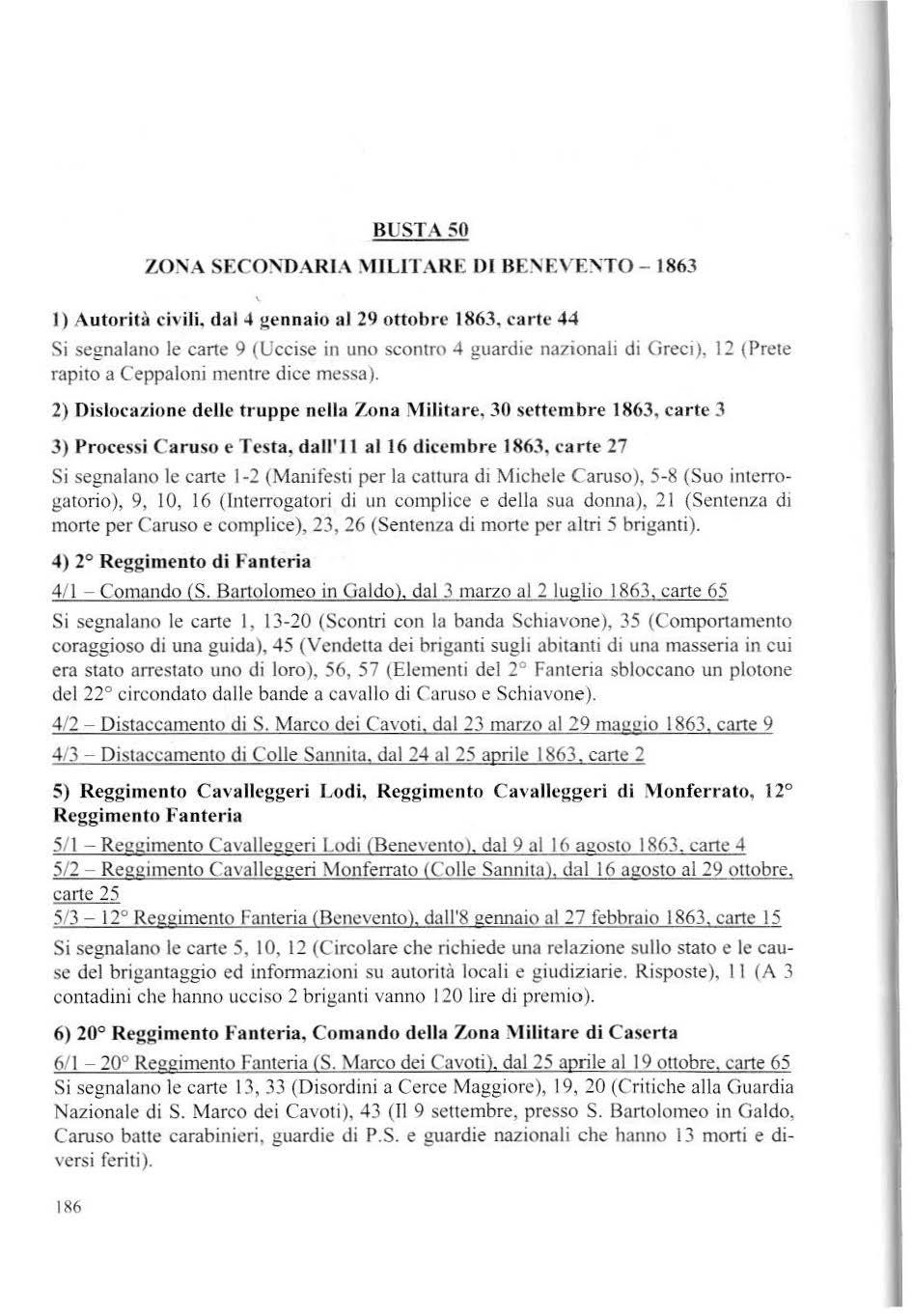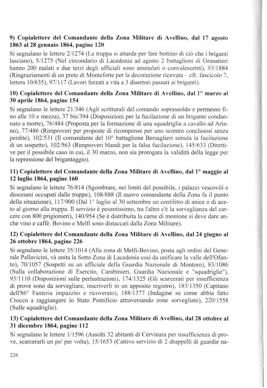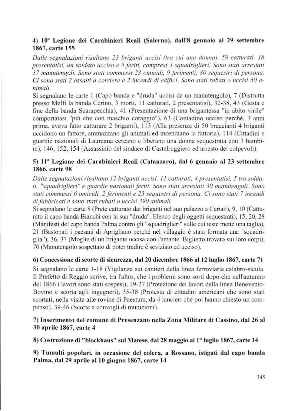 Tu tti questi aspetti sono stati tenuti, ovviamente, pre se nti a nche nella ampli ss ima sce lta dei documenti segna lati, pur se, naturalmente, qu esta scelta ha pun tato sop rattutto sui documenti operativi o su quelli diffici lmente riscontrabili in altri carteggi. Più che la sto ria dei corpi, comunque, s i è pri v il eg ia ta, nelle segnalazioni, la storia locale, che sembra ora incontrare il ma ssimo favo re per quanto a tt iene alle ricerche s ul brigantaggio, così da far opera meritoria presso gli studiosi e gli student i interessat i, ed a qu esto proposito risu lterà utilissimo l'indice dei no mi d elle loca lità acc luso al vo lume .