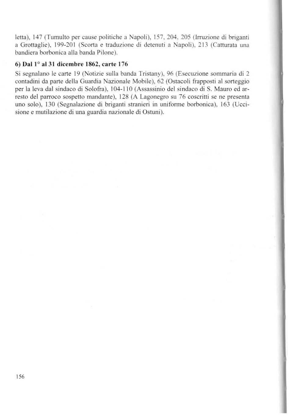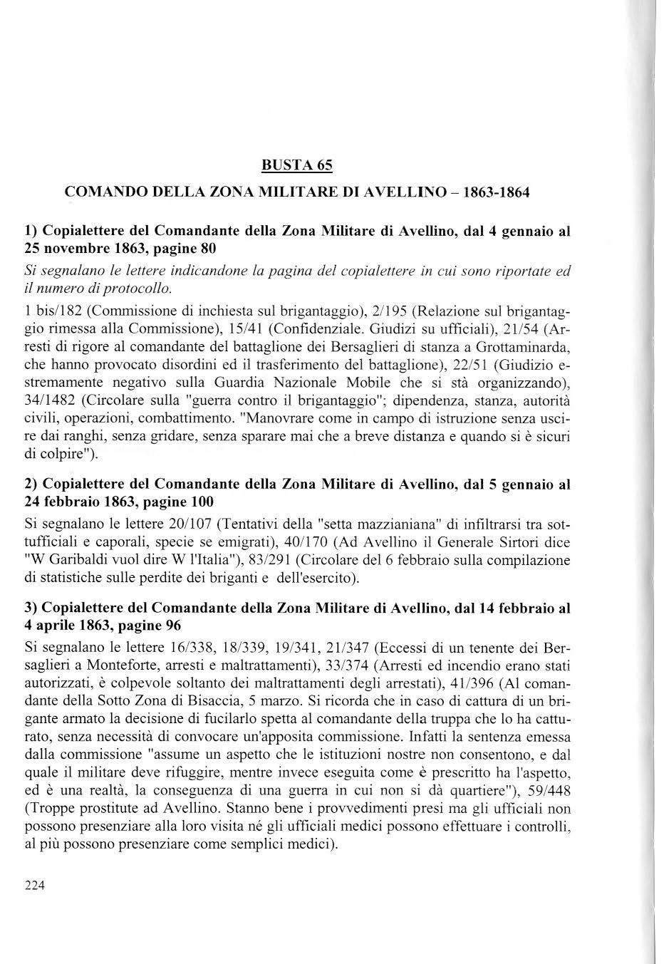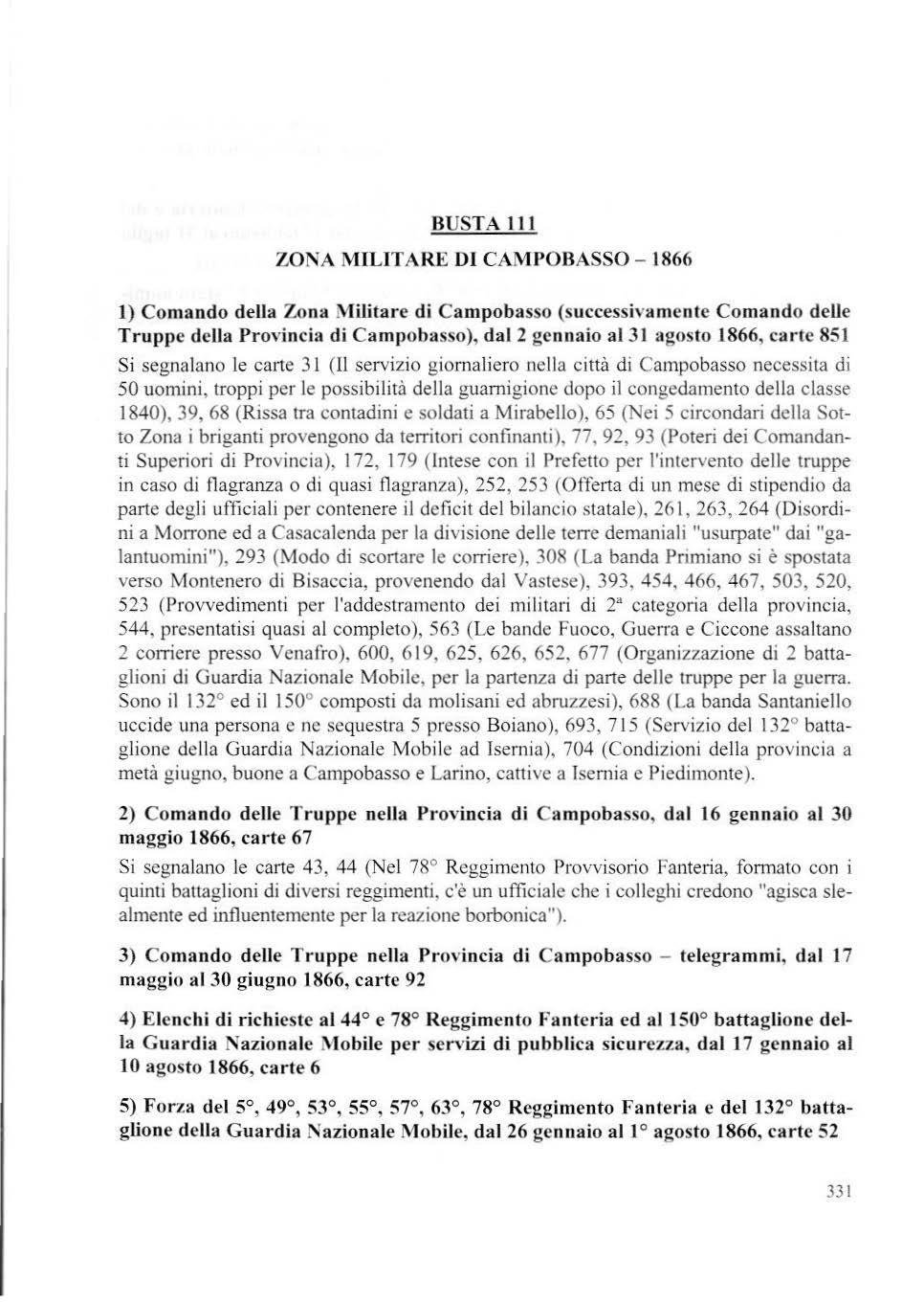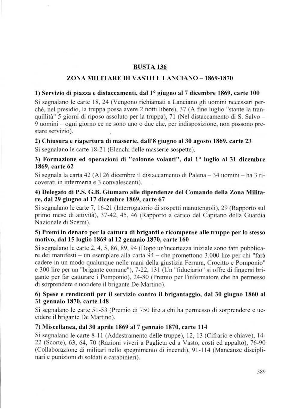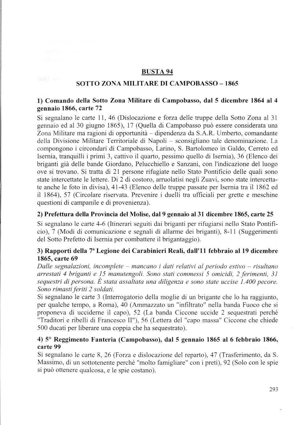 Tu tti questi aspetti sono stati tenuti, ovviamente, pre se nti a nche nella ampli ss ima sce lta dei documenti segna lati, pur se, naturalmente, qu esta scelta ha pun tato sop rattutto sui documenti operativi o su quelli diffici lmente riscontrabili in altri carteggi. Più che la sto ria dei corpi, comunque, s i è pri v il eg ia ta, nelle segnalazioni, la storia locale, che sembra ora incontrare il ma ssimo favo re per quanto a tt iene alle ricerche s ul brigantaggio, così da far opera meritoria presso gli studiosi e gli student i interessat i, ed a qu esto proposito risu lterà utilissimo l'indice dei no mi d elle loca lità acc luso al vo lume .