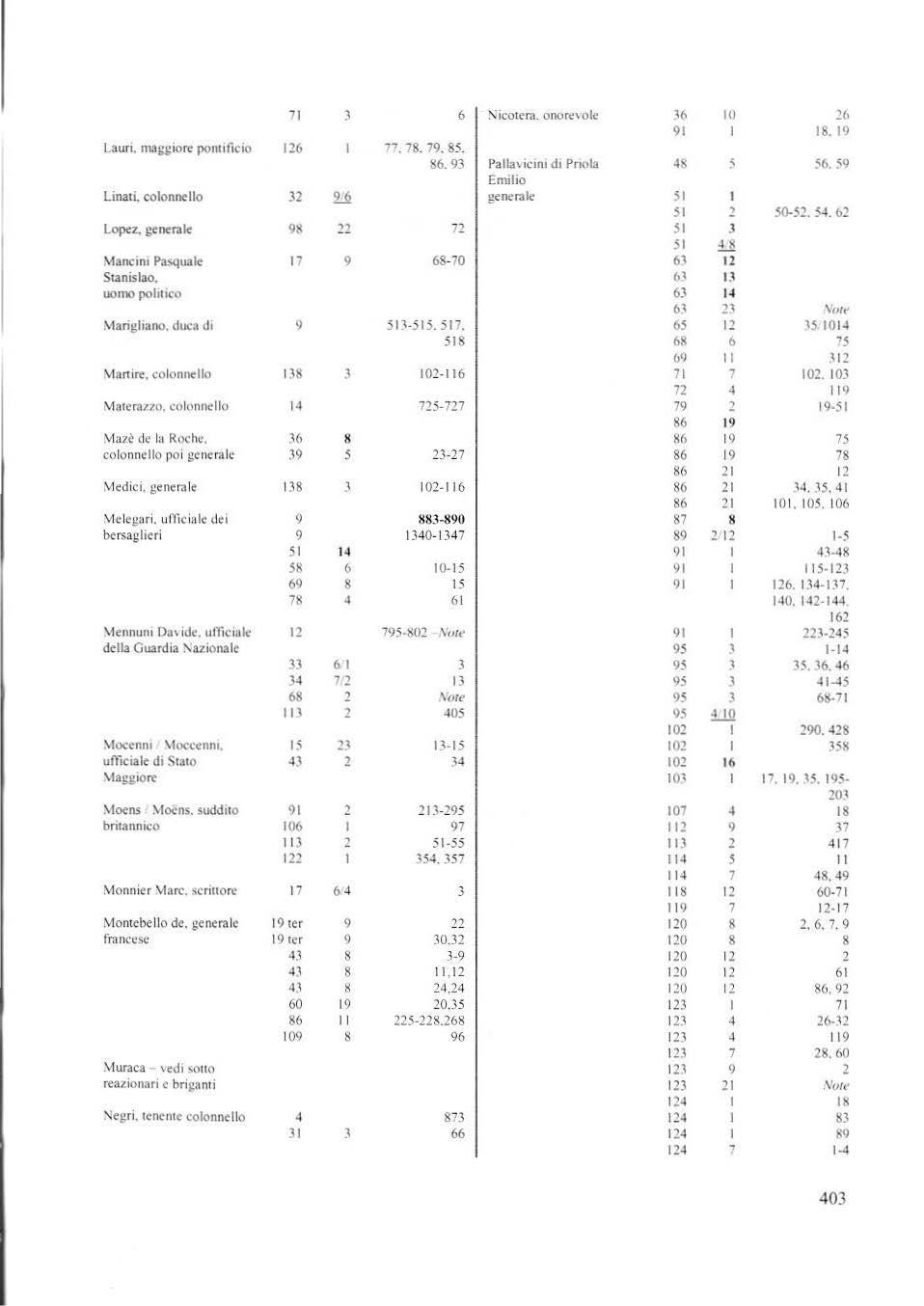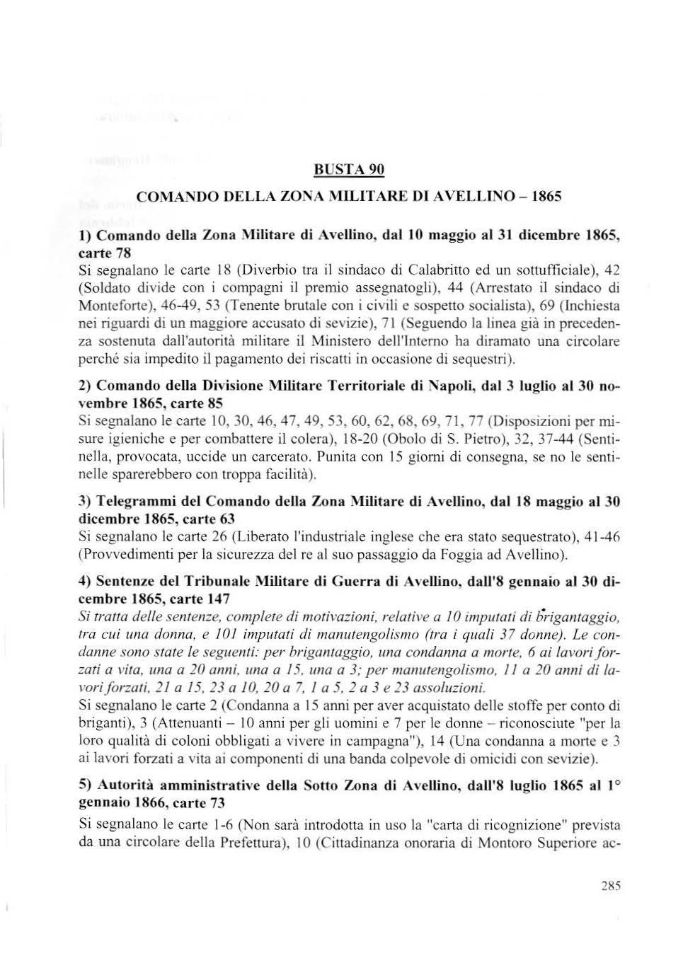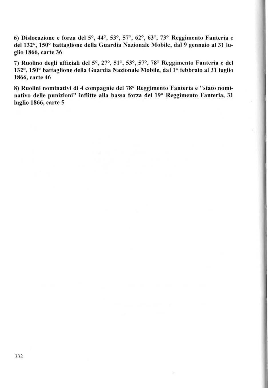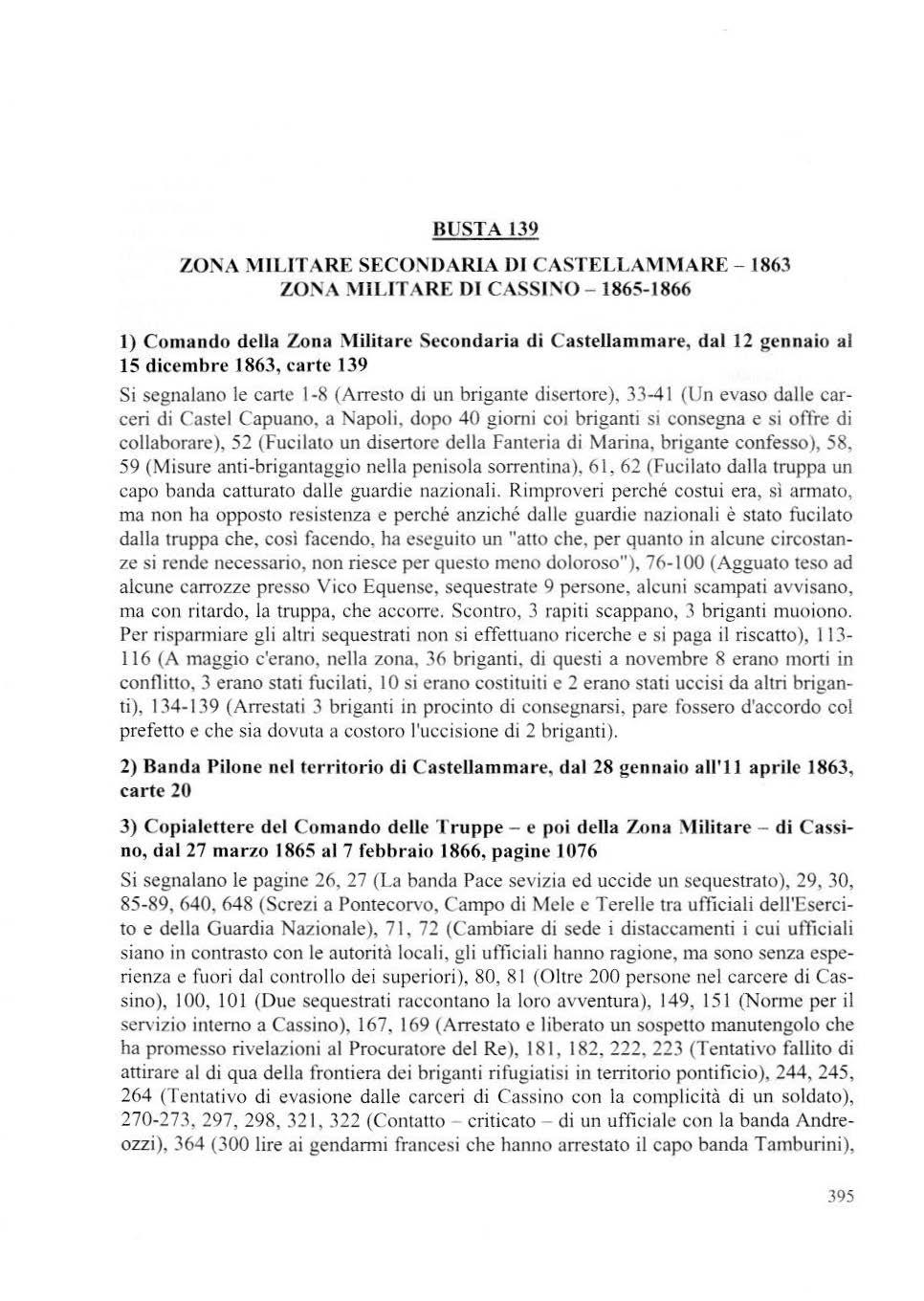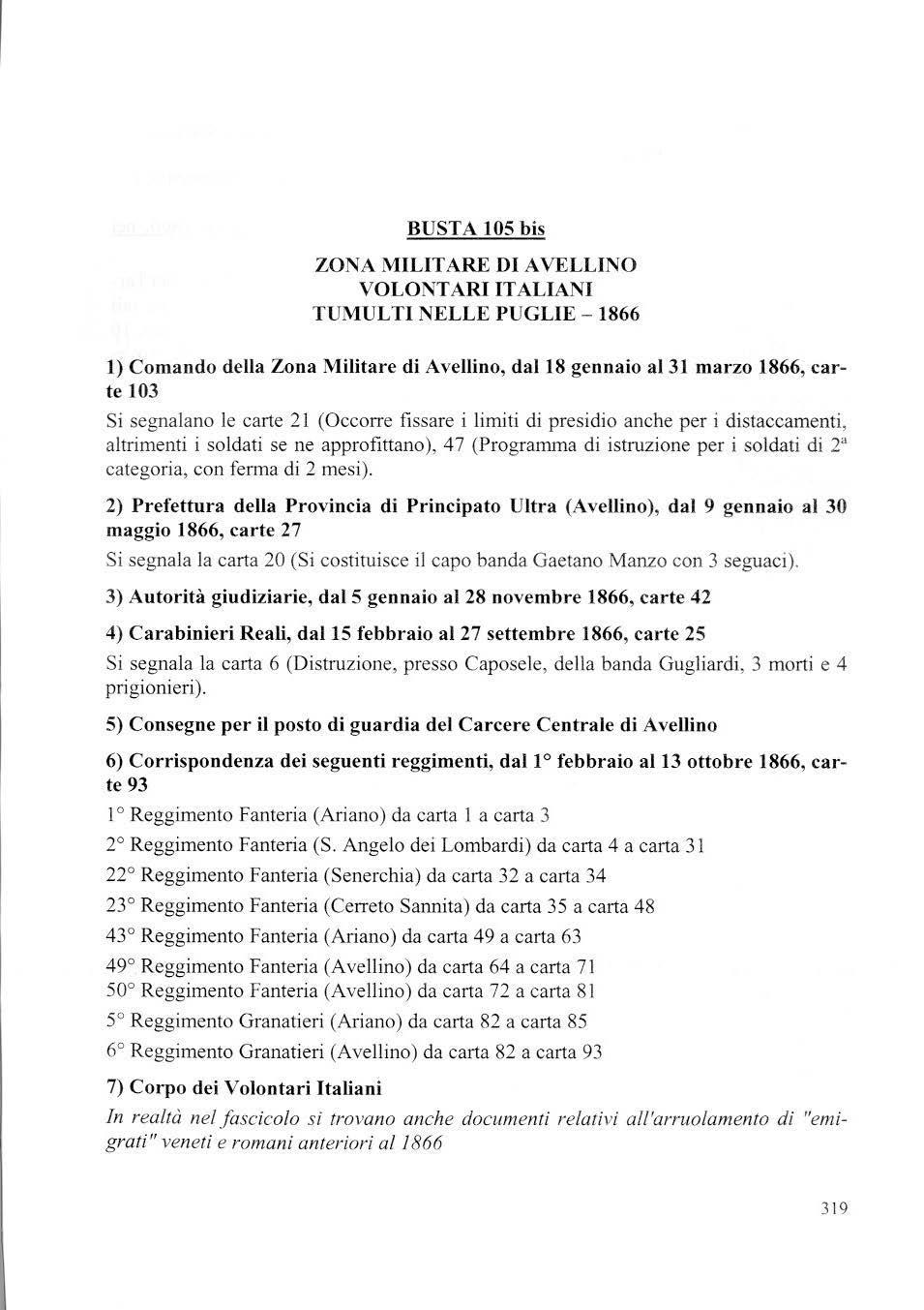 Tu tti questi aspetti sono stati tenuti, ovviamente, pre se nti a nche nella ampli ss ima sce lta dei documenti segna lati, pur se, naturalmente, qu esta scelta ha pun tato sop rattutto sui documenti operativi o su quelli diffici lmente riscontrabili in altri carteggi. Più che la sto ria dei corpi, comunque, s i è pri v il eg ia ta, nelle segnalazioni, la storia locale, che sembra ora incontrare il ma ssimo favo re per quanto a tt iene alle ricerche s ul brigantaggio, così da far opera meritoria presso gli studiosi e gli student i interessat i, ed a qu esto proposito risu lterà utilissimo l'indice dei no mi d elle loca lità acc luso al vo lume .