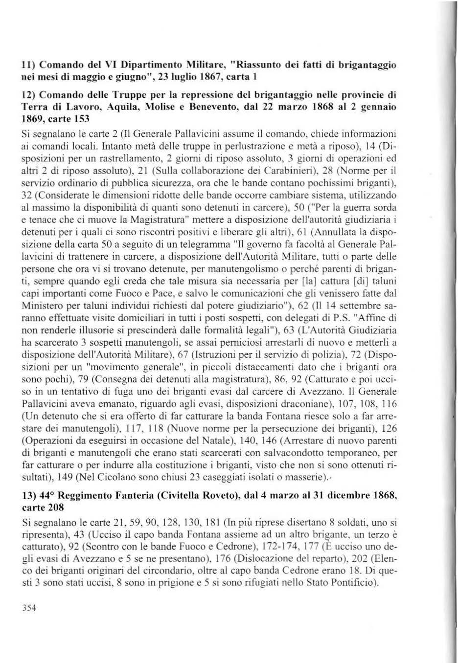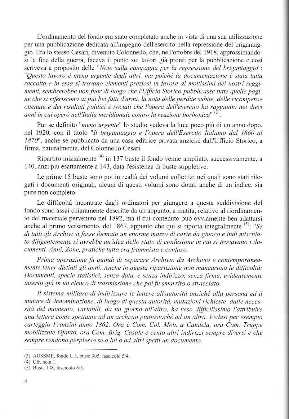 Condivi d e ndo la scelta del Colonnello Cesari. rin v iamo quindi il lettore al suo volume per un inquadrame nt o del brigantaggio dal punto di v ista della storia delle operazioni c, a d un diverso li vello , al lavoro del Gen eral e Tuccari " Memoria sui principali as pe tti tecnico -operat i v i d e ll a lotta a l brigantaggio dopo l'unità (1861 - 1870)" apparso in "S tudi Sto r ico M ili ta r i 19 84", pagg. 203 -270 . Lavoro c h e si è basato, s oprattutto, sui rapporti period ic i - qu ind ici n ali o me n s i li - relat i v i alle ope raz ioni condotte con tro il b ri g antaggio ne lle di ve rse zo ne , rapporti che si ris contran o co n frequenza n e ll e carte del fondo e che, nel complesso, po sso no fornire una buona base di partenza per una futura storia del brigantaggio.