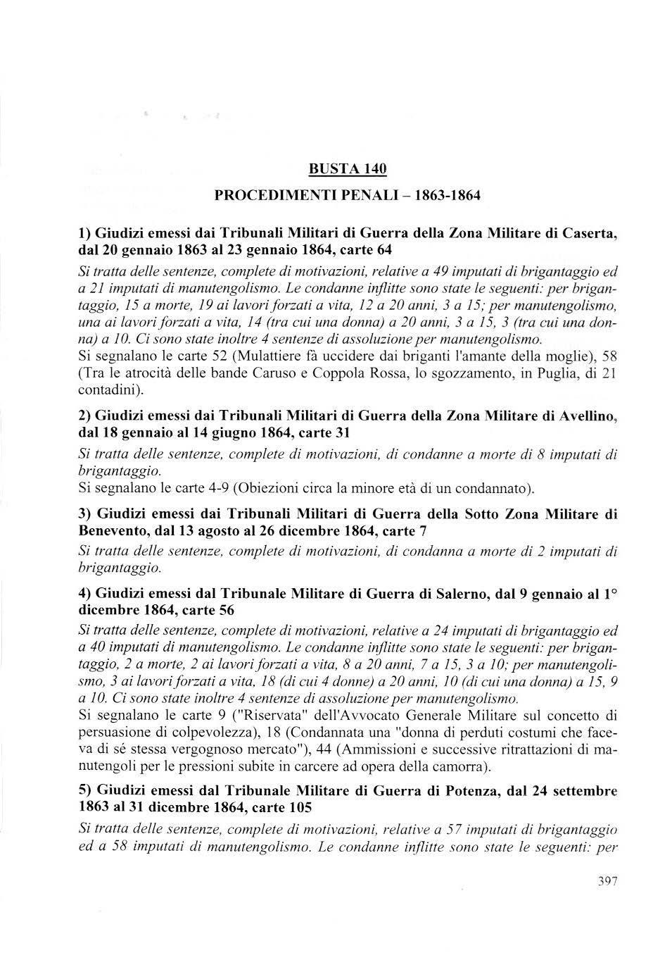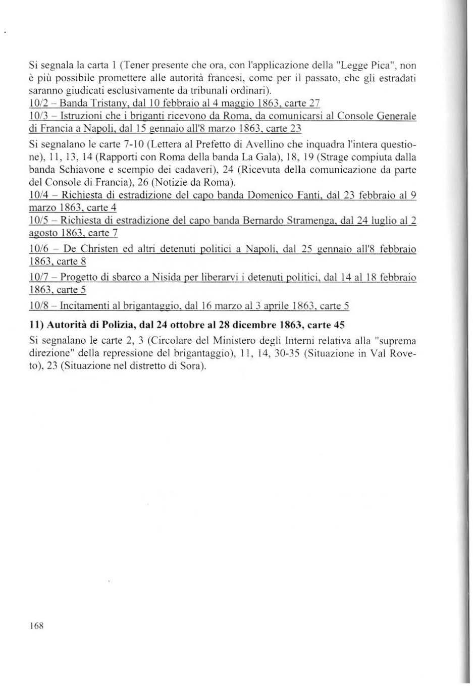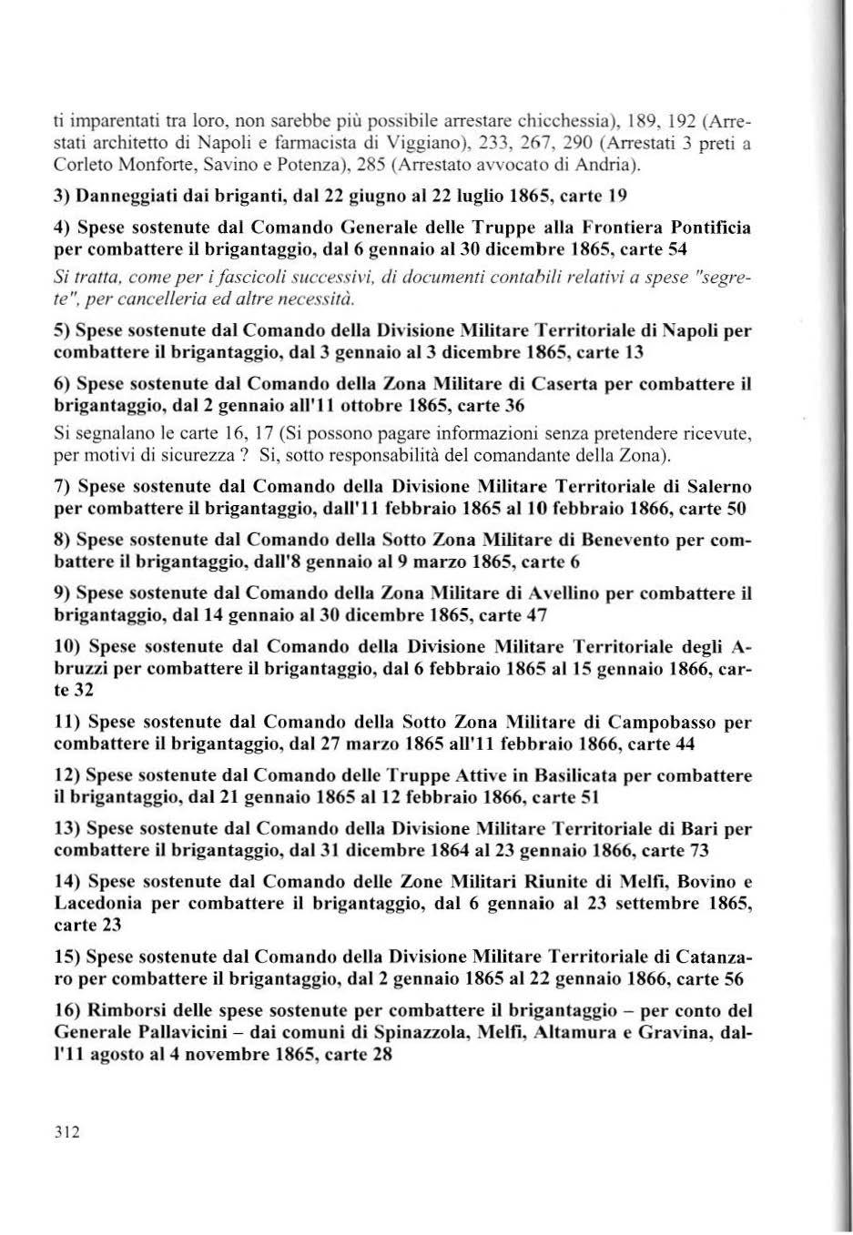 U n'u ltima annotaz ione r ig uardo alle fonti su ll a s toria de l br iga ntaggi o es istent i p resso l'archivio dell'Ufficio Storico dello Stato Ma gg iore dell' Ese rcito: oltre che. ovviamente, nel fondo in questione, carte relative al brigantaggio, pecie a quello del periodo iniziale, possono essere rintracciate nei fondi "Campagna del 1860-1861 ", "Carteg gio del Ge n e rale Cia ldini" , "Carteggio co nfid enz iale d ei Ministri d ella G ue rra" , "Dipartimenti Milit a ri" e "Guardia az ionale".
