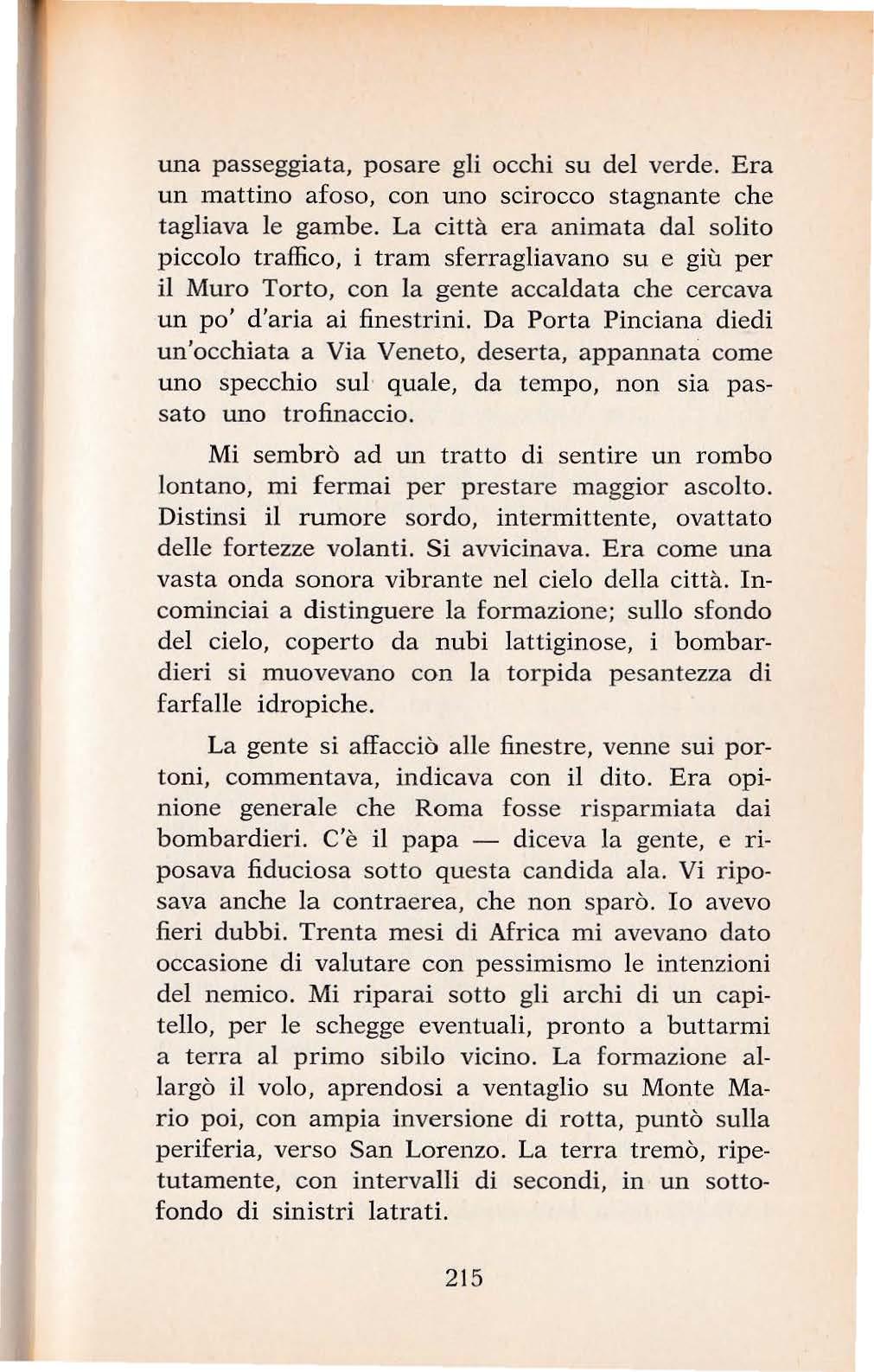 La gente si affacciò alle finestre, venne sui portoni, commentava, indicava con il dito. Era opinione generale che Roma fosse risparmiata dai bombardieri. C'è il papa - diceva la gente, e r iposava fiduciosa sotto questa candida a la . Vi riposava anche la contraerea, che non sparò. Io avevo fieri dubbi. Trenta mesi di Africa mi avevano dato occasione di valutare con pessimismo le intenzioni del nemico. Mi riparai sotto gli archi di un capitello, per le schegge eventuali, pronto a buttarmi a terra al primo sibilo vicino. La formazione allargò il volo, aprendosi a ventaglio su Monte Mario poi, con ampia inversione di rotta, puntò su lla periferia, verso San Lorenzo. La t erra tremò, ripetutamente, con intervalli di secondi, in un sottofondo di sinistri latrati.