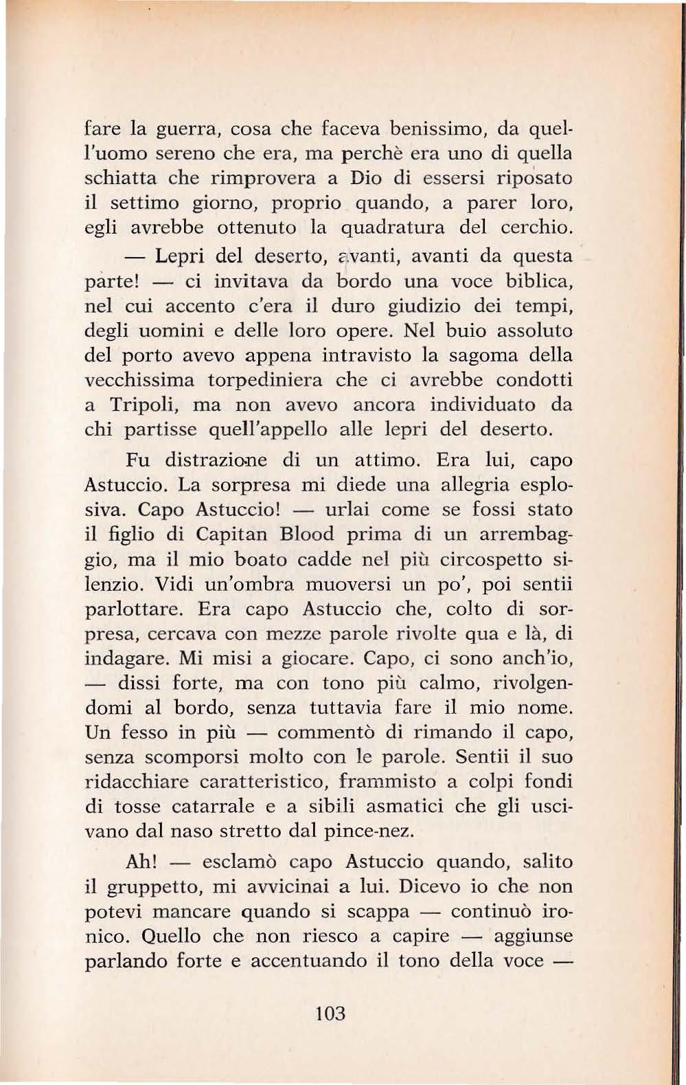 Non avevo mai percorso il Cana l Grande con quella lentezza. La lancia andava piano, scoppiettava, si infilava prudente fra le imbarcazioni car ich e di derrate. La mattinata era fresca, trasparente. L'aria sfiorava leggera la pelle, s i provava wia se nsazione d i risveglio sereno, di buoni pens ieri. Non conoscevo i ragazzi che partivano, ma erano miei amici, mi erano cari , aveva no dormito con me nelle camerate, mangiato nello stesso refettorio, con qualcuno di loro avevo parlato. Erano giovani come me, teneri, vulnerabili, con la testa piena ancora delle cose sempli c i dei loro paesi di Toscana, di Liguria, de l Veneto, della Lombardia. Soffrivano della mamma, d ell a casa, d e lla fidanza ta, della loro squ a dra di calc io. Non sapevano ancor nulla del mare, della Marmarica, degli abissi , del cielo solcato dal fuoco, della prigionia. La loro bocca non aveva pieghe, i loro occhi non conoscevano ch e lo stupore d ell'inn ocenza.
