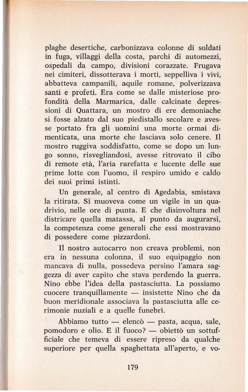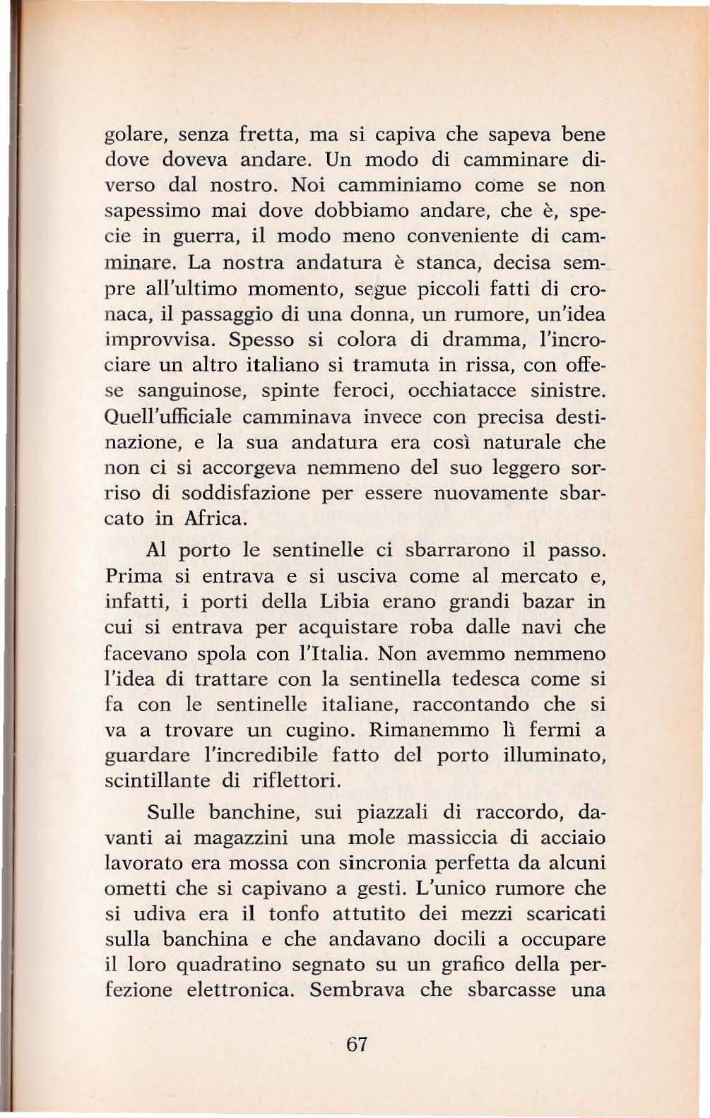 L'altoparlante sca ndì ripe tu tam ente il m io nome. Era appena suon a t a l a sveglia. Mi precipitai giù dalla cam erata mezzo nudo. Lungo l e scale mi infil a i parte d e ll a divisa . Bussai trafelato allo Ufficio movimen to, che continuava a chi a marmi con l' a lt opa rl ante. C'era un sottocapo . G li dissi il mio nome. Bene - mi rispose - Tripoli. Trip oli ch e? - dissi io che avevo capito ma ch e volevo senti rmelo ripetere. Vai a Trip oli -t agliò corto il sottocapo - volontario - aggiunse , e timbrò forte u n fog lio. Salii in camerata . Vol evo scriver e a casa. Sarei p art ito l a sera stessa, con un a t radotta per il Sud. Volevo scrivere anch e il mio testamento spirituale, poi pensai che era m eglio smetterla di pe nsarla così in a lto , ma la tentazione era forte e ci provai. Ne uscì un pachid erma. Forse per la p r ima volta s fiorai la sensaz ione fastidiosa de ll a retorica . Avevo scritto un polpettone gonfio di paro le, e me ne resi conto. Il fascismo in prov in cia lo sa lvava no l a buona tavol a e i vini tipici. Quante vo l te a t avo la c i s iamo sb arazzati della sah ariana d'orbace? Allora tutto prendeva proporzioni più vere, e il fe d era le di Mantova diventava automatica mente un ere-