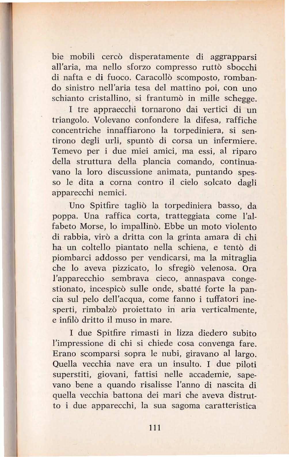 Il convoglio s ubiva l'attacco di dodici aerosiluranti. Non badai al sergente, avrei disubbidito anche a l comandante pur di non perdere quello spettacolo. Io naturalmente non sapevo degli aerosiluranti, perchè non si vedevano n è se avessi visto apparecchi a vrei capito ch e erano aerosiluranti; a llora non distin g uevo quas i nulla d ell e a rmi da guerra, t ranne che erano navi, cannoni, ecc. C'era chi gridava fra gli scoppi della battag li a. « Aerei, navi, la flotta », ma non si capiva altro. Eppoi, quale flotta, la nostra o la loro? E quegli apparecchi che ora si vedevano sfrecciare r apidi attorno a noi, e sopra
