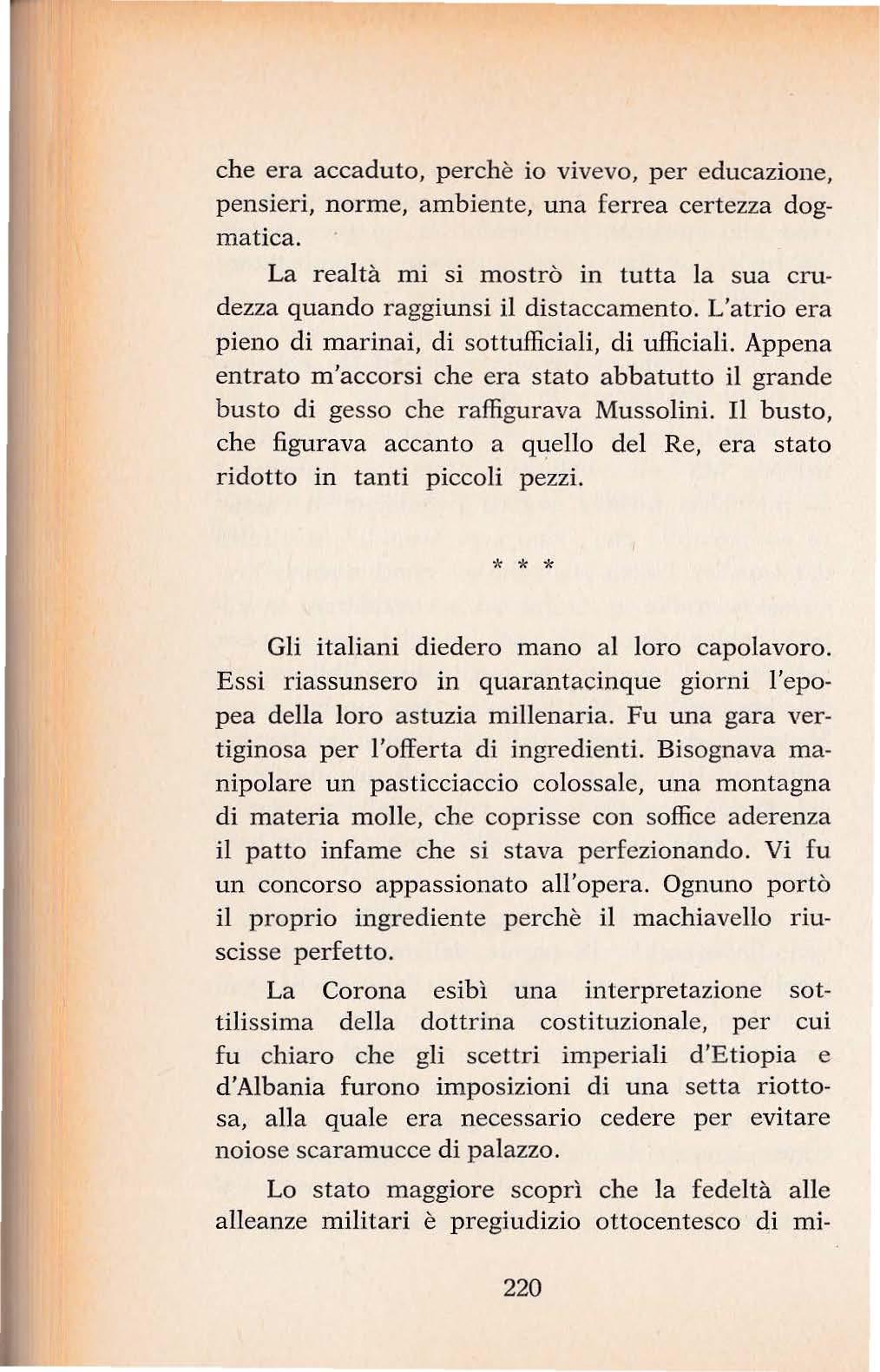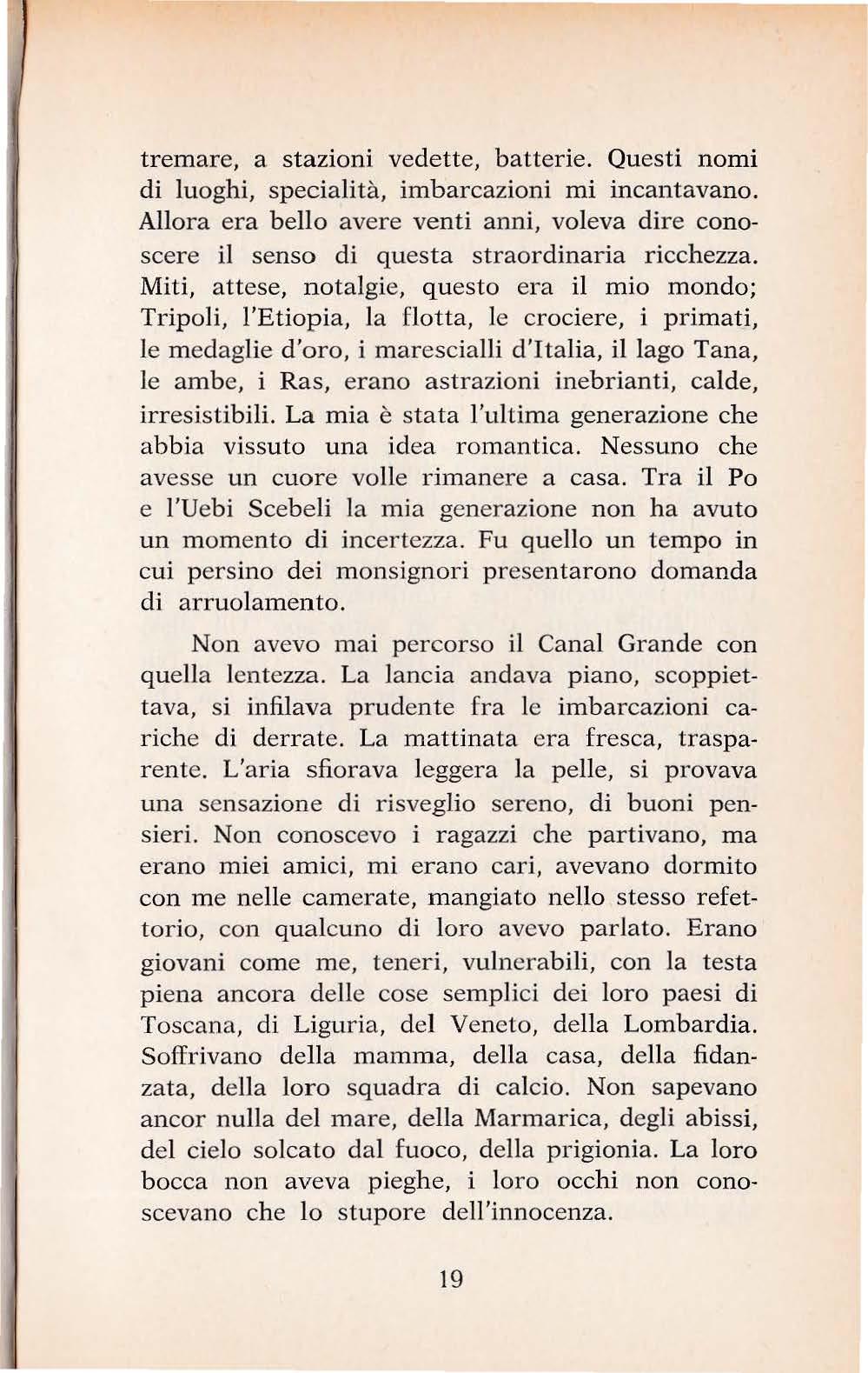 tremare, a stazioni vedette, batterie. Ques ti nom i di luoghi, specialità, imbarcazioni mi incantavano. Allora era bello avere venti anni, voleva dire conoscere il senso di questa strao rdinari a ricchezza. Miti, attese, notalgie, questo era il mio mondo; Tripoli, l'Etiopia, la flotta, le crociere, i primati, le medaglie d'oro, i marescialli d'Ita lia , il lago Tana, le ambe, i Ras, erano astrazion i inebrianti, calde, irresistibili. La mia è stata l'ultima generazione che abb ia v iss uto una idea romantica. Nessun o che avesse un cuore volle rimanere a casa. Tra il Po e l 'Uebi Scebeli la mia generaz ione non ha avuto un momento di i ncertezza. Fu quell o un tempo in cui pers ino dei mon signori presentarono domanda di arruolamento.
