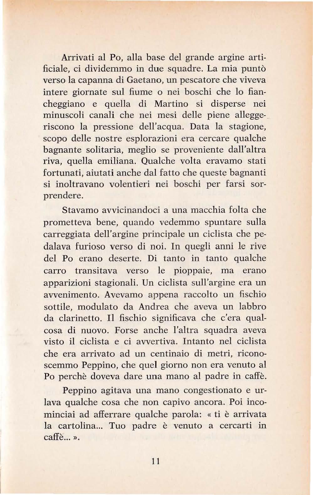 Stavamo avvicinandoci a una macchia folta che prometteva bene, qu ando vedemmo spuntare sull a carreggiata dell'a rgin e principale un ciclista che pedalava furioso verso di noi. In quegli anni l e rive d e l Po erano d eser te . Di tanto in tanto qualche carro transitava verso le pioppaie, ma erano apparizioni stagionali. Un cicl ista s ull'arg ine e ra un avvenimento. Avevamo app ena r acco lto un fischio so ttile, modulato da Andrea c he aveva un labbro da clarinetto. Il fis chio sign ificava che c'era qua lcosa di nuovo. Forse anche l'altra squadra aveva visto il ciclist a e ci avvertiva . Intanto nel ciclista che era arrivato ad un centinaio di metri, riconoscemmo Peppino, c he que l giorno non era venuto al Po perch è doveva dare una mano a l padre in caffè. Peppino agitava una m ano congest ionato e urlava qualche cosa che non capivo ancora. Poi incominciai ad afferrare qualche parola: « ti è arrivata la cartolina. .. Tuo padre è venuto a cercarti in caffè ... ».