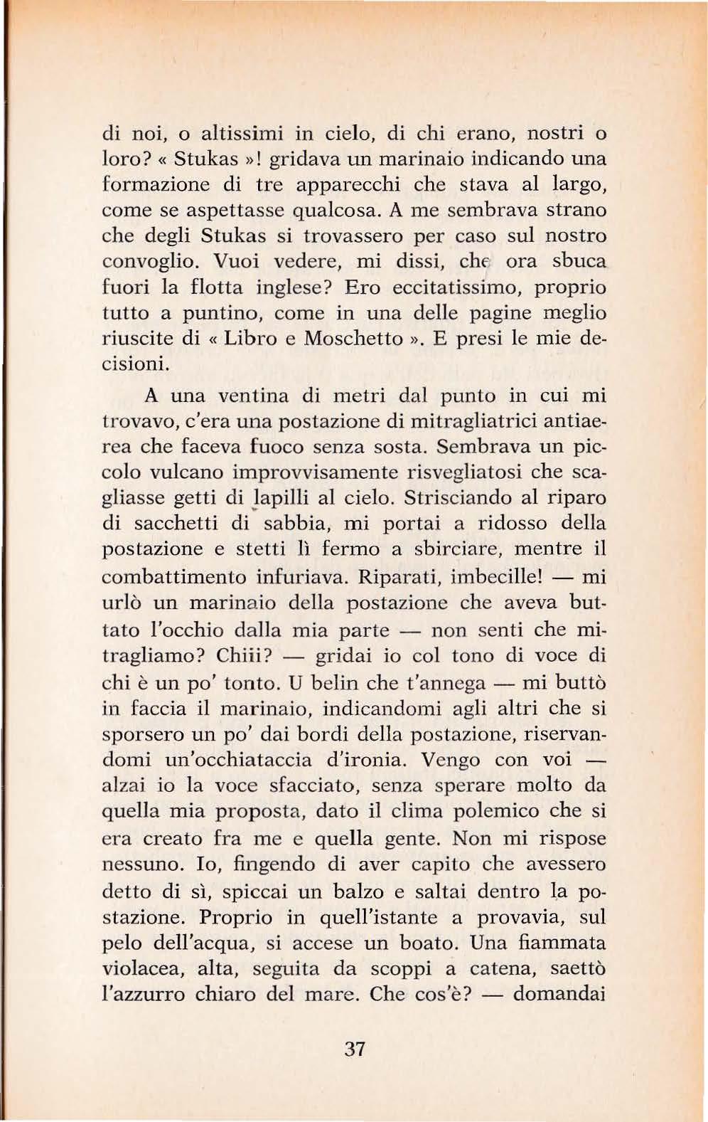A una ventina di m e tri da l p u nto in c ui mi trovavo, c'era u na postazione di mitragliatrici antiaerea che faceva fuoco senza sosta. Semb rava un piccol o v ulcano improvvisam ente risvegli atosi ch e scagl iasse getti di l apilli a l c ie lo. Stri sc ia ndo a l riparo di sacch e tti di · sa bbia, mi portai a rid oss o d e lla p ostazione e stetti lì fer m o a sbir ciare, men tre il combattimento infuriava. Ripara ti , imb ecille! - mi urlò un m arin a io d ell a postazione che aveva buttato l'occh io dalla mia parte - non senti che mitragli amo? Chi ii ? - g ridai io col tono di voce di c hi è un po' tonto. U b e lin che t'annega - mi b u ttò in faccia il marina io , indicando mi agli a ltri che si s porsero un po' dai bordi della p ostazione, riservandomi un'o cchi ataccia d'ironia. Vengo con voia lzai io la voce sfacc ia to , senza sperare molto da quell a mia proposta, dato il clima polemico che s i era creato fra m e e quella gente. No n mi rispose nessuno. Io, finge ndo di aver ca pito che avessero detto di sì , spicca i un balzo e sa lta i d en tro I.a pos tazione. Proprio in quell'i stante a provavia, sul pelo dell'acqua, s i accese un boato . Una fi ammata violacea, a lta, segu ita da scoppi a catena, saettò l'azzurro chiaro de l m a r e. Che cos'è? - domandai