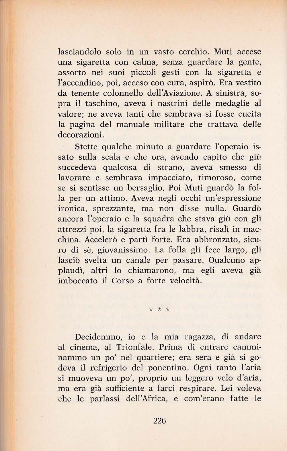 la sciandolo solo in un vasto cerchio. Muti accese una sigaretta con calma, senza guardare la gente, assorto nei suoi piccoli gesti con la sigaretta e l'accendino, poi, acceso con cura, asp irò. Era vestito da tenent e colonnello dell 'Aviazione. A sinistra, sopra il t asch ino, aveva i n astrini delle medaglie al valore; ne aveva tanti che sembrava si fosse cucita la pagina del manuale militare ch e trattava delle decorazioni.
