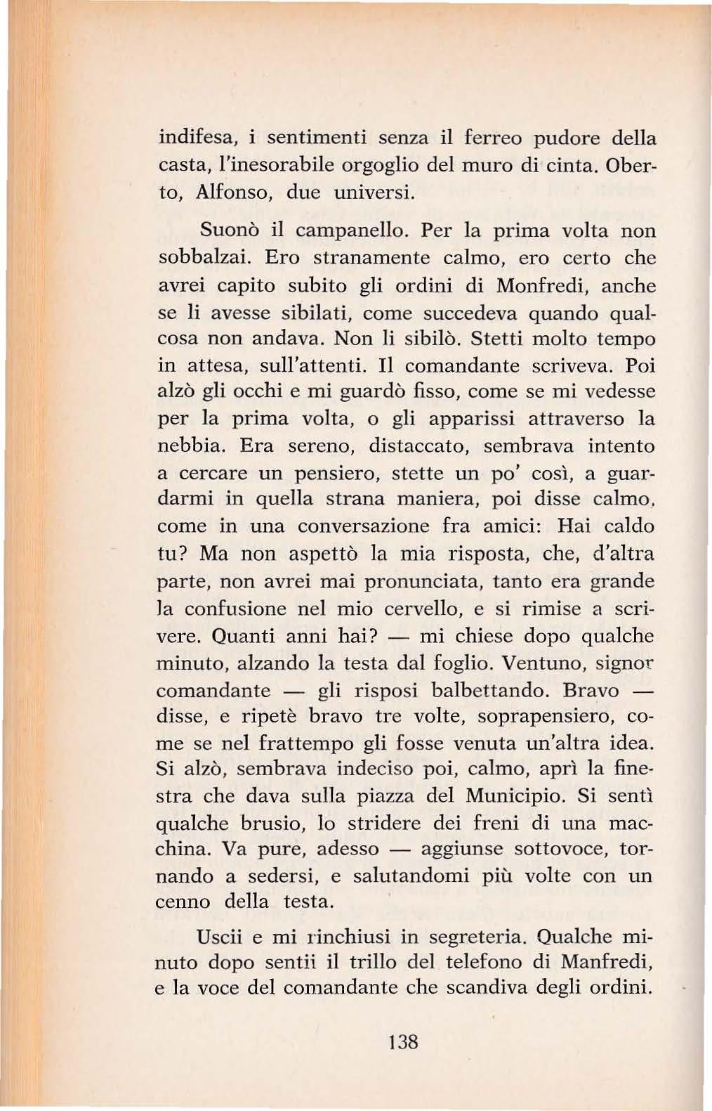 Cioè, è finita - dissi io. Vuoi dire che incomincia - mi rispose il colonnello. Era come temevo - commentò sarcastico - l'armistizio diventa un atto contro i tedeschi che se la prenderanno con i nostri soldati. Figuriamoci - disse con voce forte, agitando le mani come a scacciare una presenza sgrad ita -i tedeschi, i fascisti, scommetto che risputa Mussolini. Già... già ... - esclamò con un tono allusivo, un po' sorpreso, come s e g li fosse venuto in testa un'idea strana , improvvisa - è la tua ora, altro che storie, tornano, tornate - adesso d eclamava, si era f erm ato, eravamo quasi arrivati davanti al nostro ufficio - torna tutto come prima anzi, peggio. E si rimise a cam-