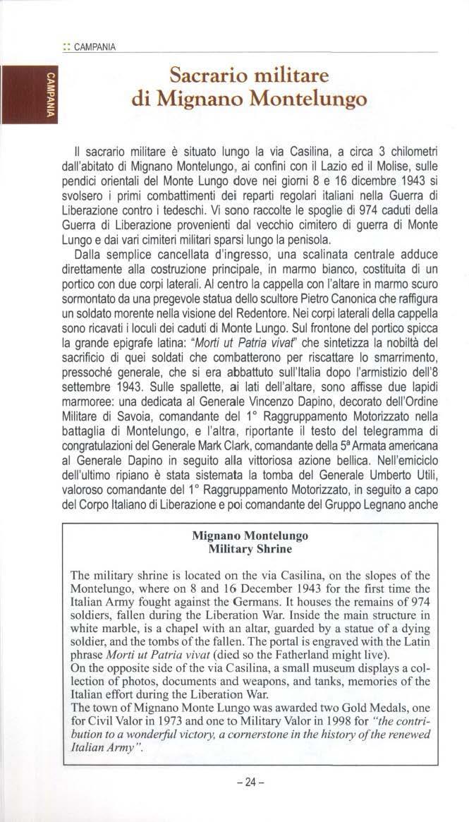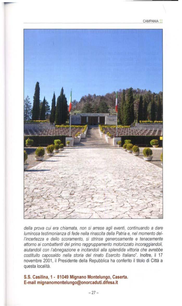 The town of Mignano Monte Lungo was awarded two Gold Medals , one for Cìv il Yalor in 1973 and one to Milìtary Va lor in 1998 for "the contribution to a wonderful victory. a cornerstone in the hist01y ofthe renewed lta/ian Am1y